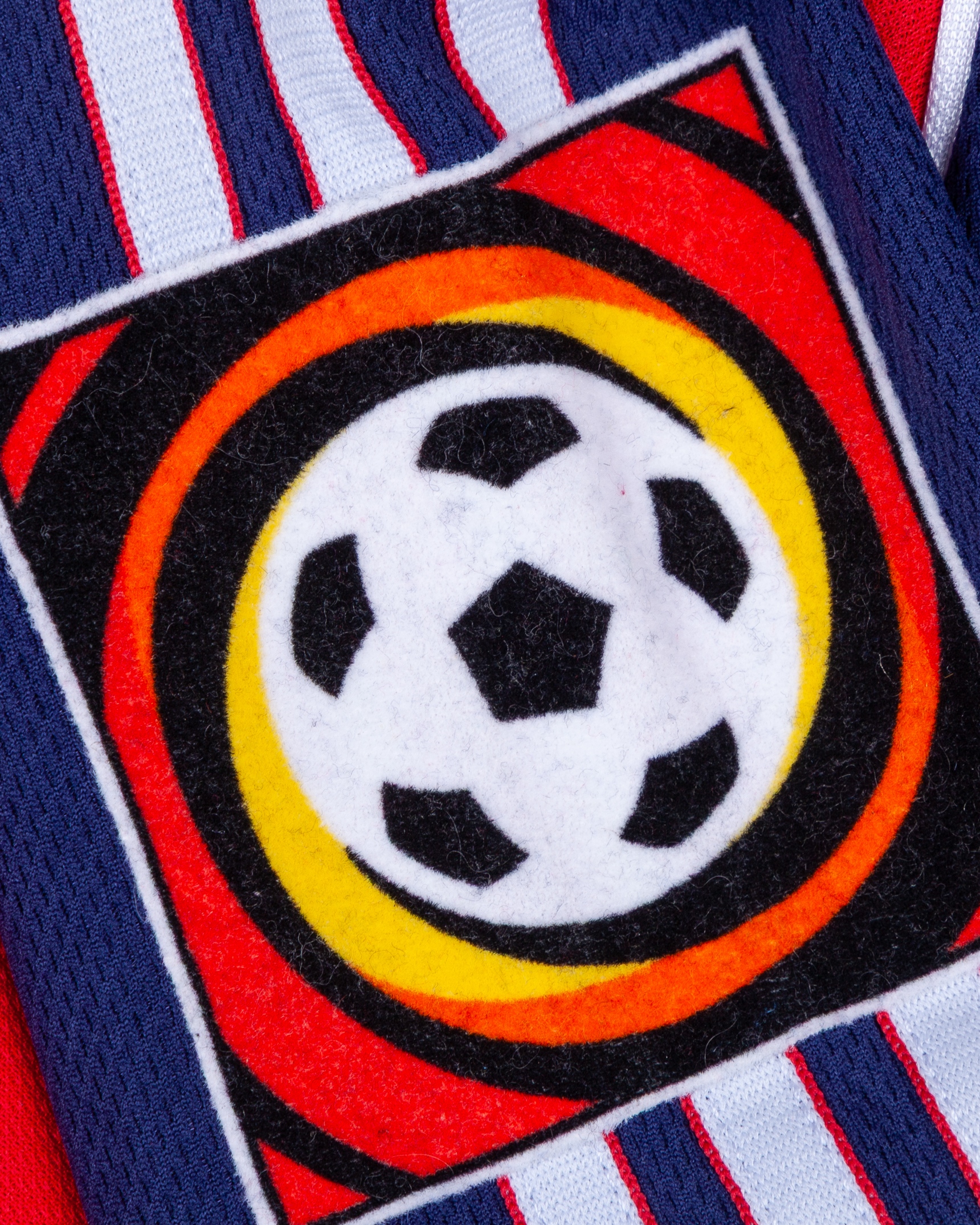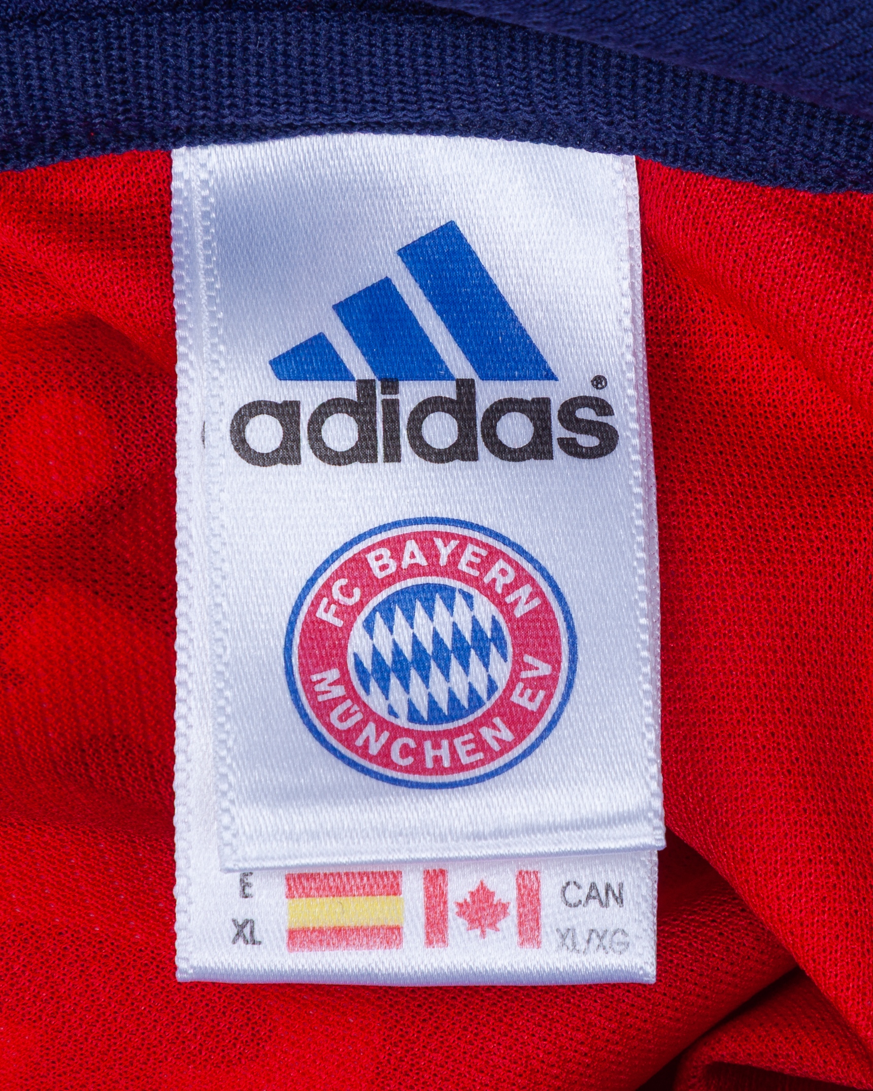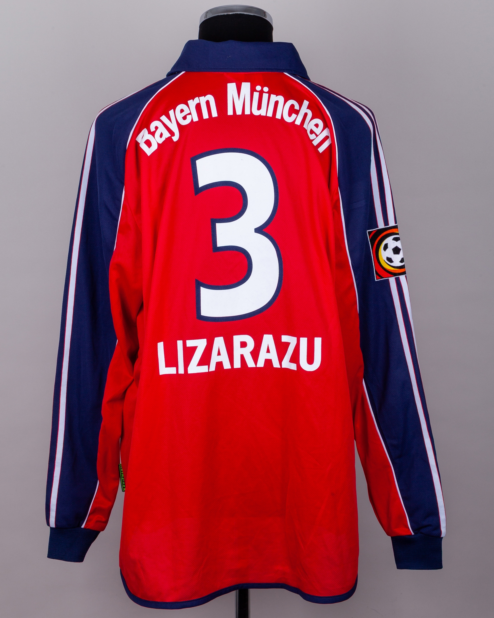 Bixente Lizarazu red and blue No.3 Bayern Munich v. Energie Cottbus long-sleeved shirt, 1999-2001, Adidas, XL, with v-neck collar and embroidered cloth badge inscribed FC BAYERN MUNCHEN EV, the reverse lettered LIZARAZU, the right sleeve with Bundesliga flash, with letter of provenance