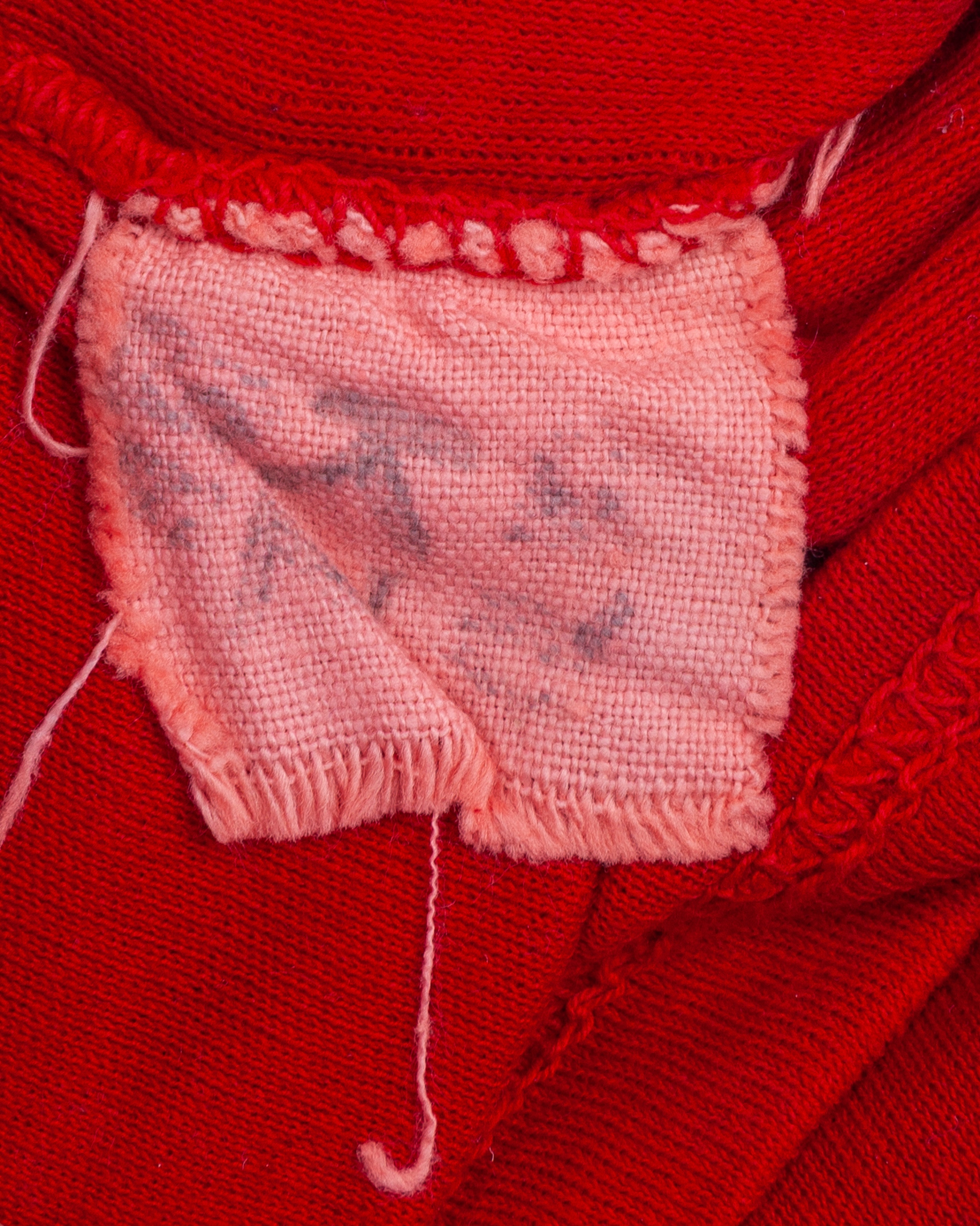 Petro Ruci red and black No.2 Albania v. Northern Ireland long-sleeved shirt, 1983, with crew-neck collar and embroidered cloth badge, the badge lightly sewn on, with staining