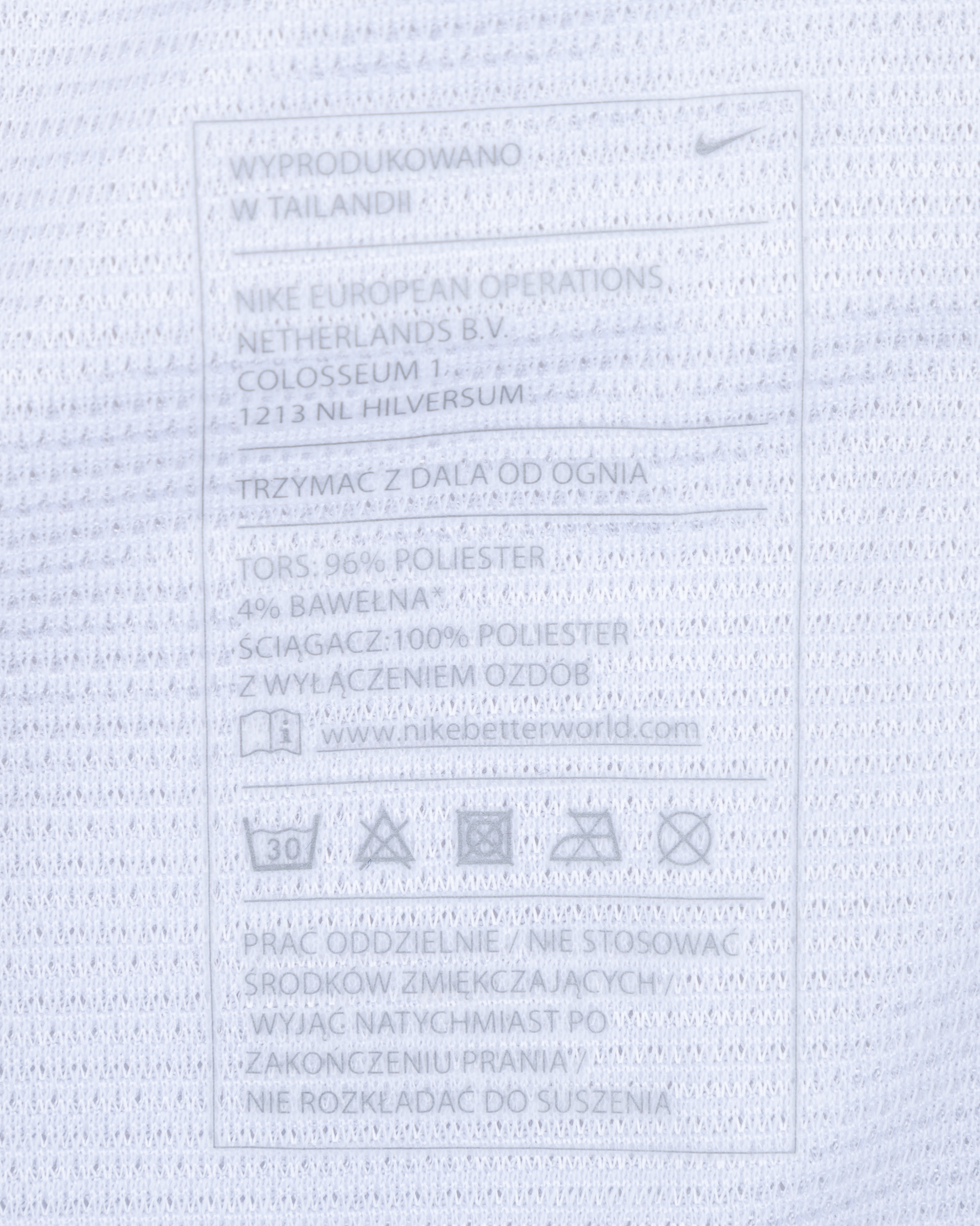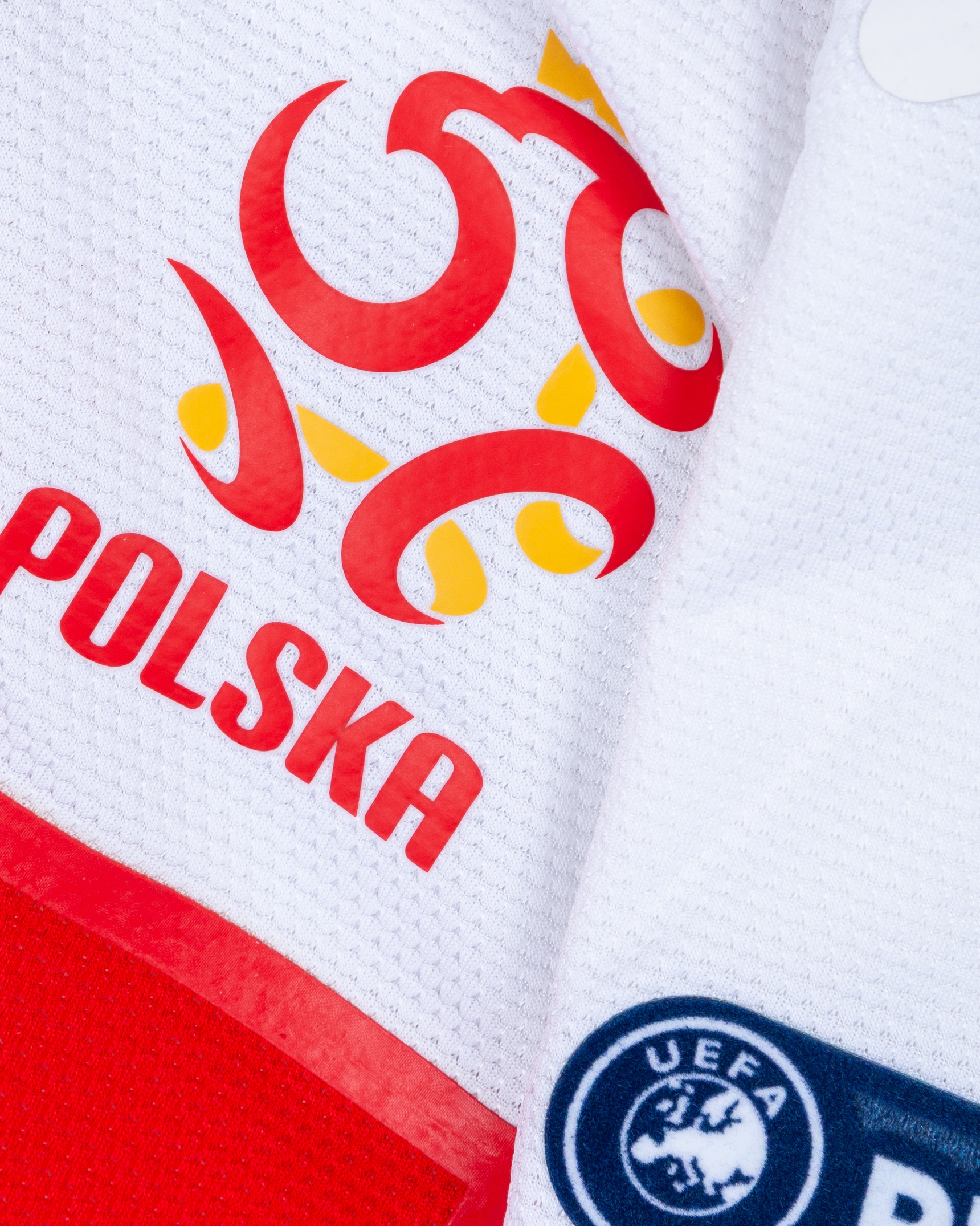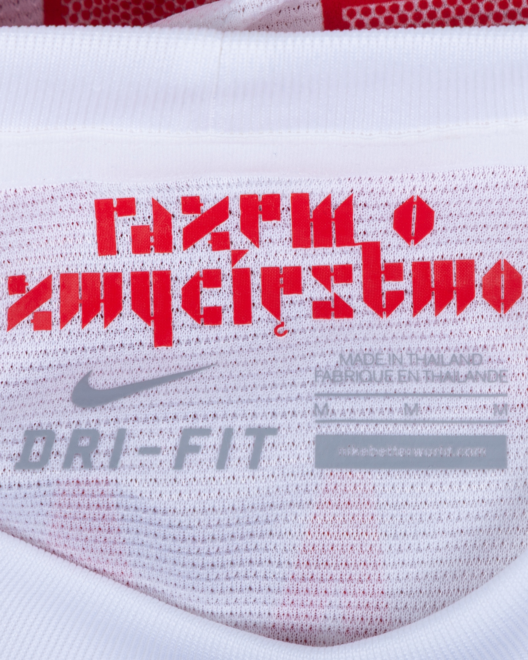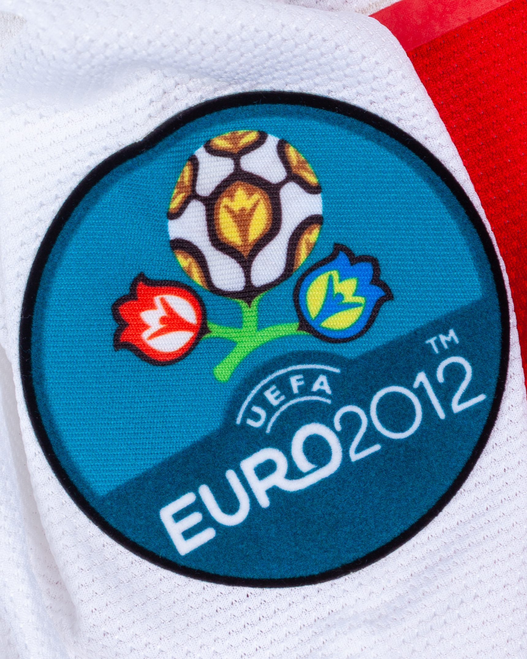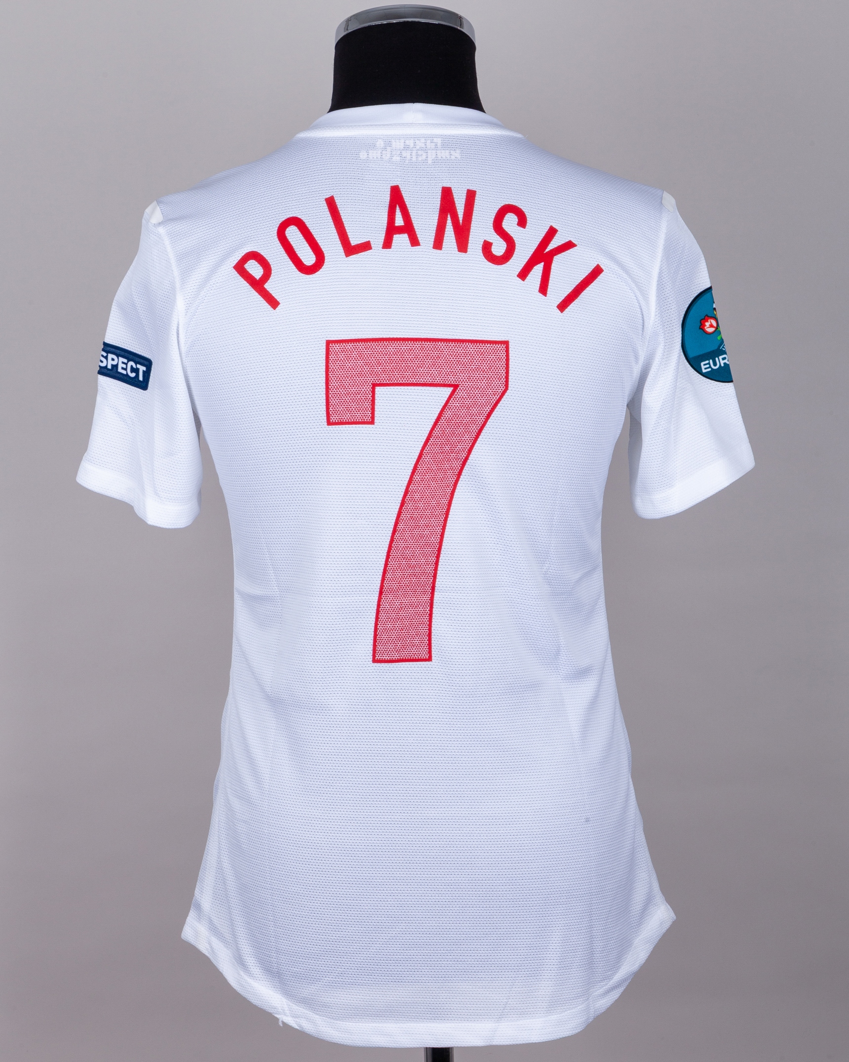 Eugen Polanski white and red No.7 Poland v. Russia short-sleeved shirt, 2012, Nike, M, with crew-neck collar and embroidered cloth badge, the reverse lettered POLANSKI, the right sleeve with UEFA Euro 2012 flash and the left sleeve with respect flash