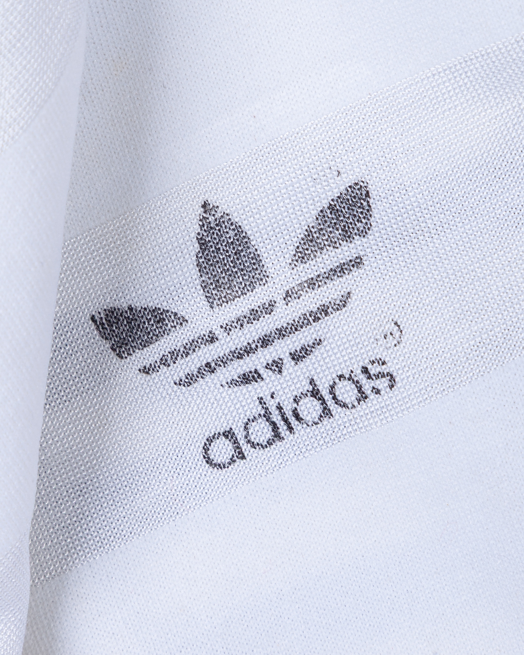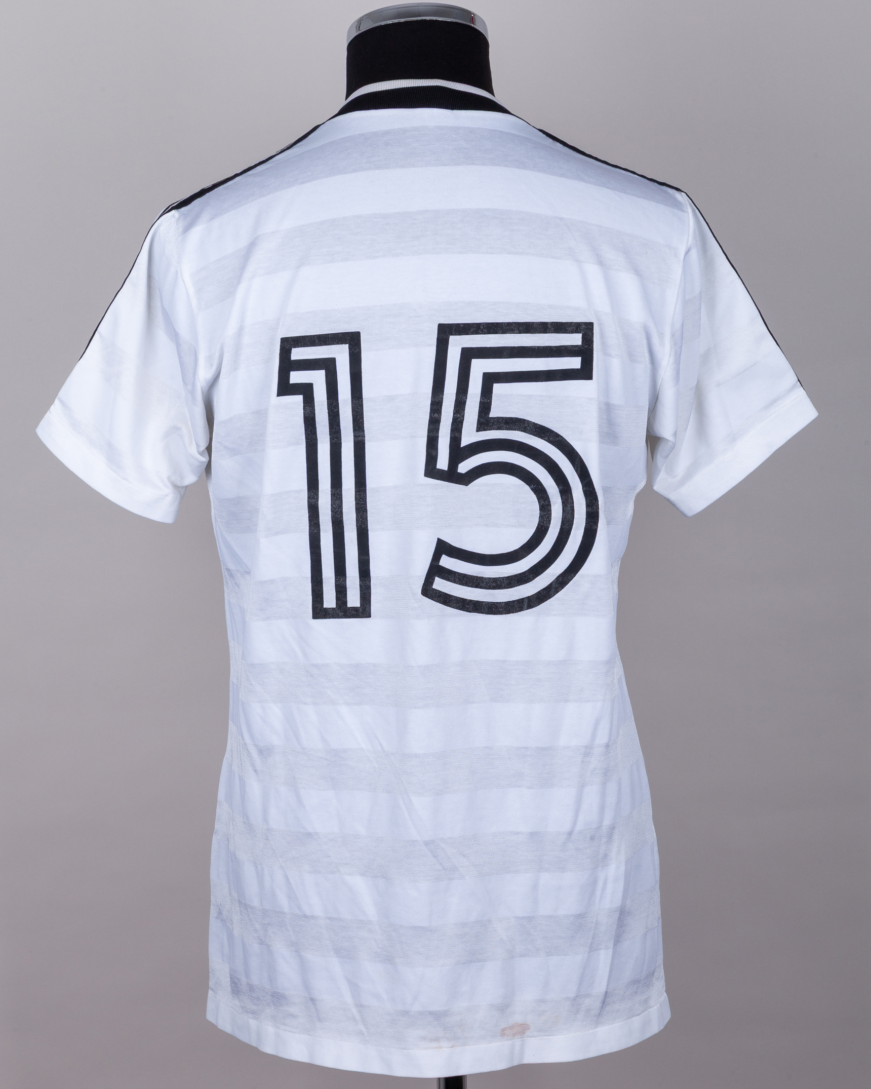 White No.15 Rosenborg short-sleeved shirt, c.1985, Adidas, L, with v-neck collar, with some staining