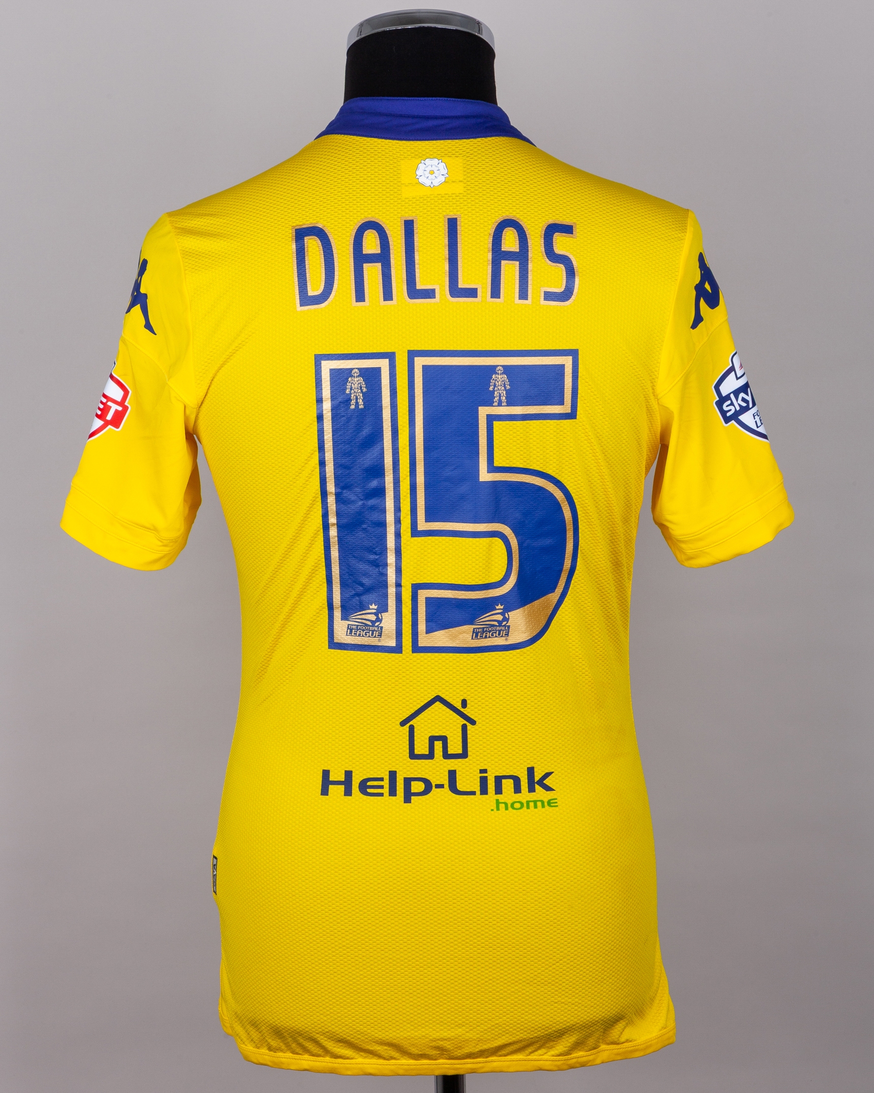 Stuart Dallas yellow No.15 Leeds United short-sleeved shirt, 2015-16, Kappa, MEDIUM, with v-neck collar and printed badge, the reverse lettered DALLAS, the sleeves with Sky Bet Football League flashes