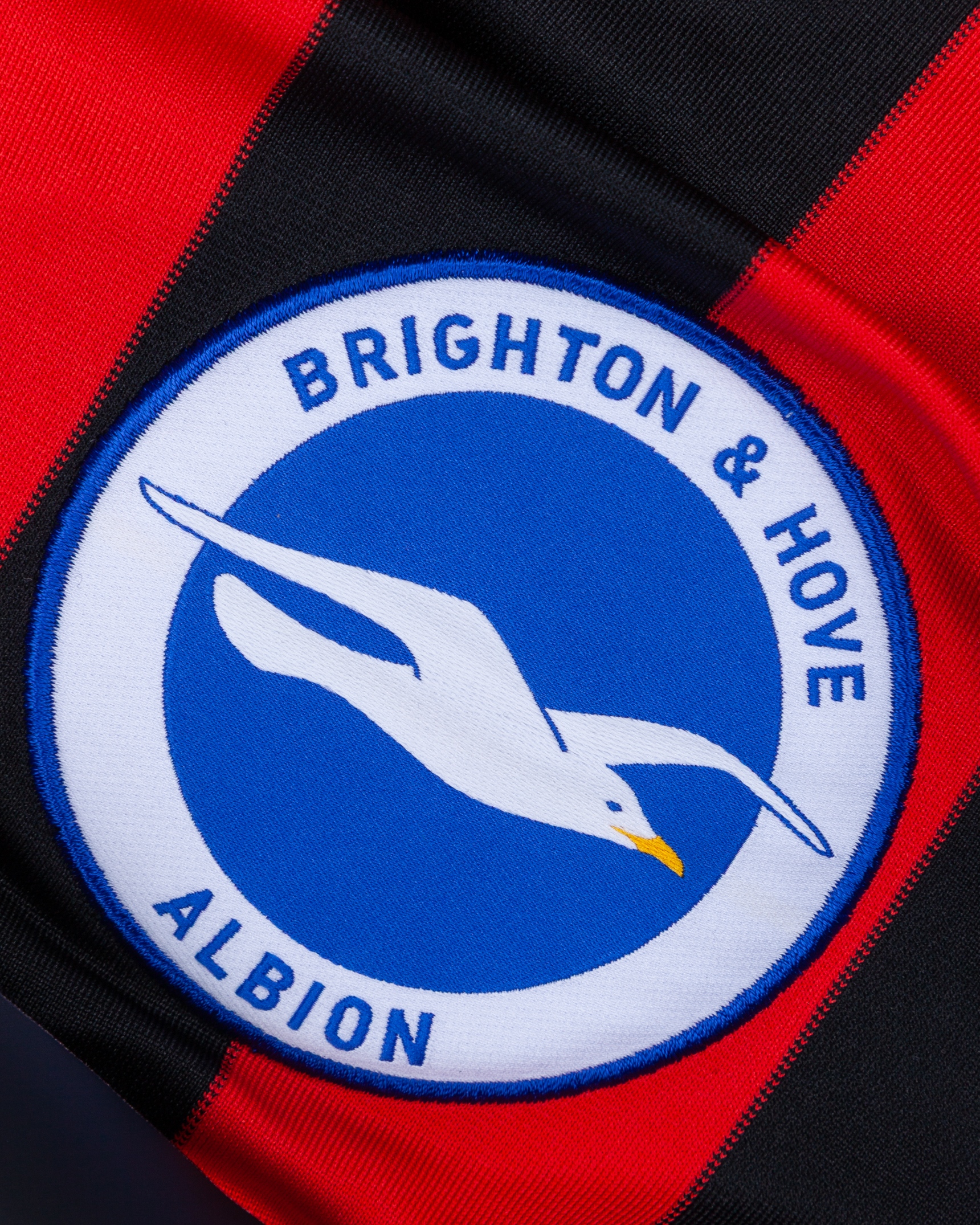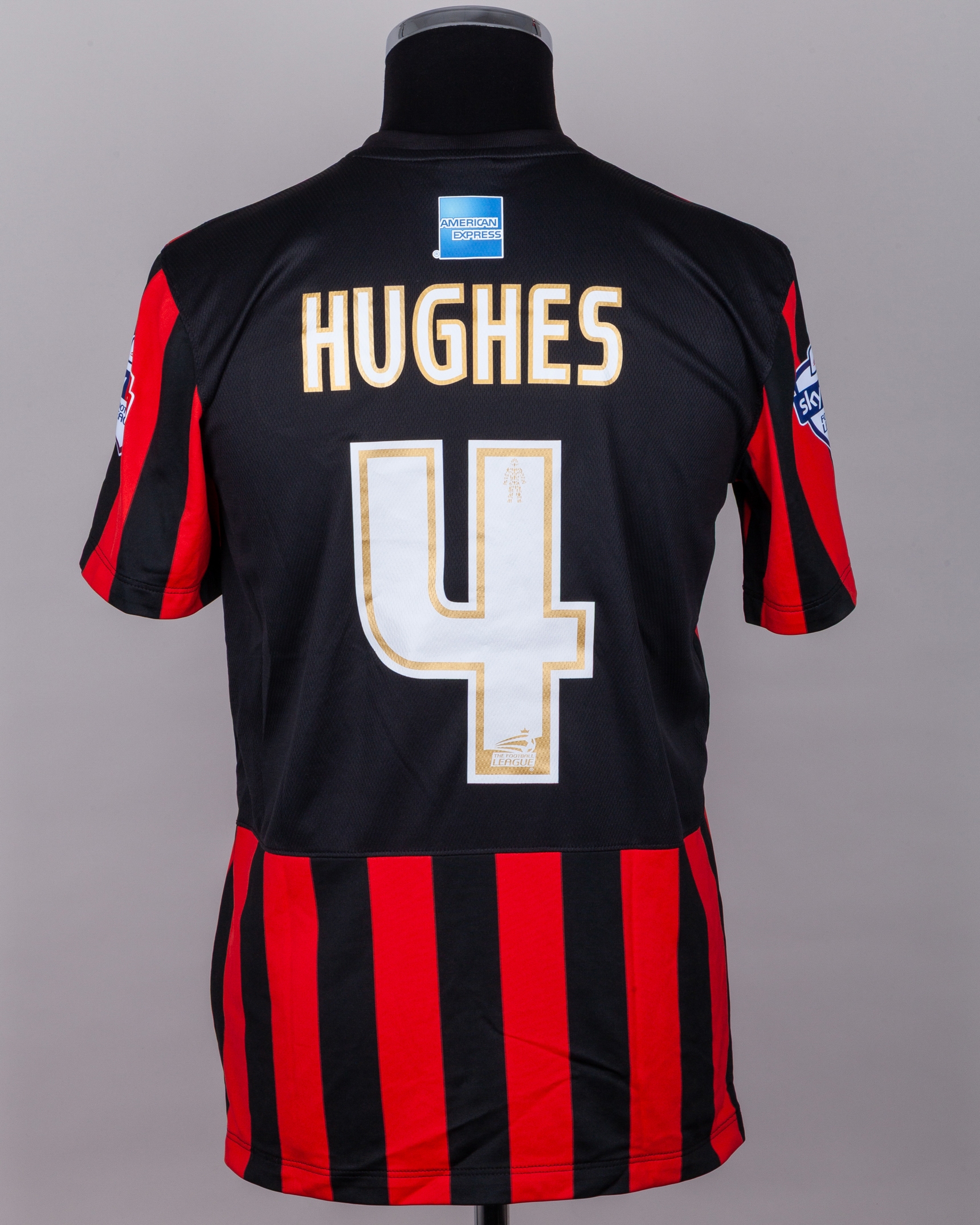 Aaron Hughes red and black No.4 Brighton & Hove Albion v. Norwich match worn short-sleeved shirt, 2014, Nike, M, with v-neck collar and embroidered cloth badge inscribed BRIGHTON & HOVE ALBION, the reverse lettered HUGHES, the sleeves with Sky Bet Football League flashes