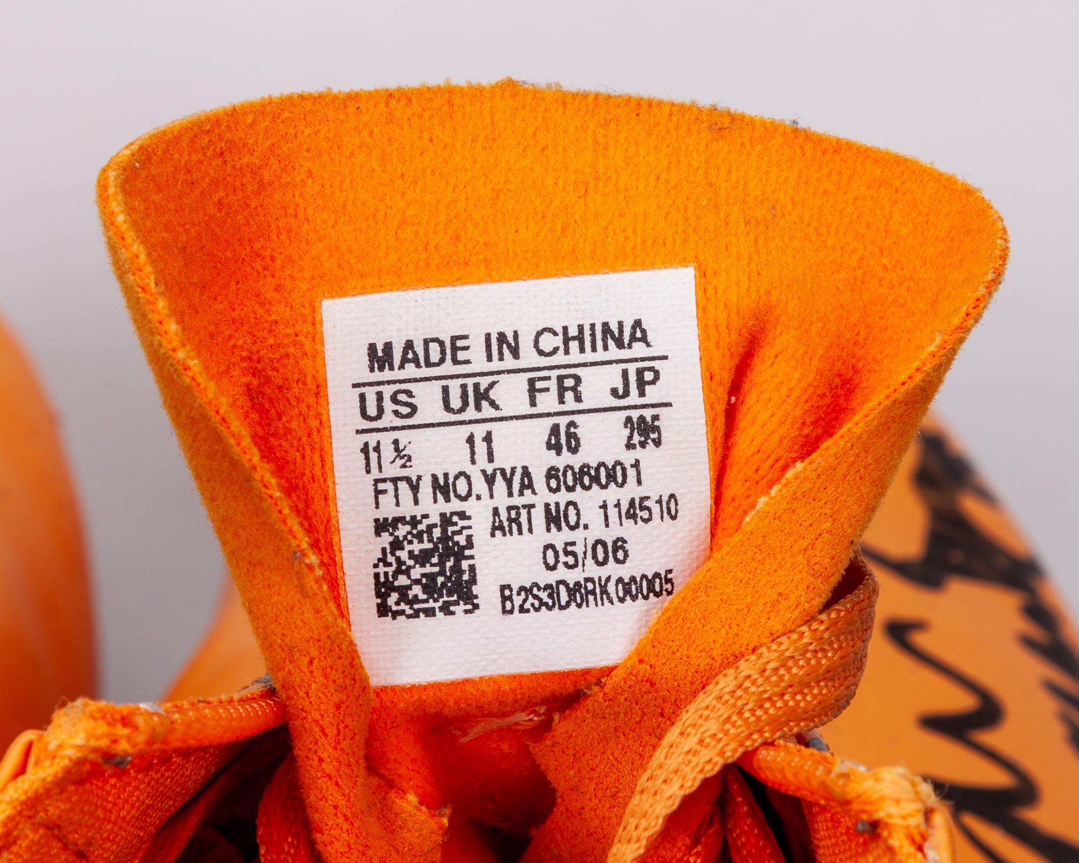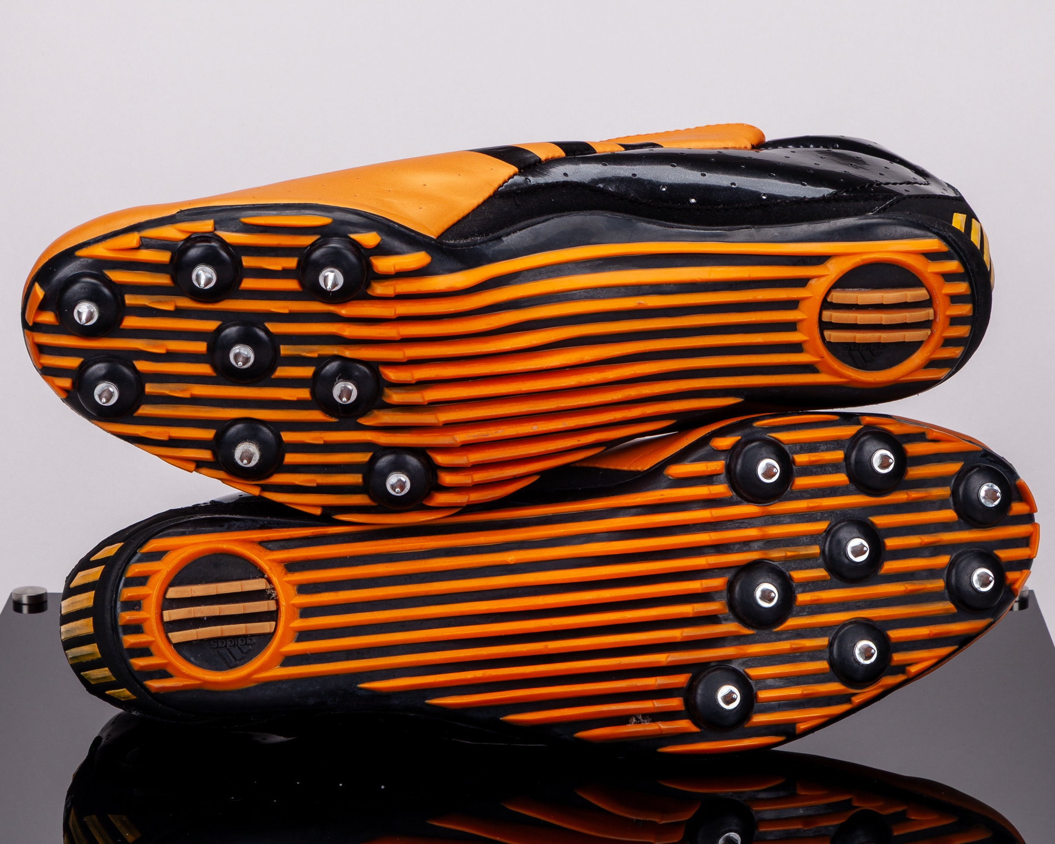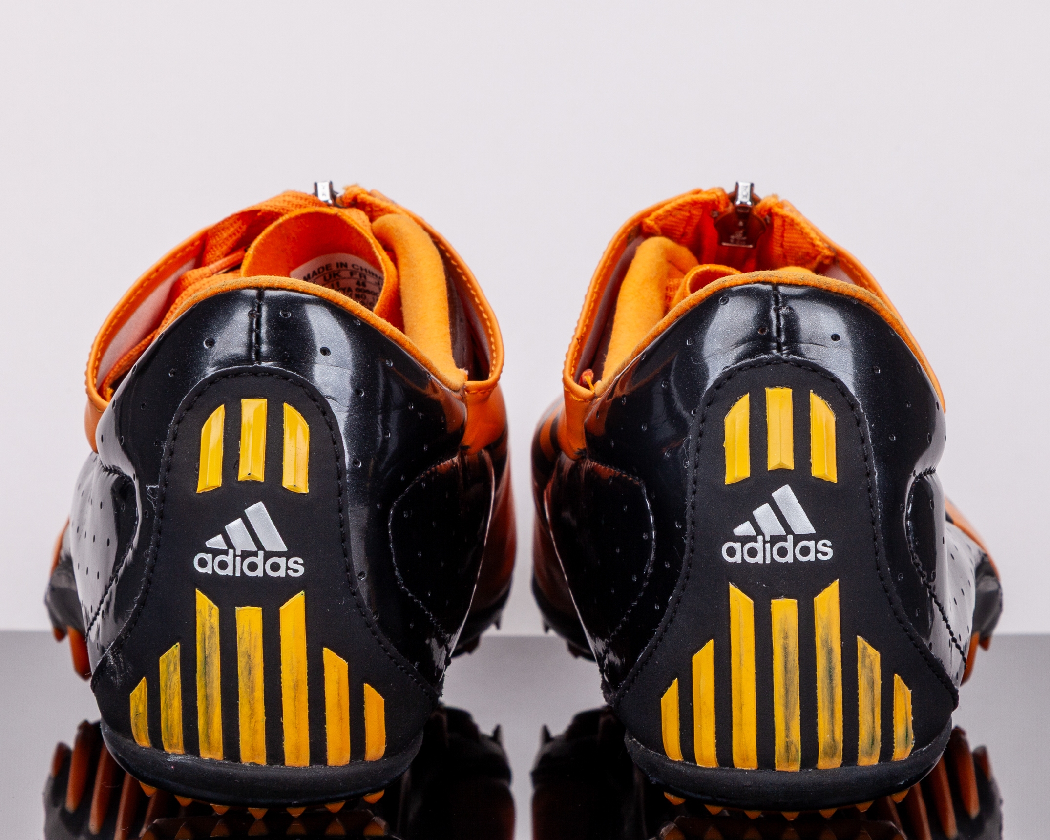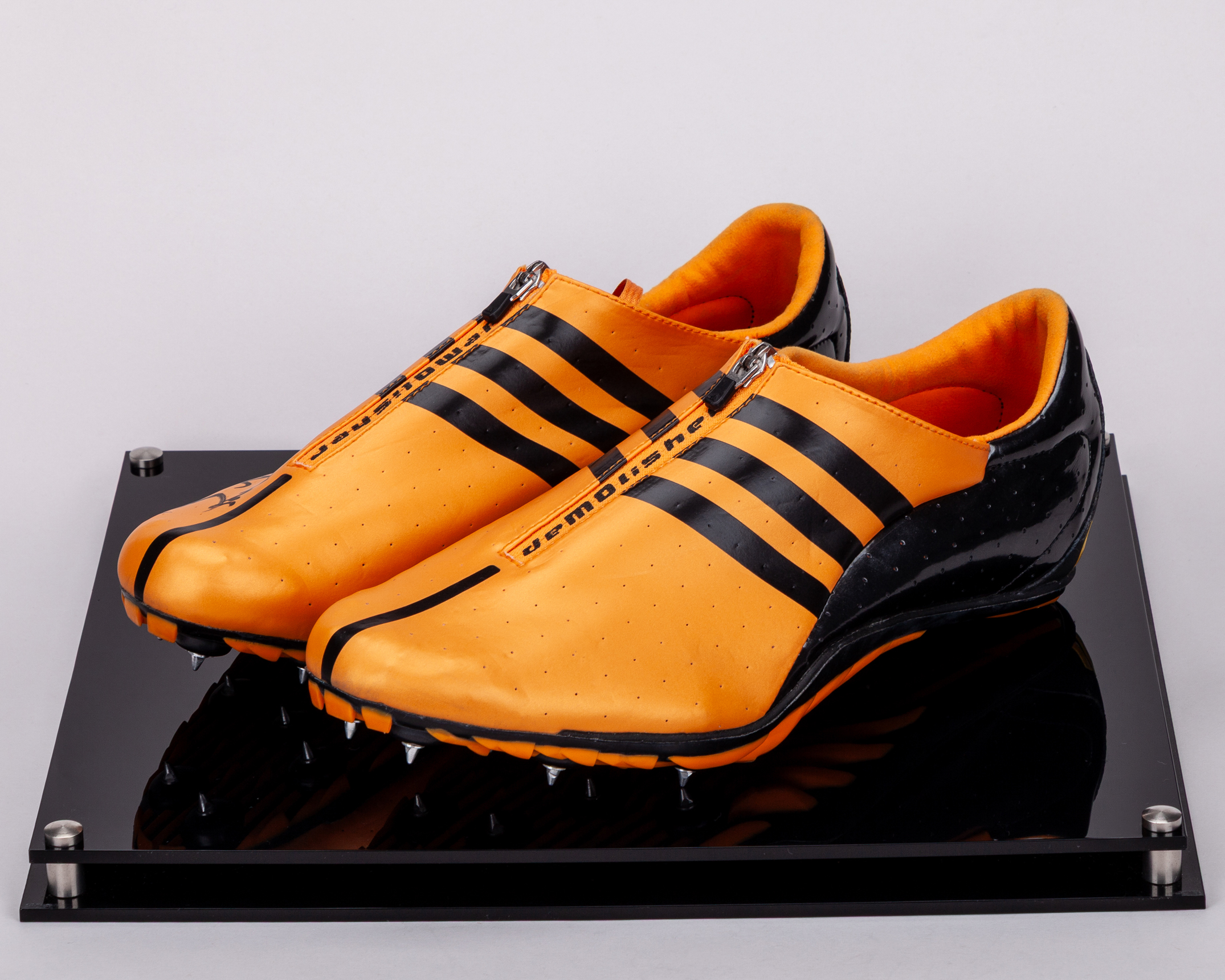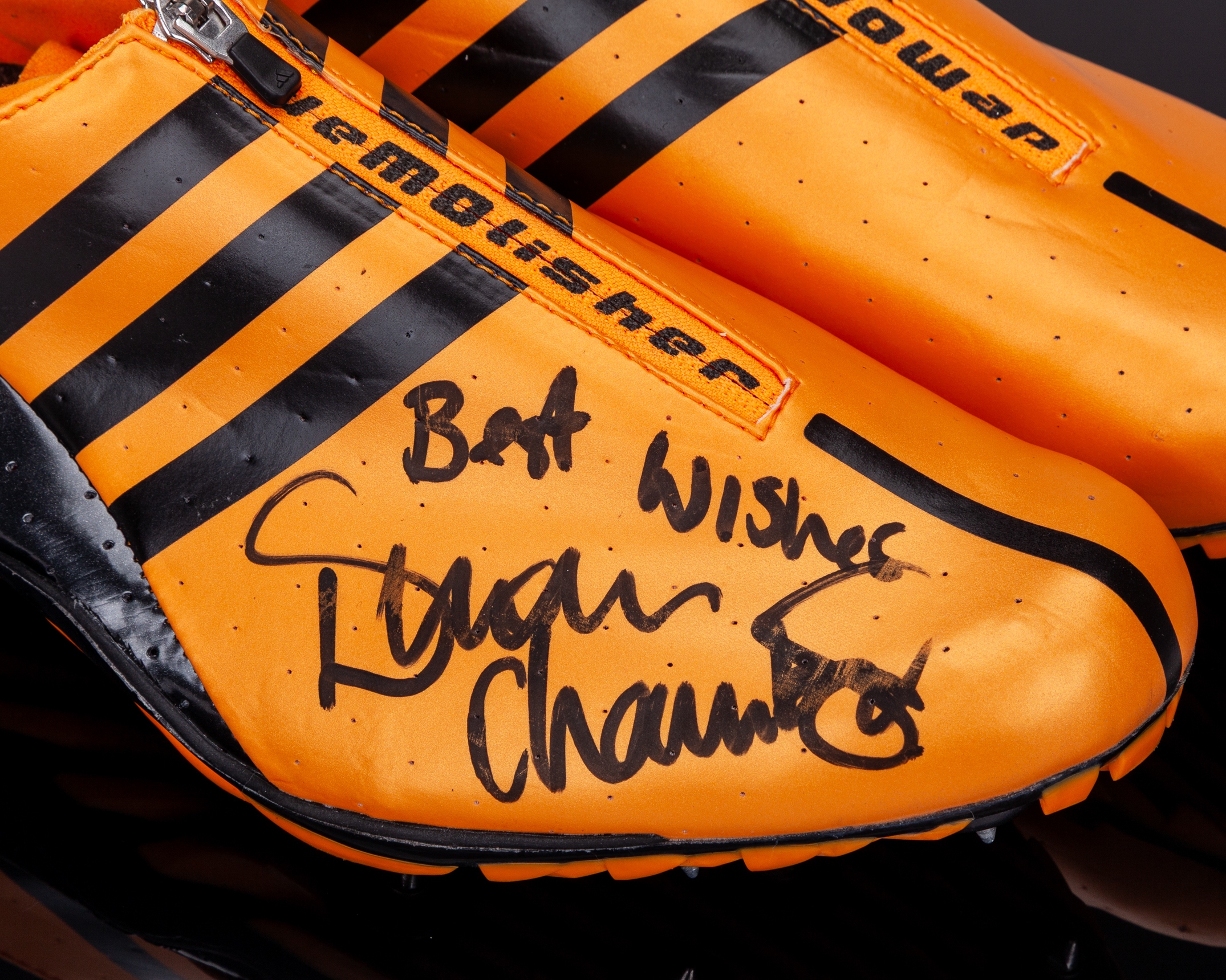 Dwain Chambers autographed orange and black Adidas Demolisher World Athletic Championship worn sprint spikes, 2009, UK11, the right shoe autographed best wishes, with display case and COA