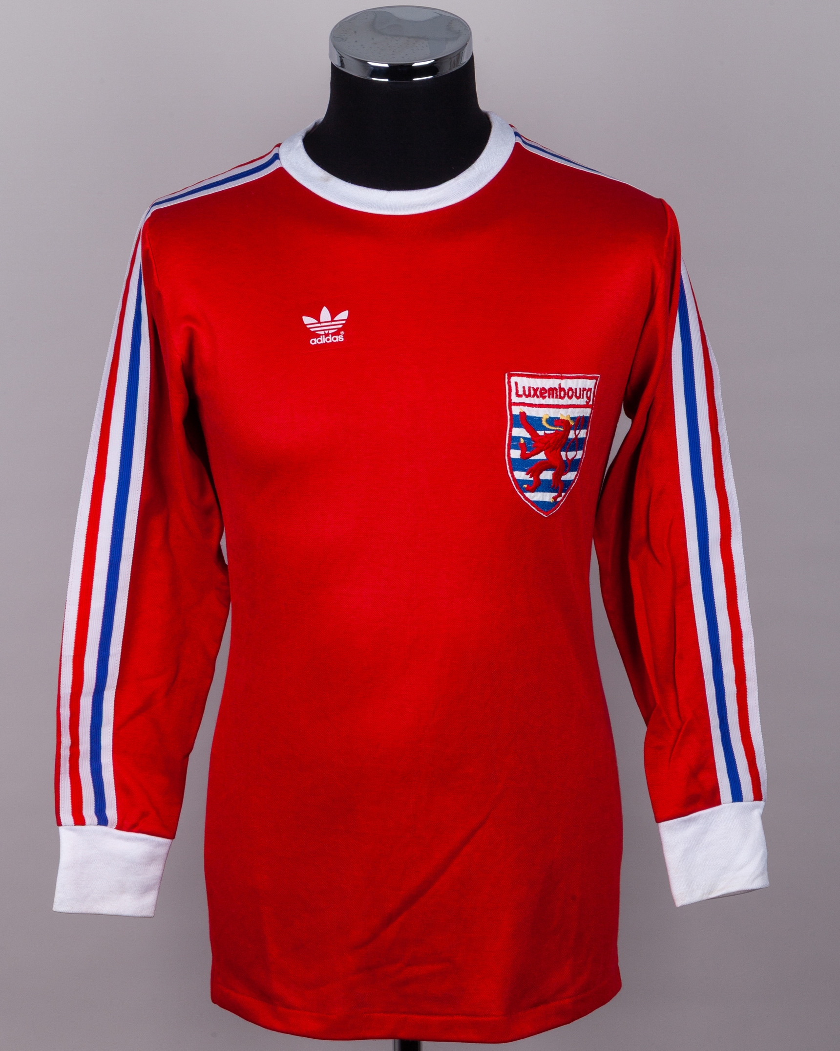 Romain Michaux red No.7 Luxembourg v. England match worn long-sleeved shirt, 1977, Adidas, medium, with crew-neck collar and embroidered cloth badge inscribed Luxembourg, with some discolouration to collar, cuffs and number