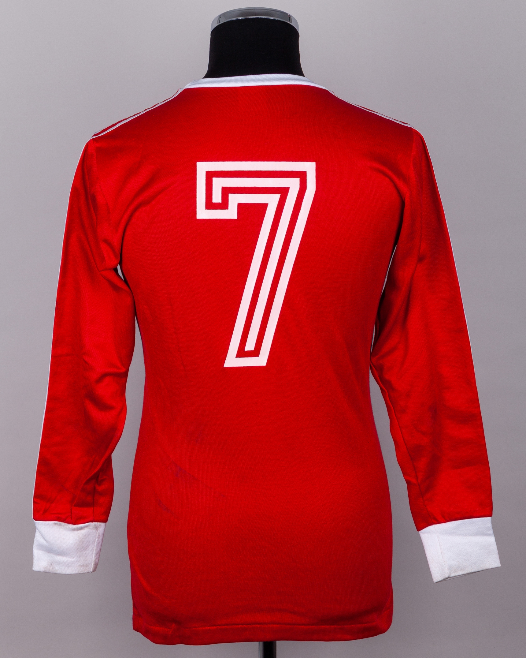 Romain Michaux red No.7 Luxembourg v. England match worn long-sleeved shirt, 1977