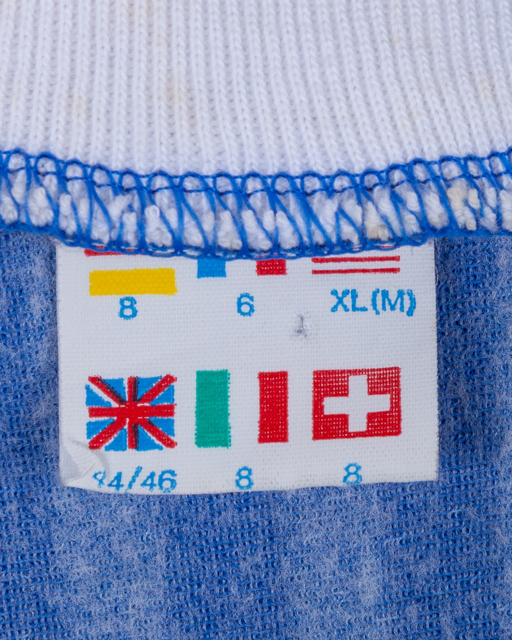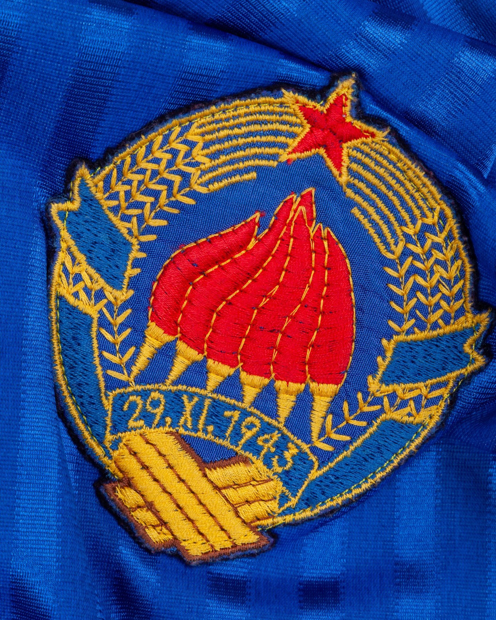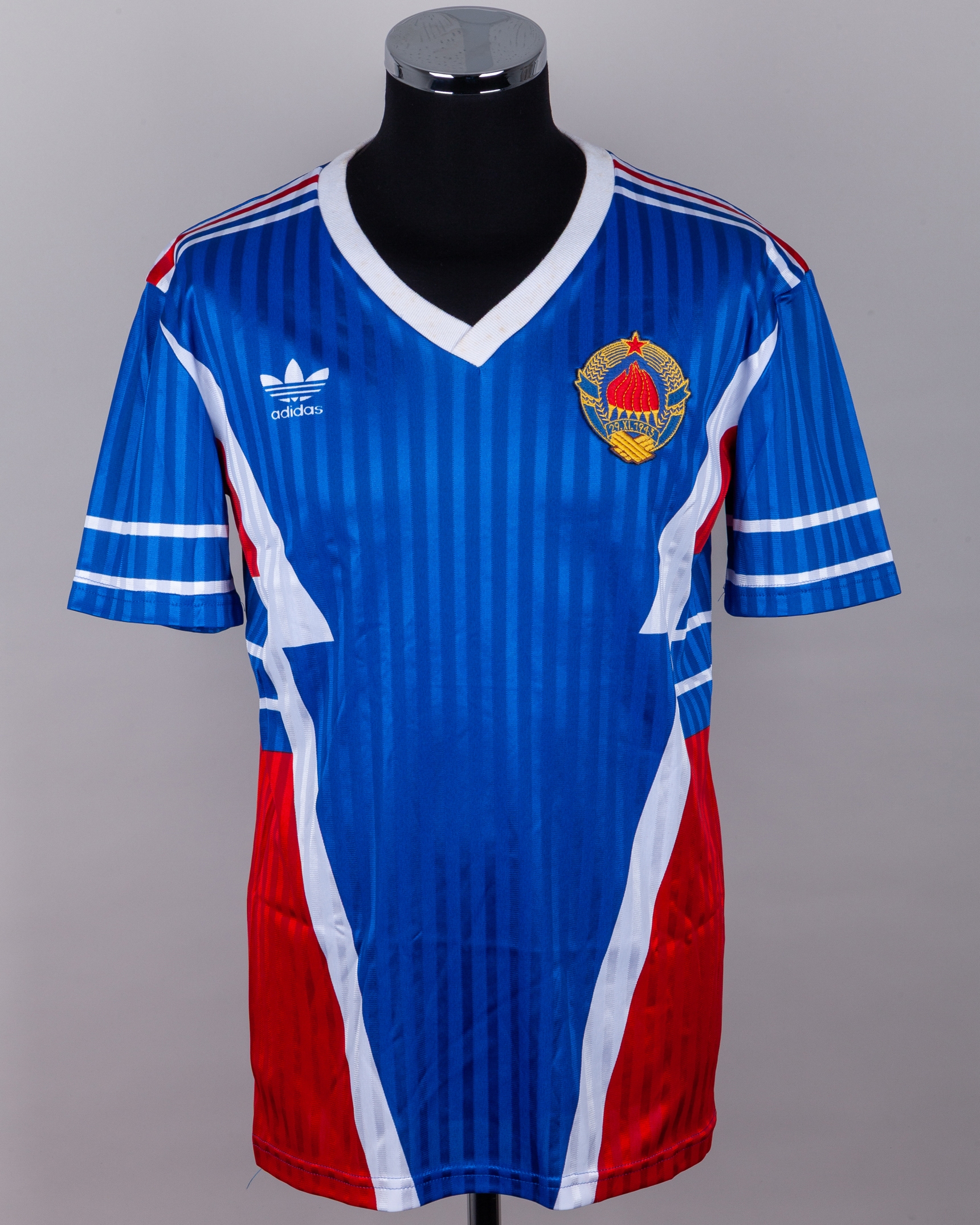 Dejan Savicevic blue, red and white No.8 Yugoslavia v. Northern Ireland short-sleeved shirt, 1990, Adidas, 44/46, with v-neck collar and embroidered cloth badge 29. XI. 1943, with some staining on collar