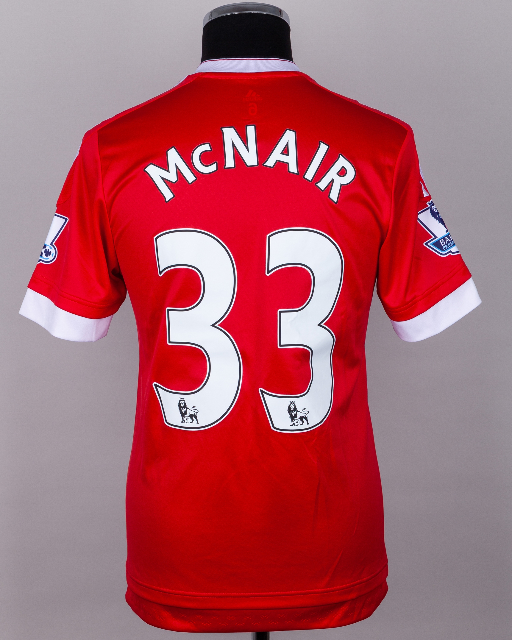 Paddy McNair red No.33 Manchester United short-sleeved shirt, 2015-16, Adidas, 6, with v-neck collar and printed badge, the reverse lettered McNAIR, the sleeves with Barclays Premier League flashes