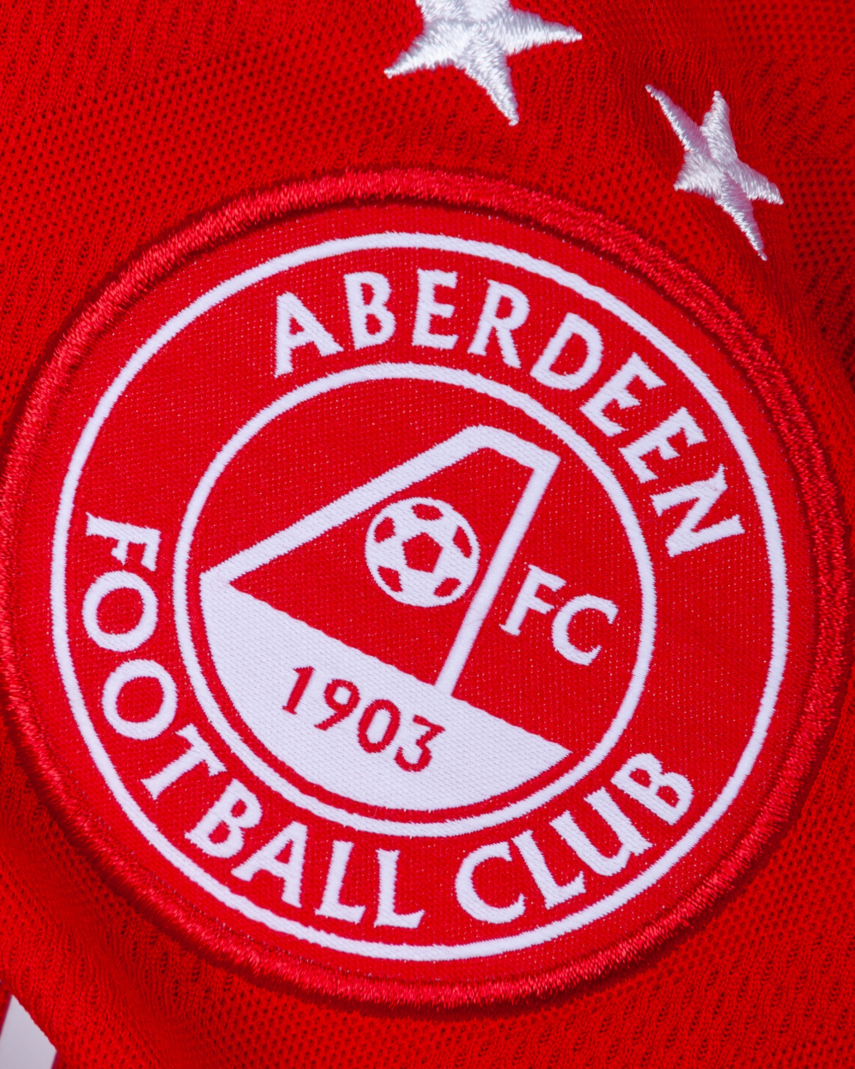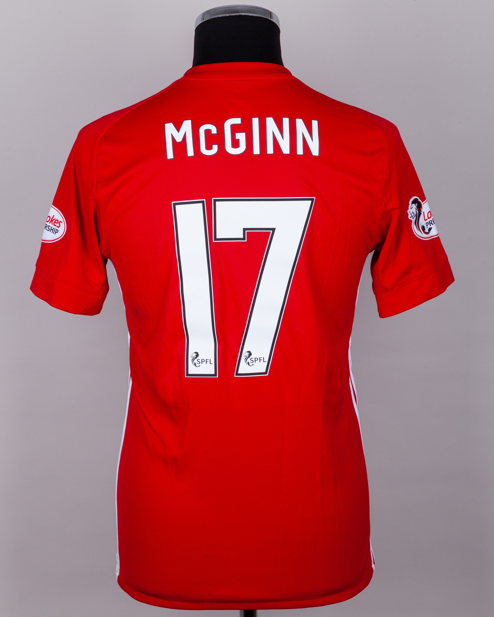 Niall McGinn red No.17 Aberdeen v. Hearts of Midlothian short-sleeved shirt, 2018, Adidas, S, with v-neck collar and embroidered cloth badge inscribed ABERDEEN FOOTBALL CLUB FC 1903, the reverse lettered McGINN, the sleeves with Ladbrokes Premiership flashes