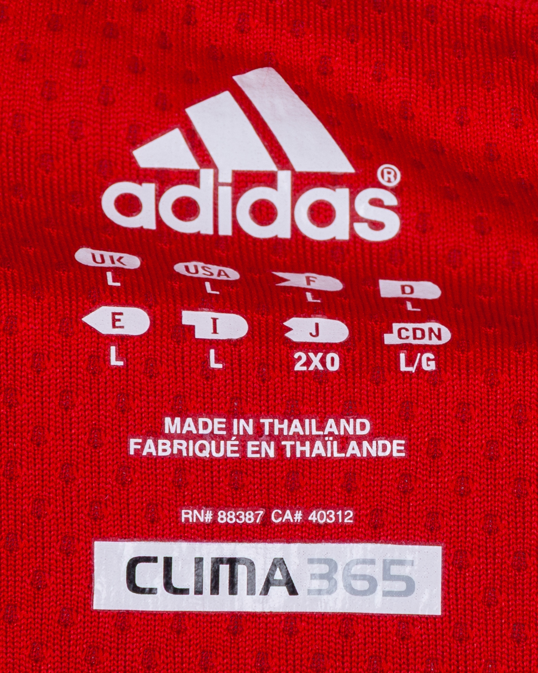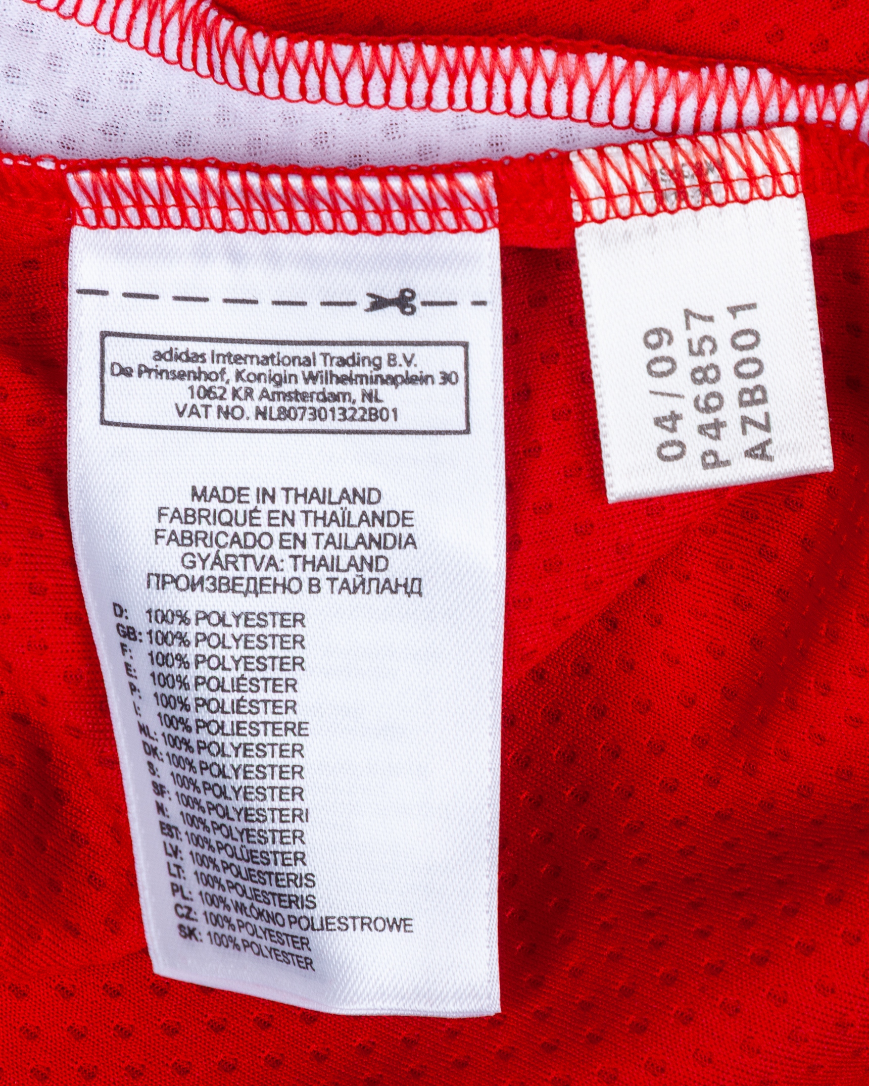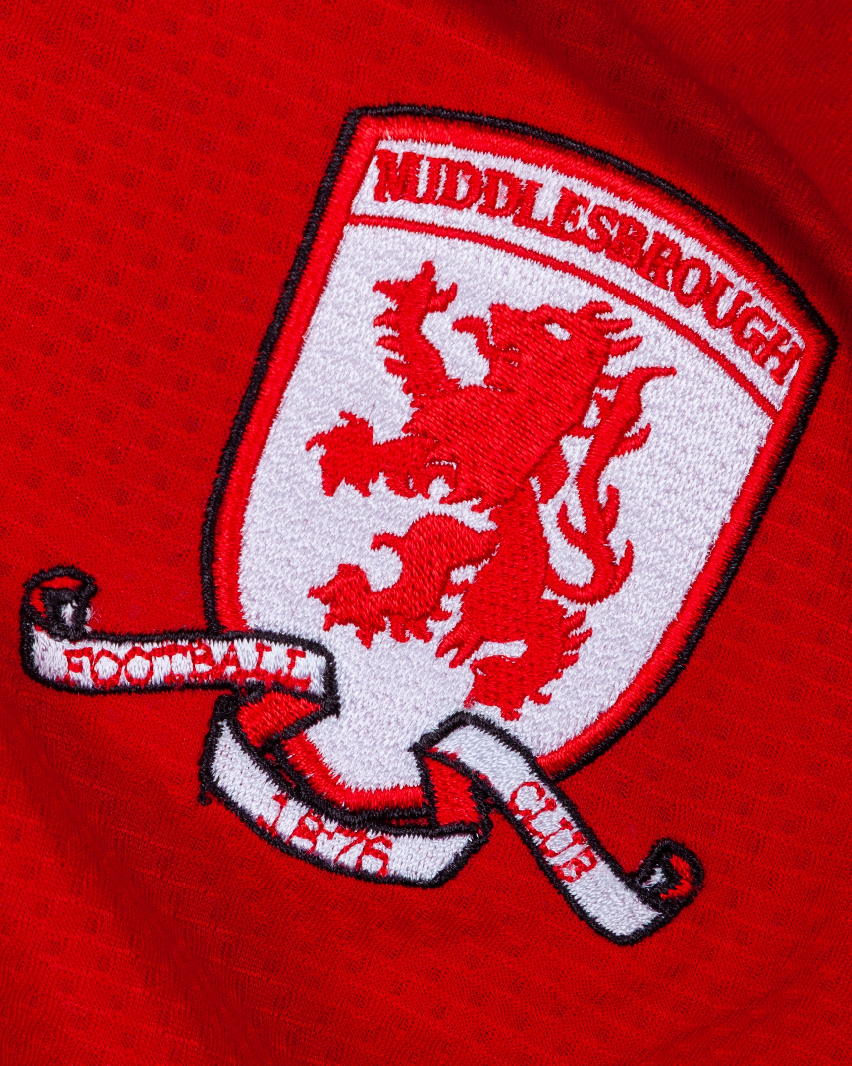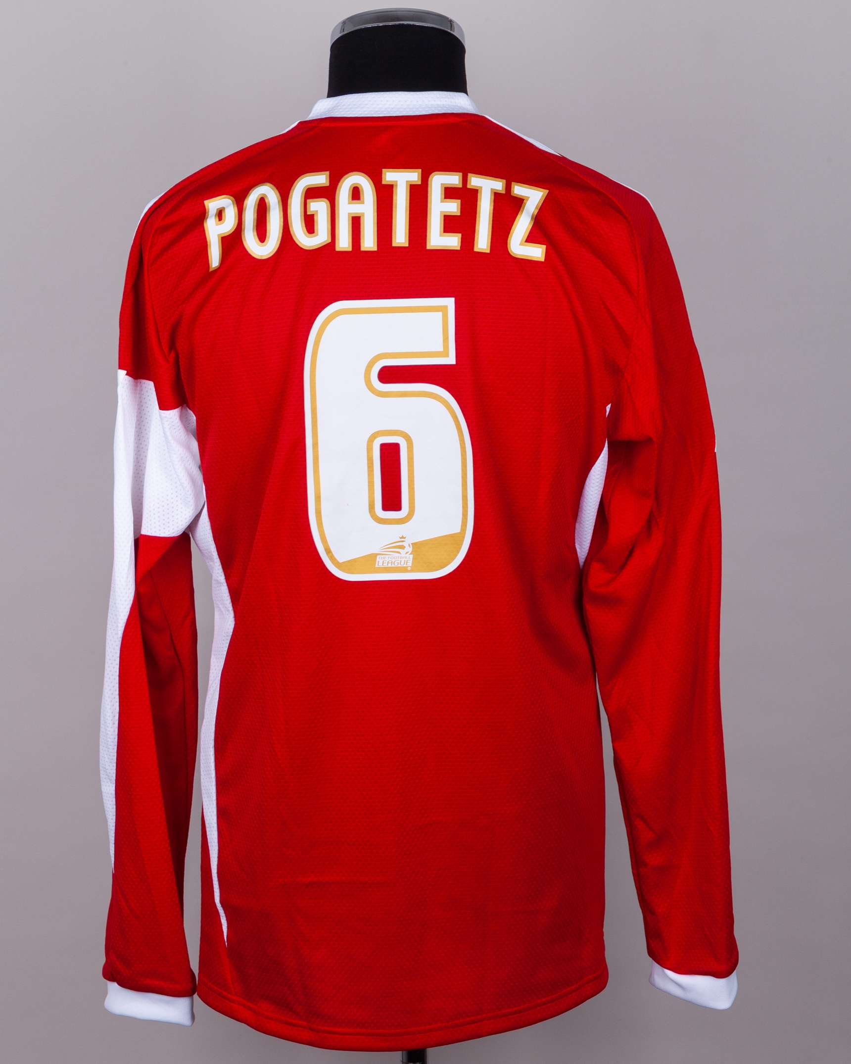 Emanuel Pogatetz red and white No.6 Middlesbrough long-sleeved shirt, 2009-10, Adidas, L, with crew-neck collar and embroidered badge inscribed MIDDLESBROUGH FOOTBALL CLUB 1876, the reverse lettered POGATETZ, the sleeves with Coca-Cola Football league flashes