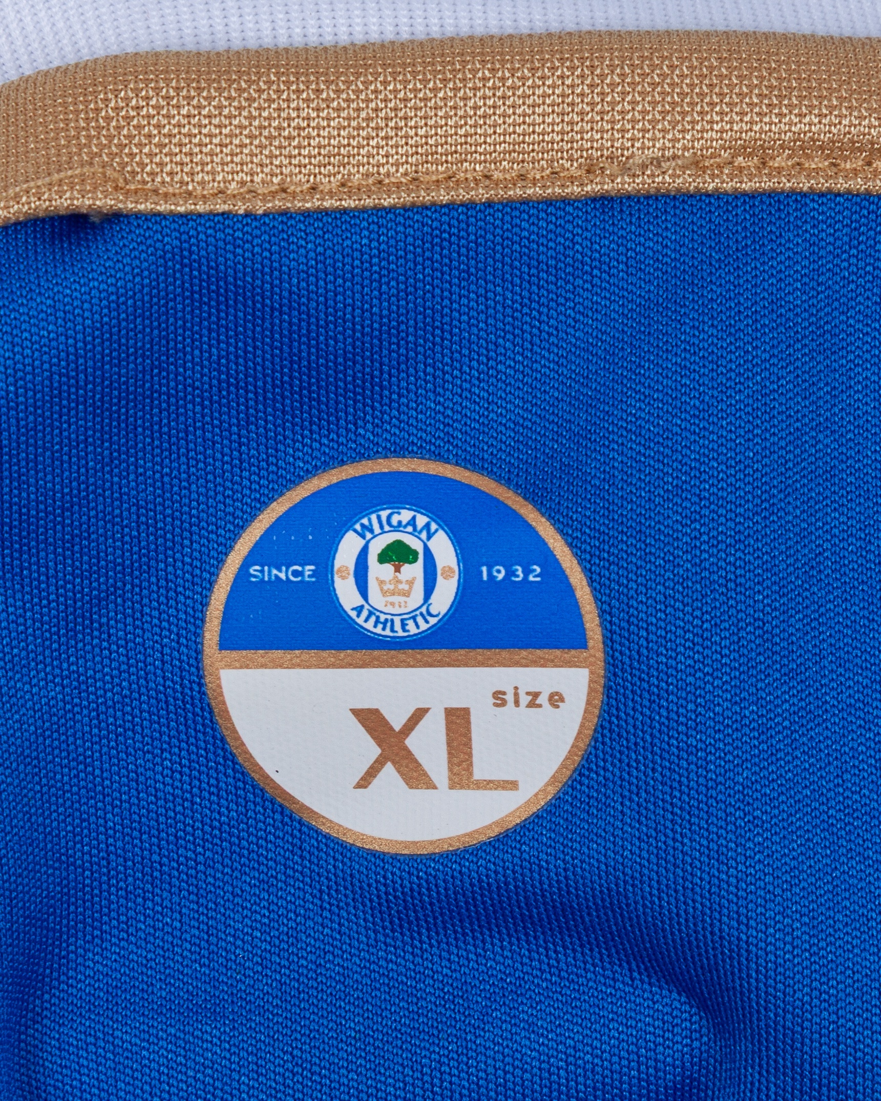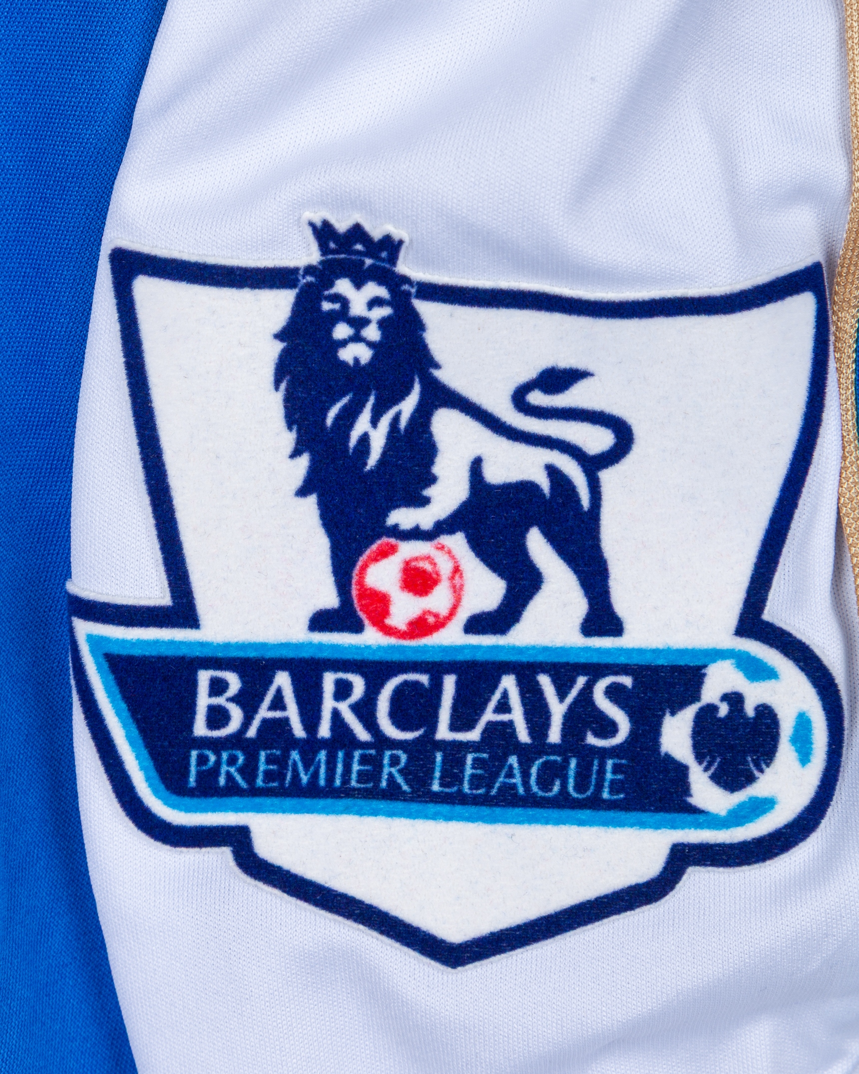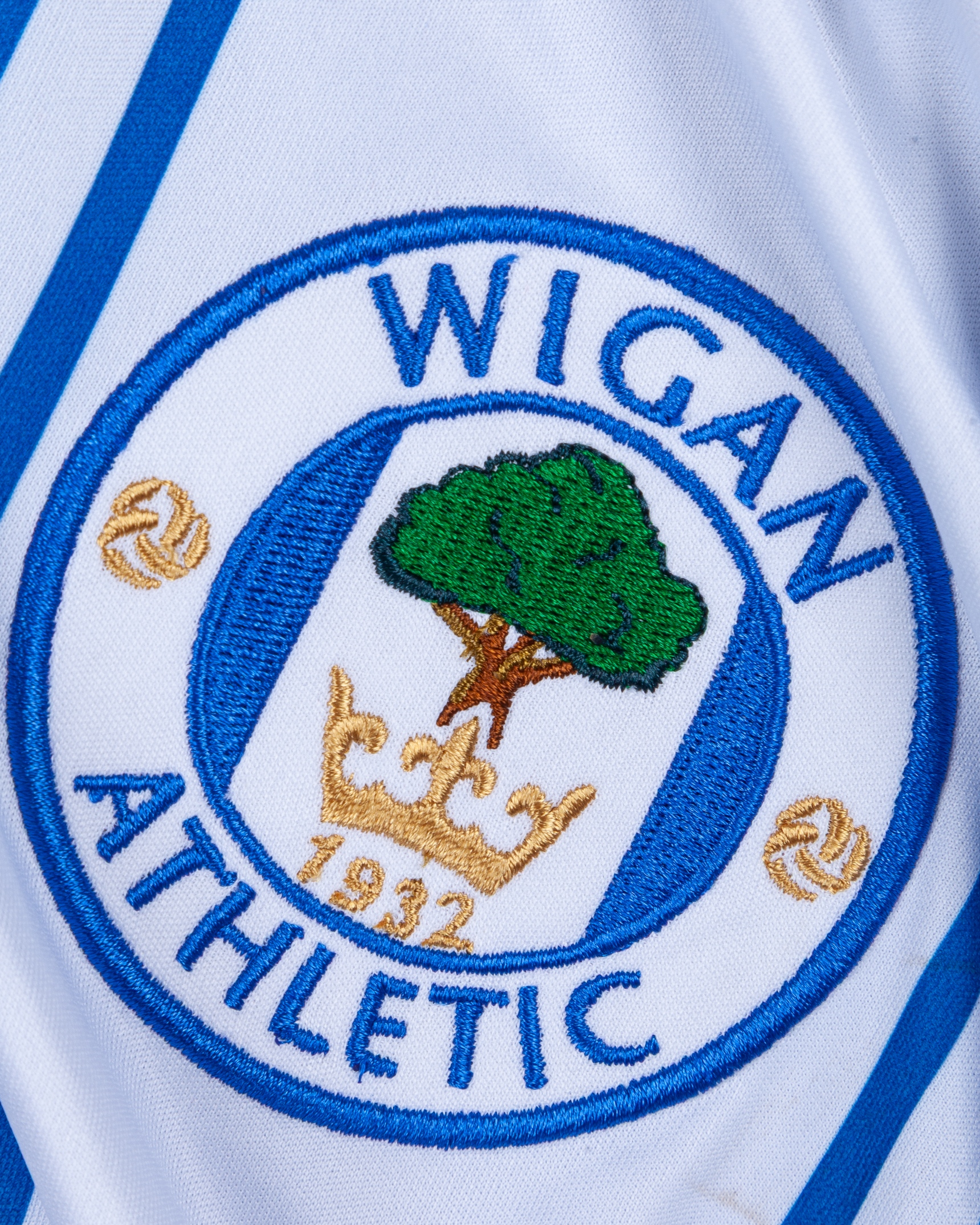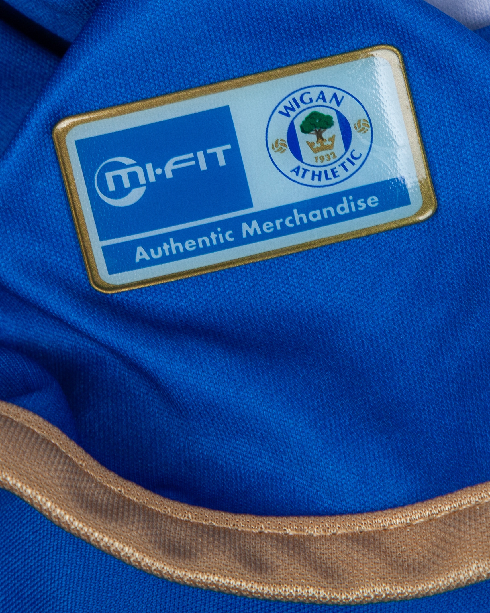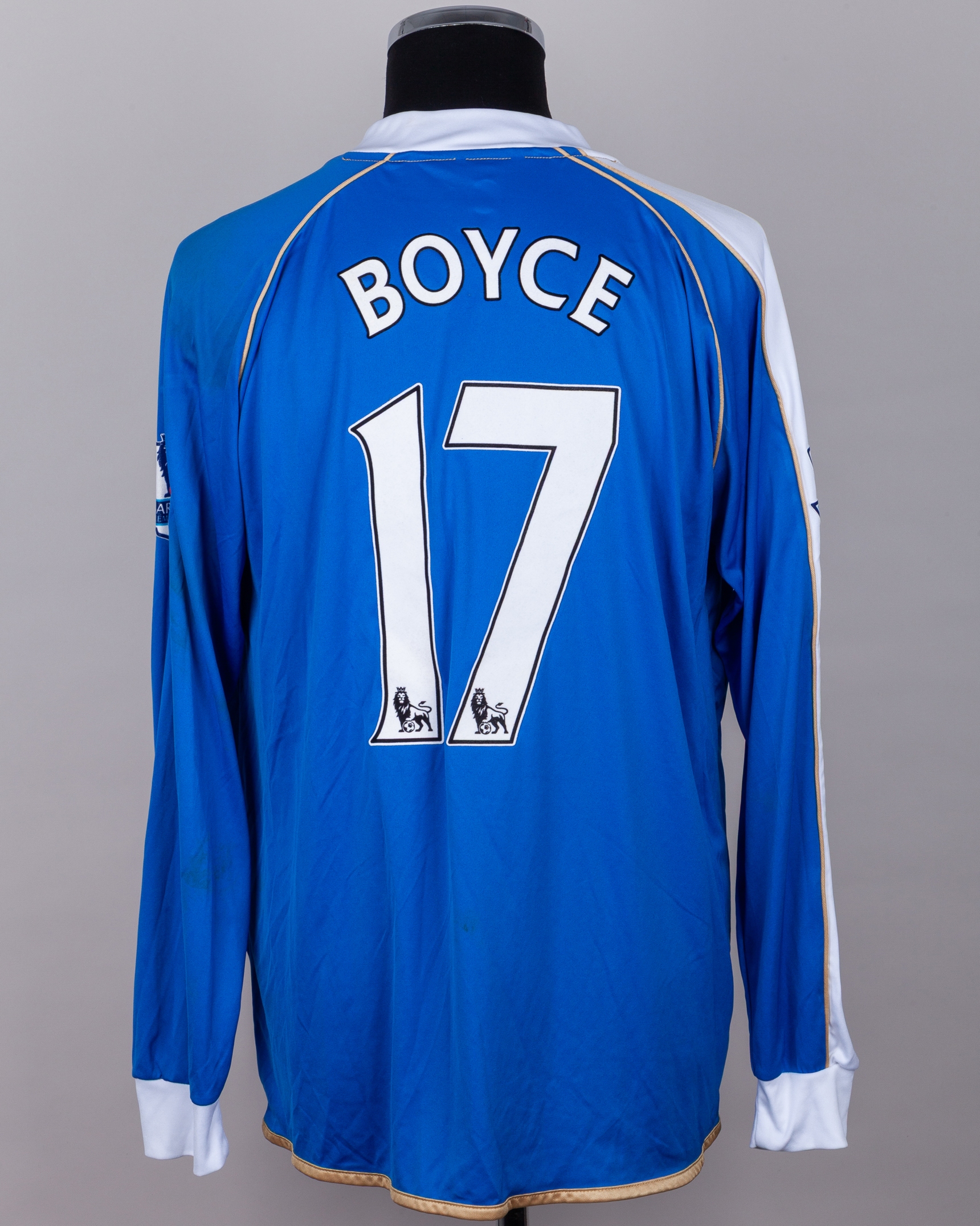 Emmerson Boyce blue and white No.17 Wigan Athletic v. Tottenham Hotspur match worn long-sleeved shirt, 2011, Mi.Fit, XL, with crew-neck collar and embroidered cloth badge inscribed WIGAN ATHLETIC, the reverse lettered BOYCE, the sleeves with Barclays Premier League flashes, with pitch staining