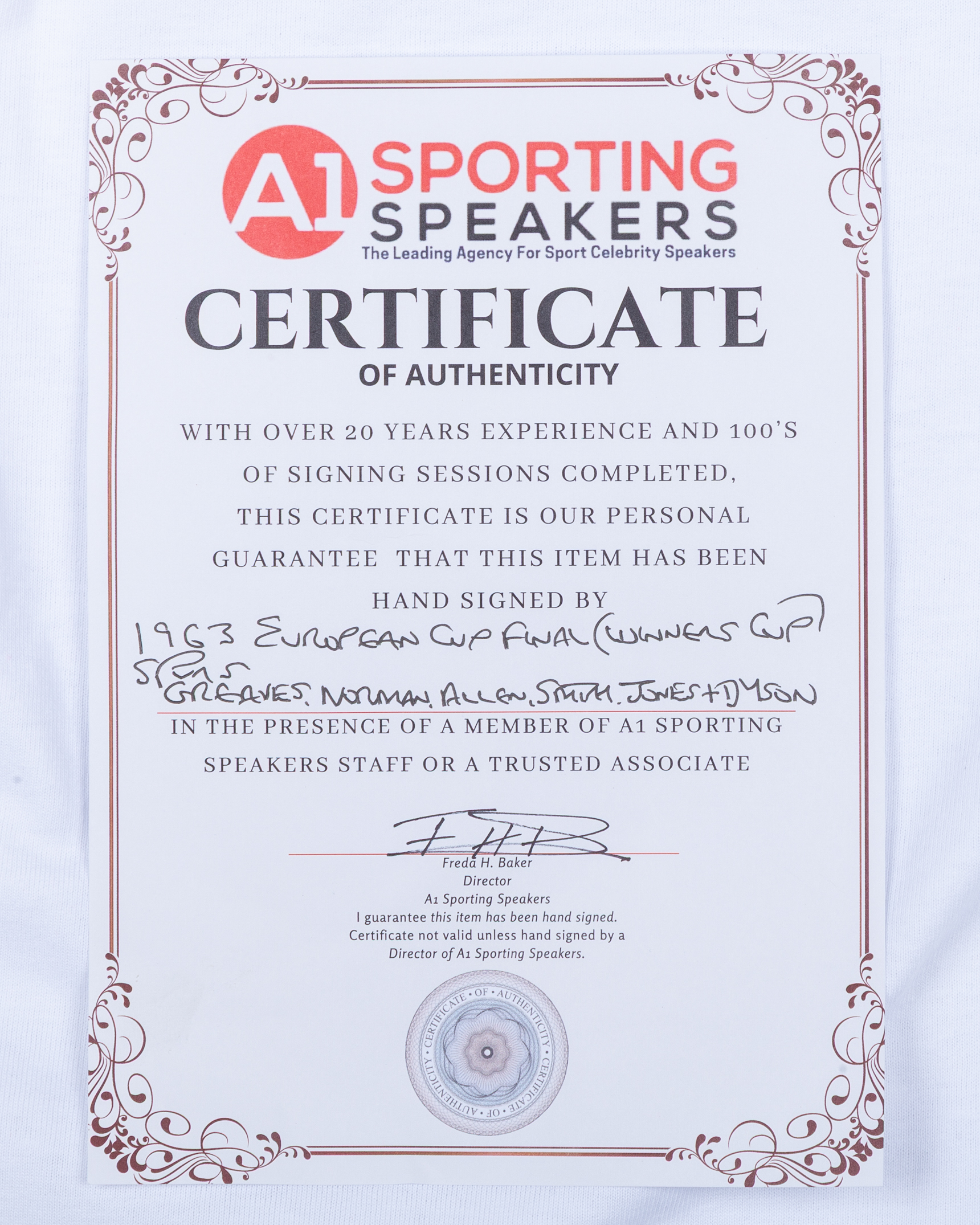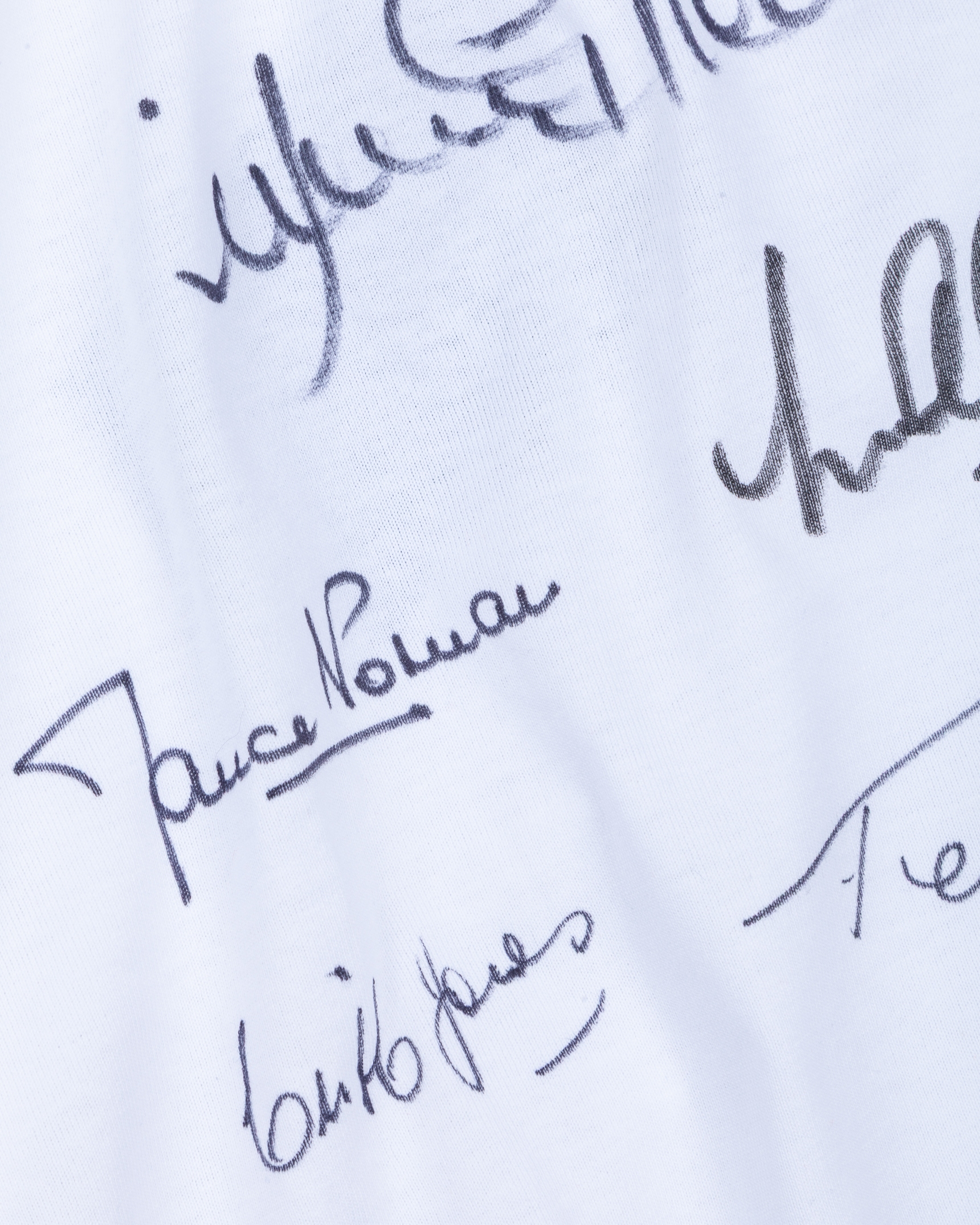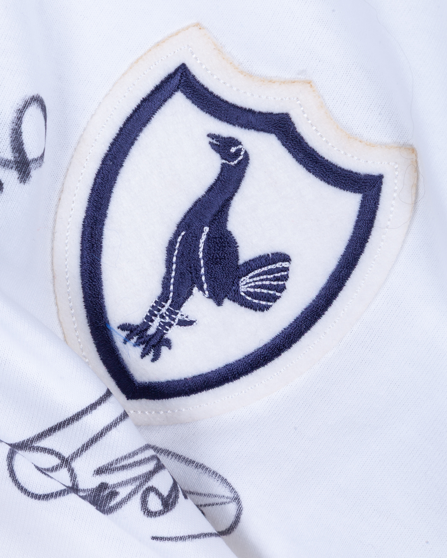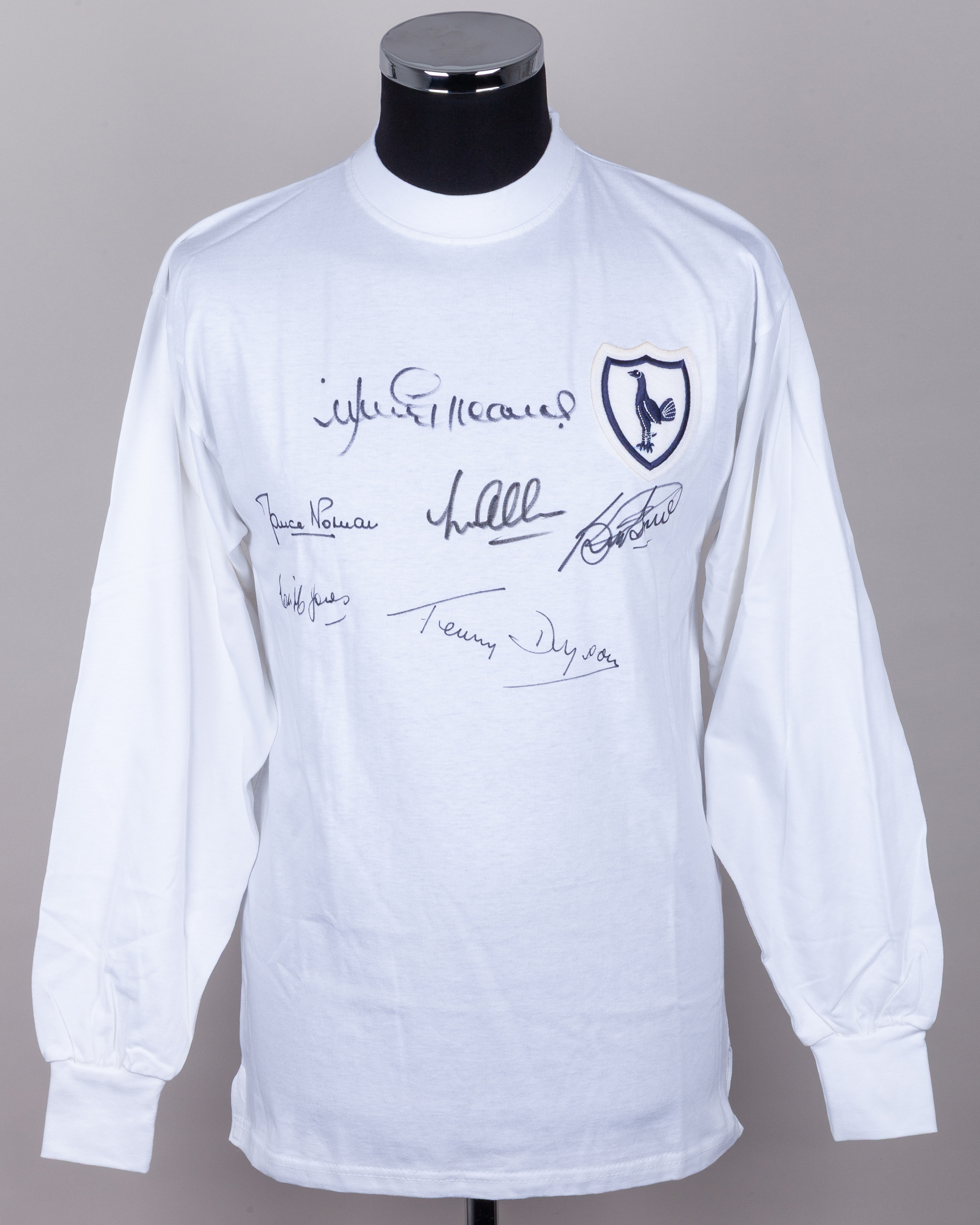 White Tottenham Hotspur long-sleeved shirt, with six autographs including Jimmy Greaves, Maurine Norman, Les Allen, Bobby Smith, Cliff Jones and Terry Dyson, Score Draw, M, with crew-neck collar and embroidered cloth badge, with COA