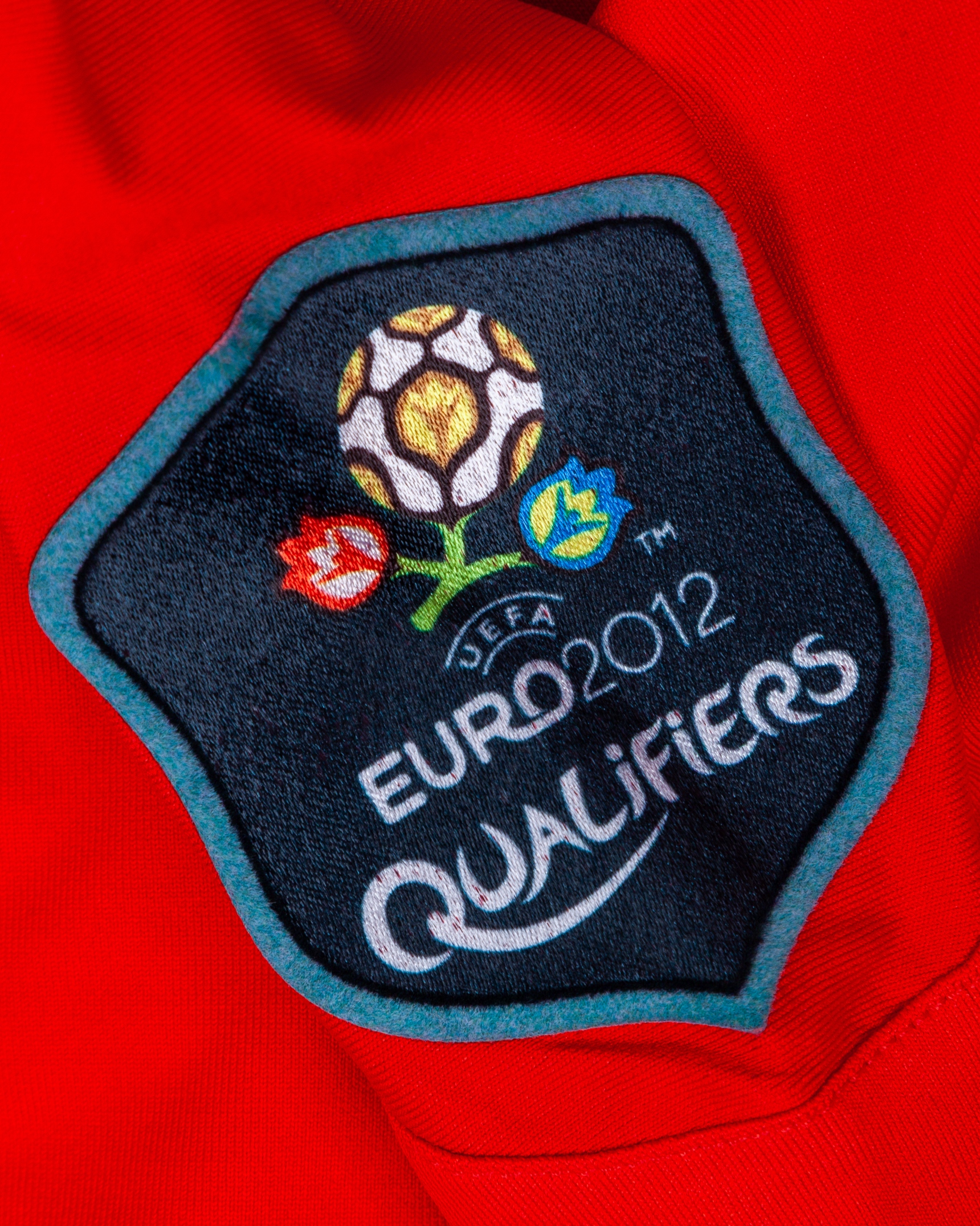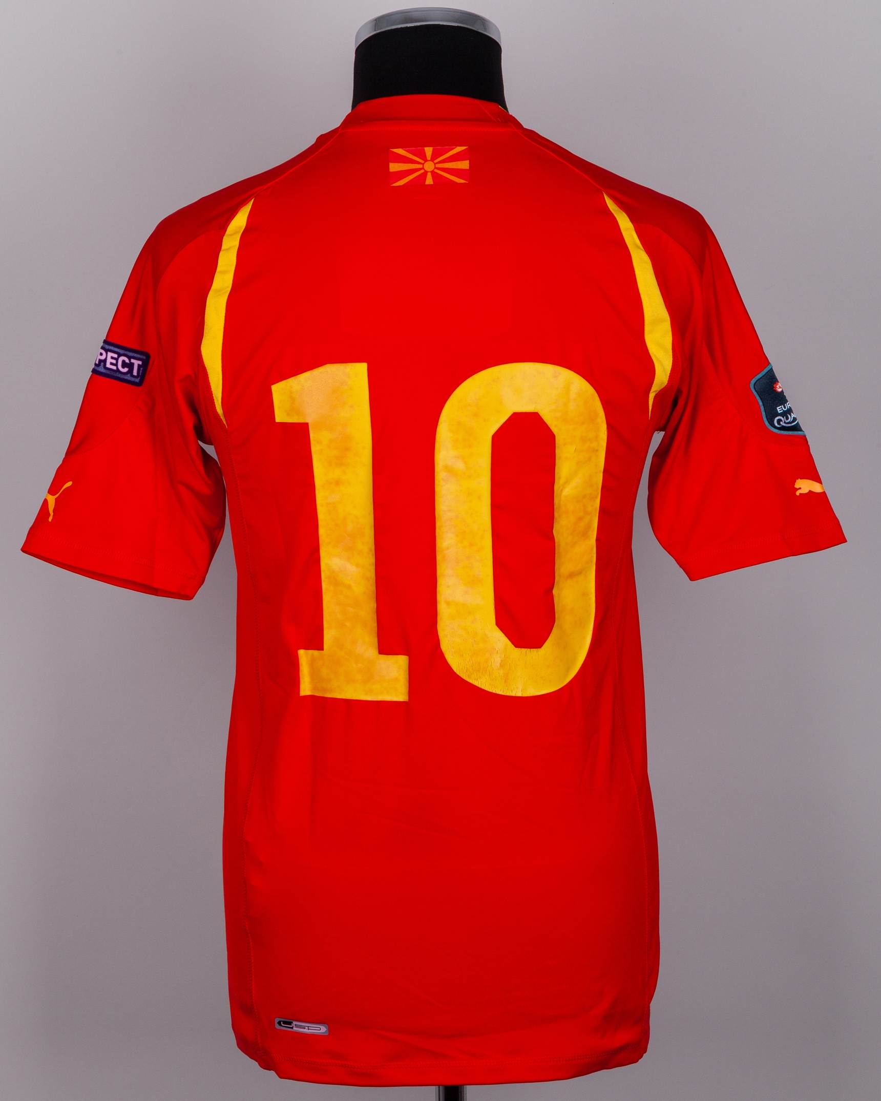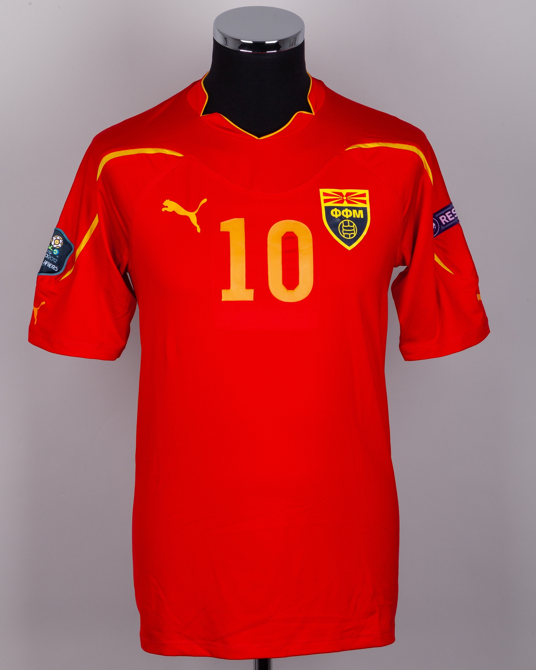 Goran Pandev red No.10 North Macedonia v. Republic of Ireland match worn short-sleeved shirt, 2011, Puma, L, with crew-neck collar and printed badge, the right sleeve with Euro 2012 Qualifiers flash and the left sleeve with respect flash, with some discolouration and some rub to print