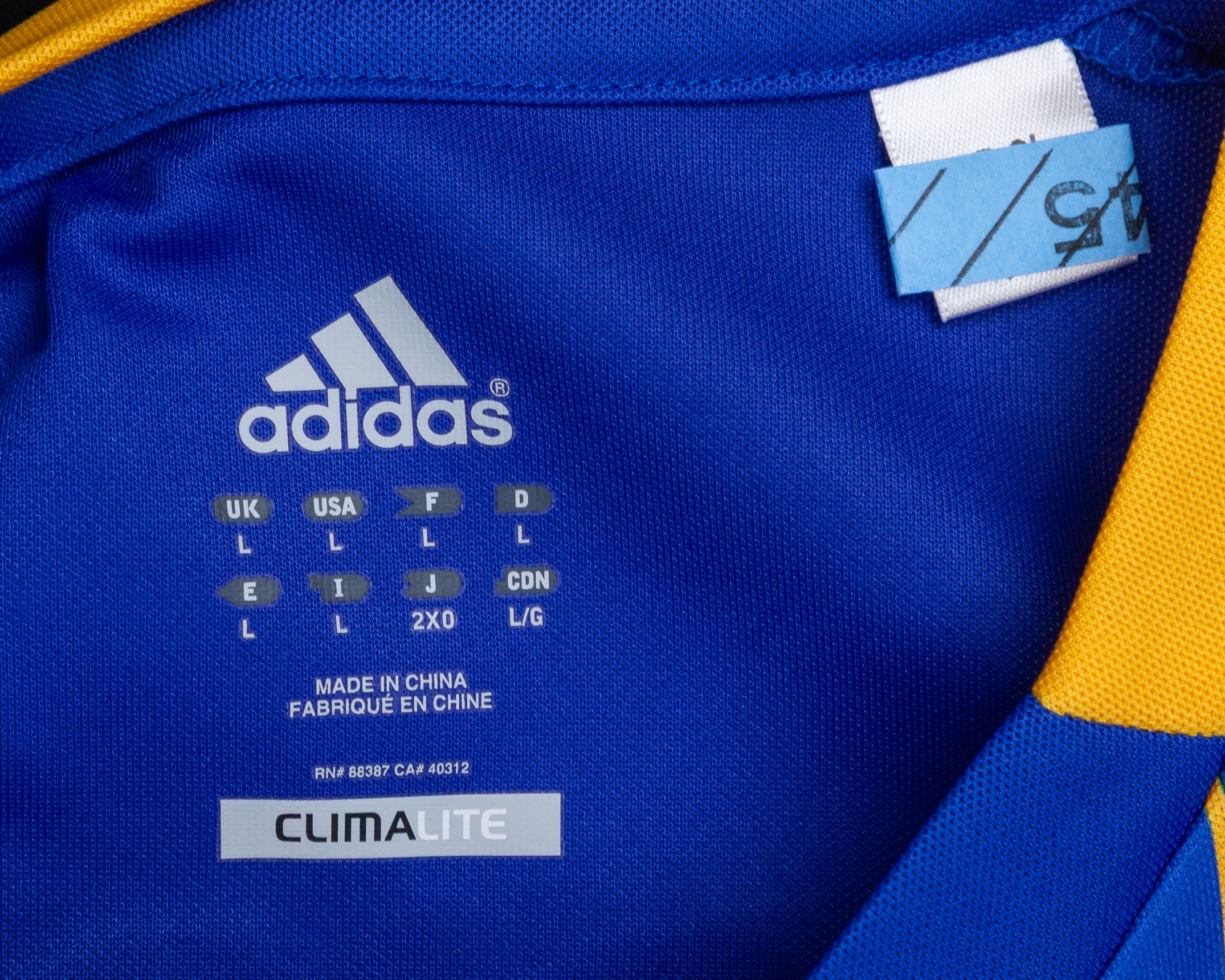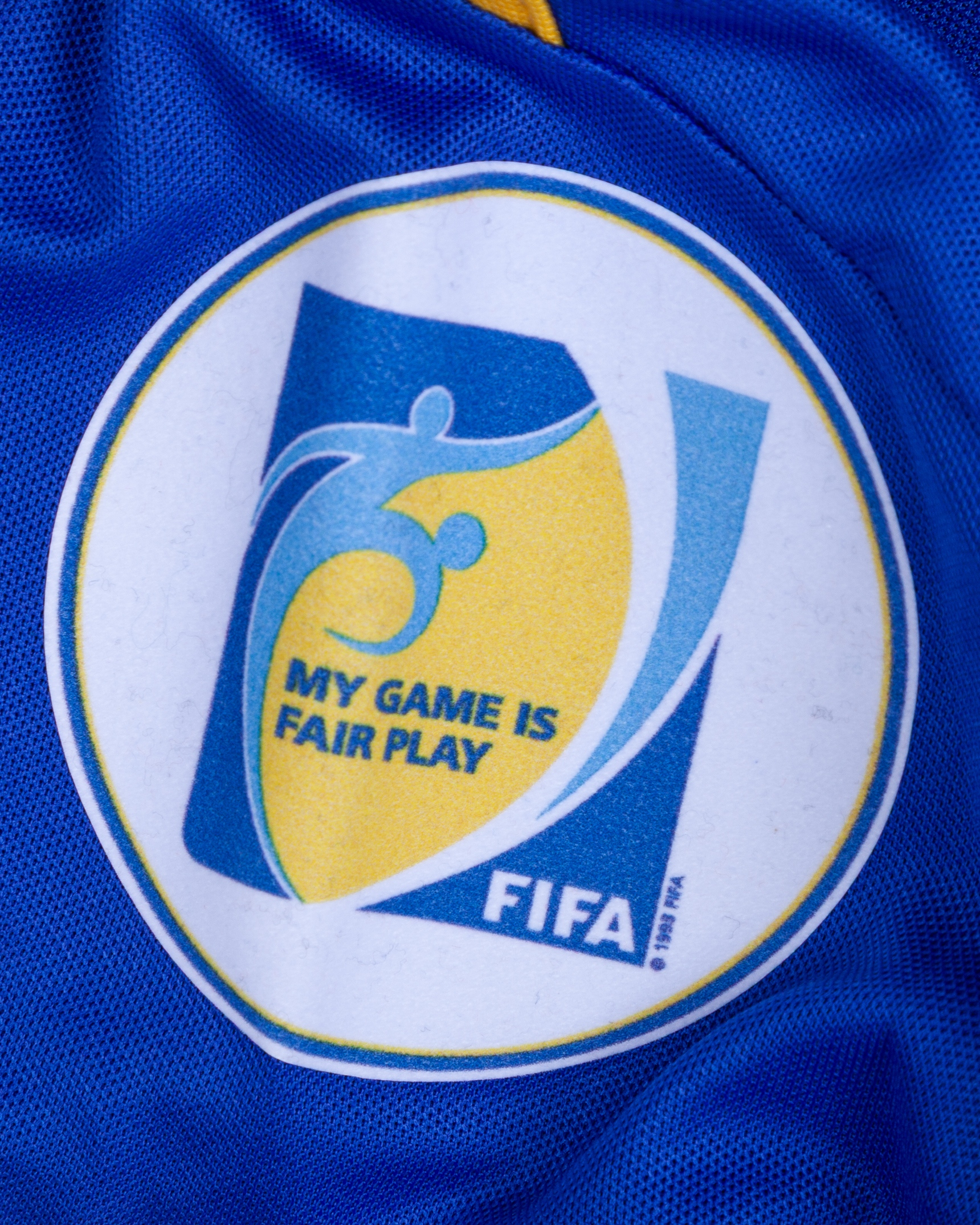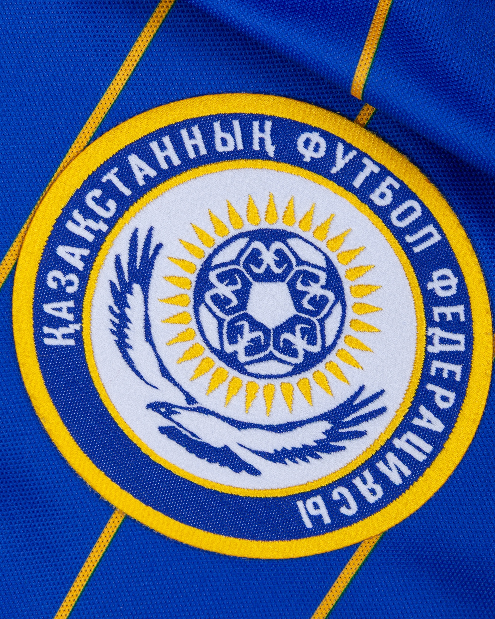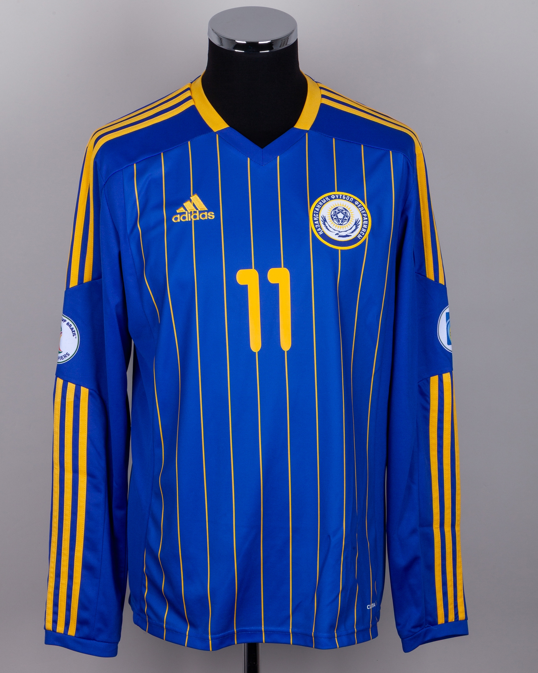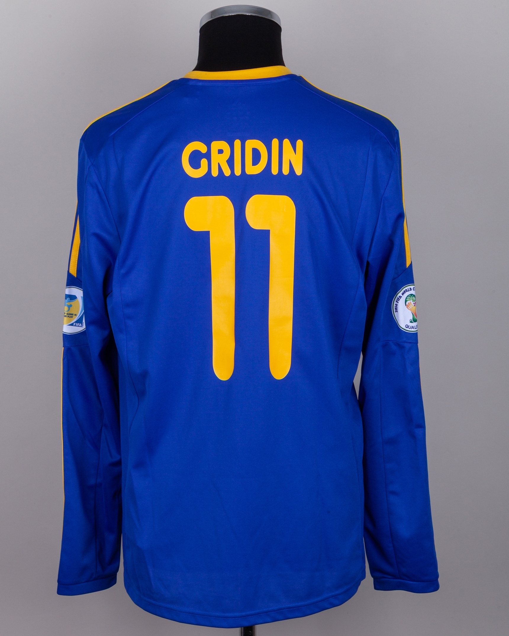Sergei Gridin blue and yellow No.11 Kazakhstan v. Republic of Ireland match worn long-sleeved shirt, 2012, Adidas, L, with v-neck collar and embroidered cloth badge, the reverse lettered GRIDIN, the right sleeve with 2014 FIFA World Cup Brazil Qualifier flash and the left sleeve with fair play flash