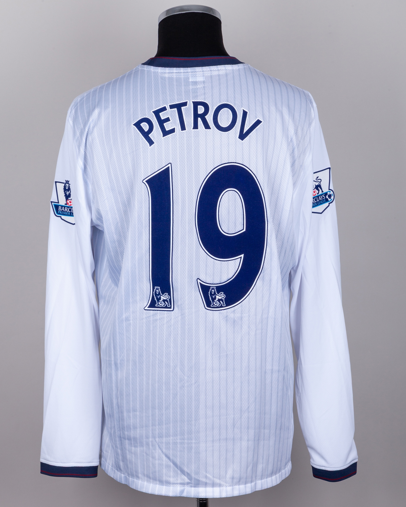 Stilyan Petrov white and grey No.19 Aston Villa long-sleeved shirt, 2009-10, Nike, XL, with crew-neck collar and embroidered cloth badge inscribed ACFC PREPARED, the reverse lettered PETROV, the sleeves with Barclays Premier League flashes