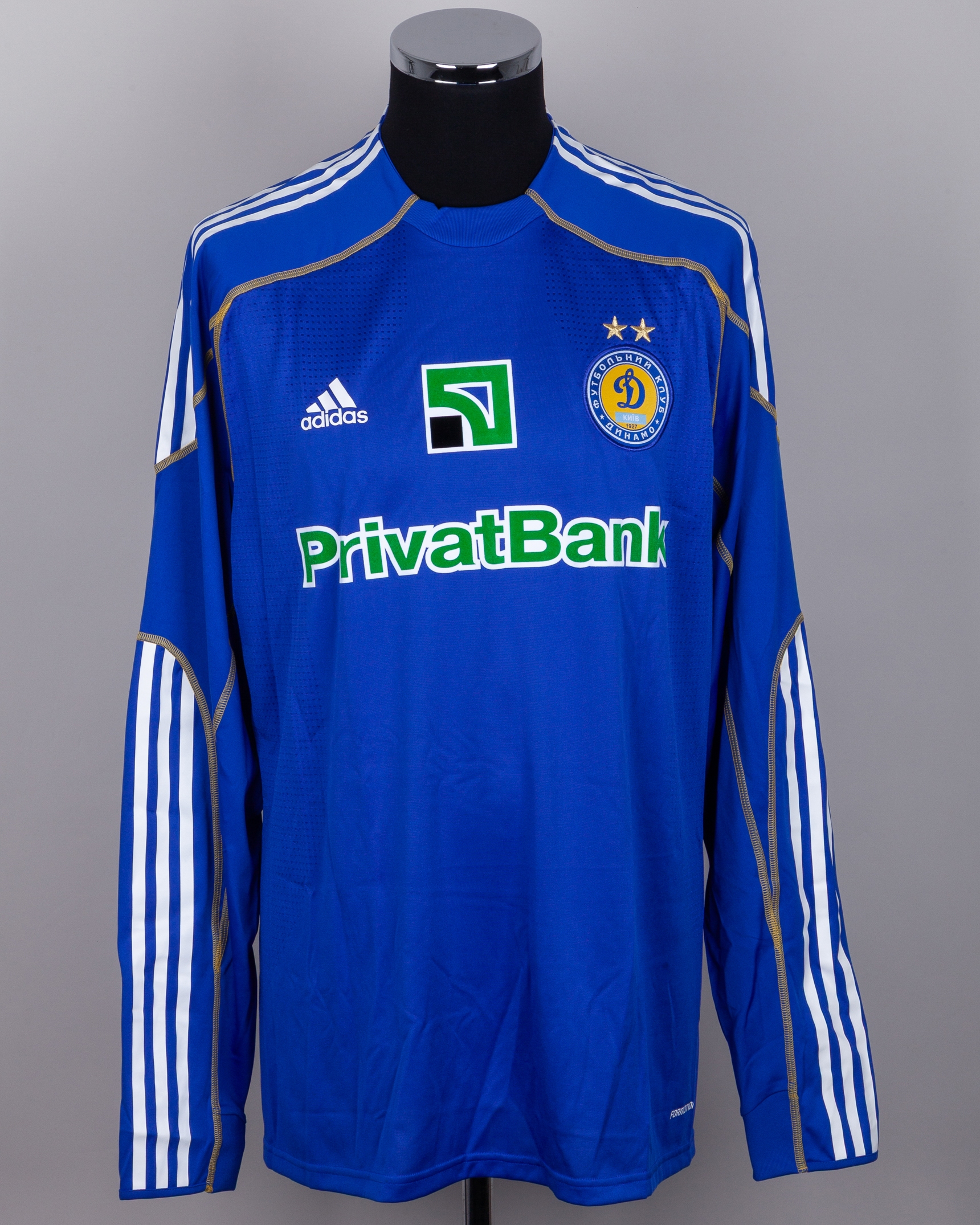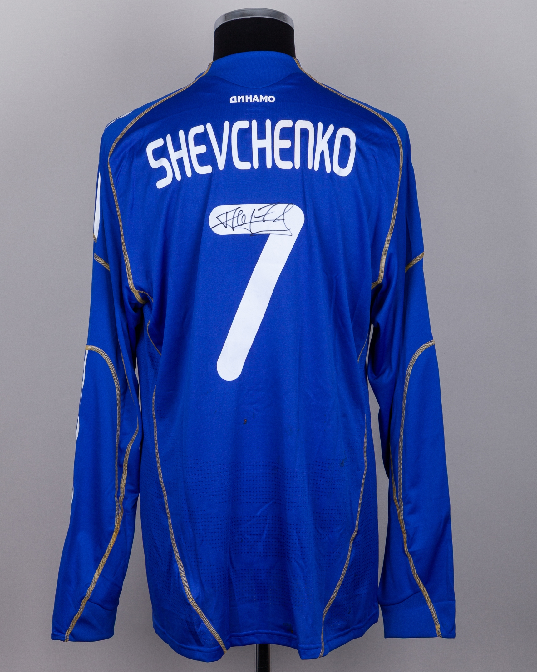 Andriy Shevchenko blue No.7 Dynamo Kiev v. Manchester City autographed long-sleeved shirt, 2011, Adidas, XL, with crew-neck collar and embroidered cloth badge, the reverse lettered SHEVCHENKO, autographed on the number, spare blood shirt, with some staining to the back