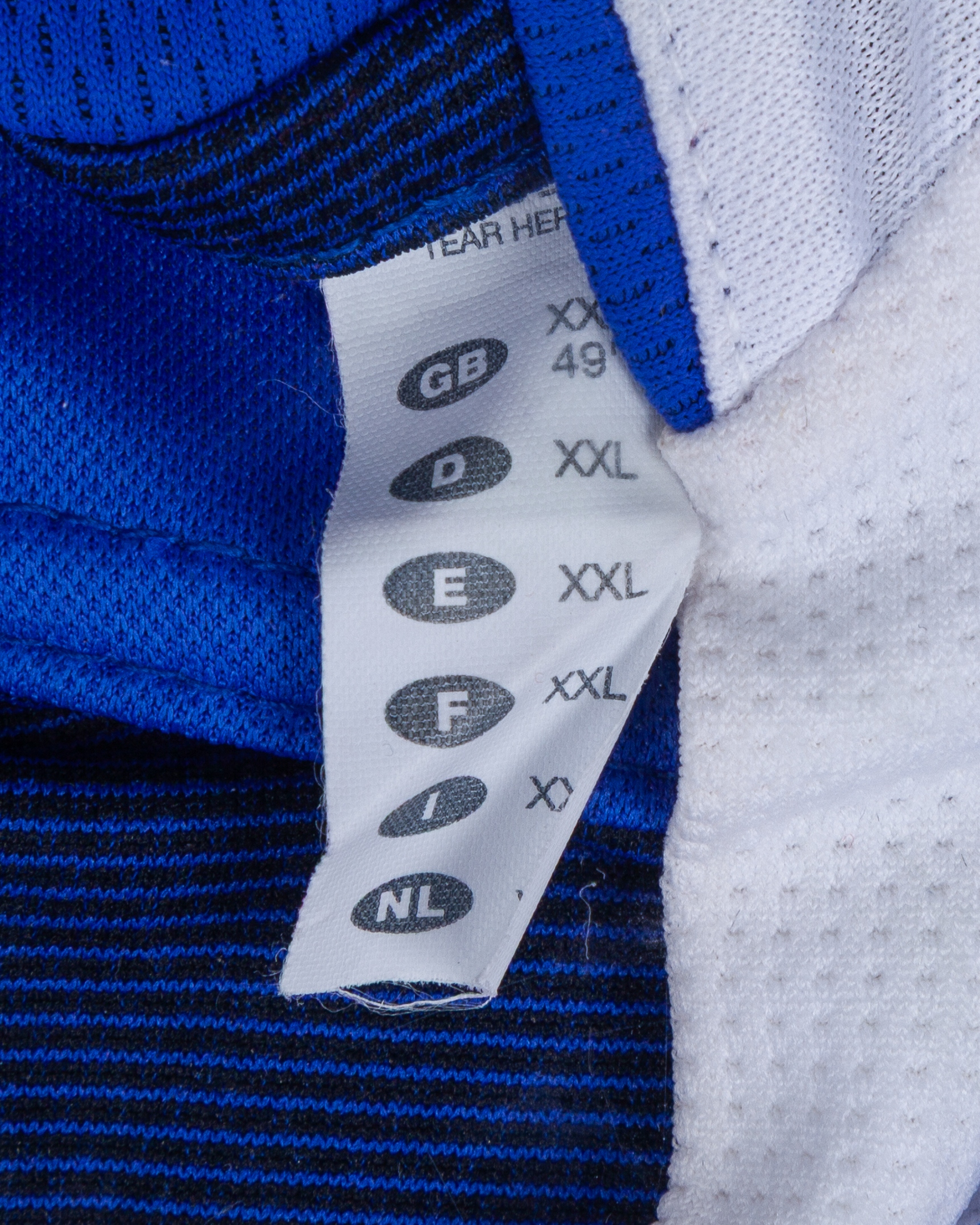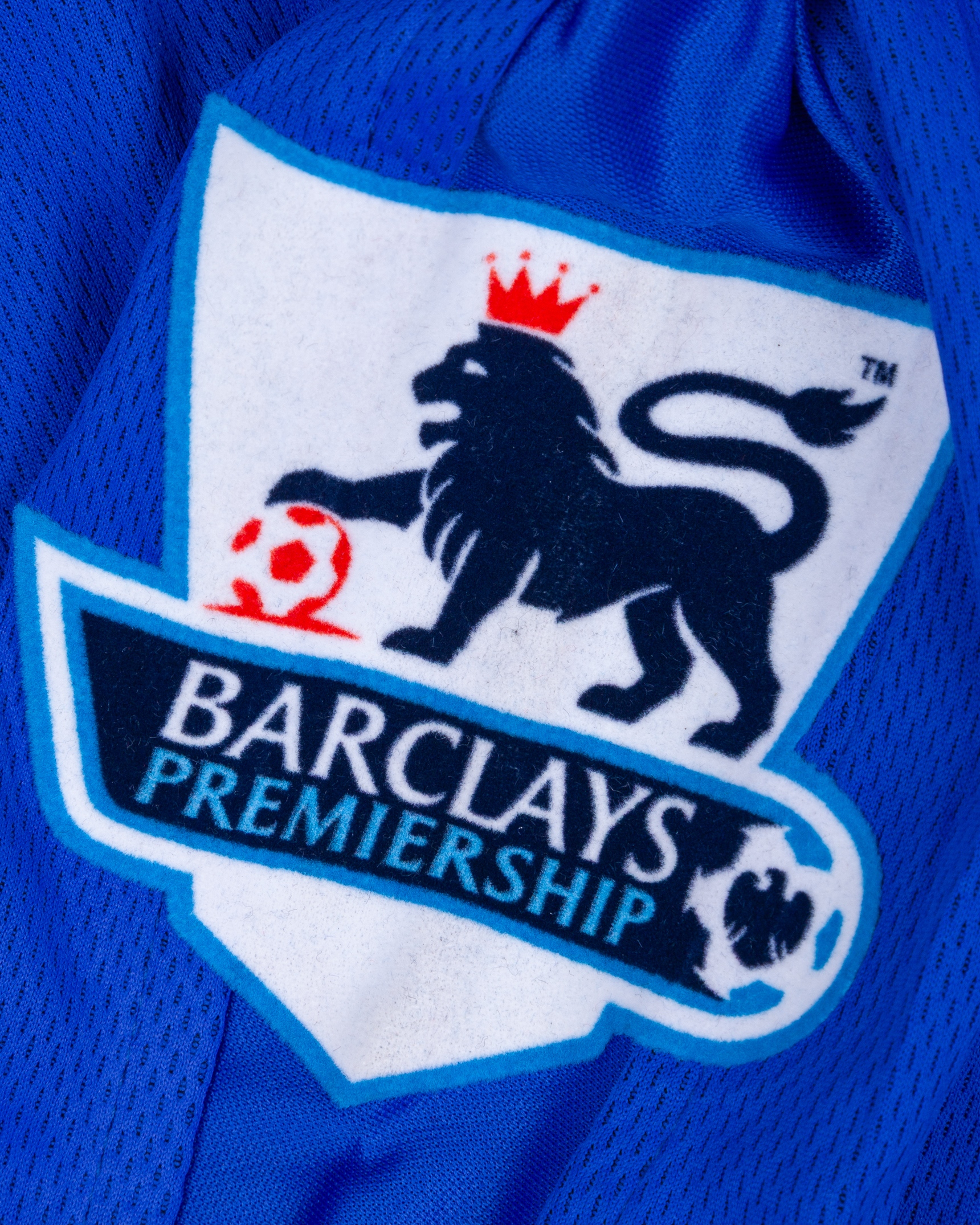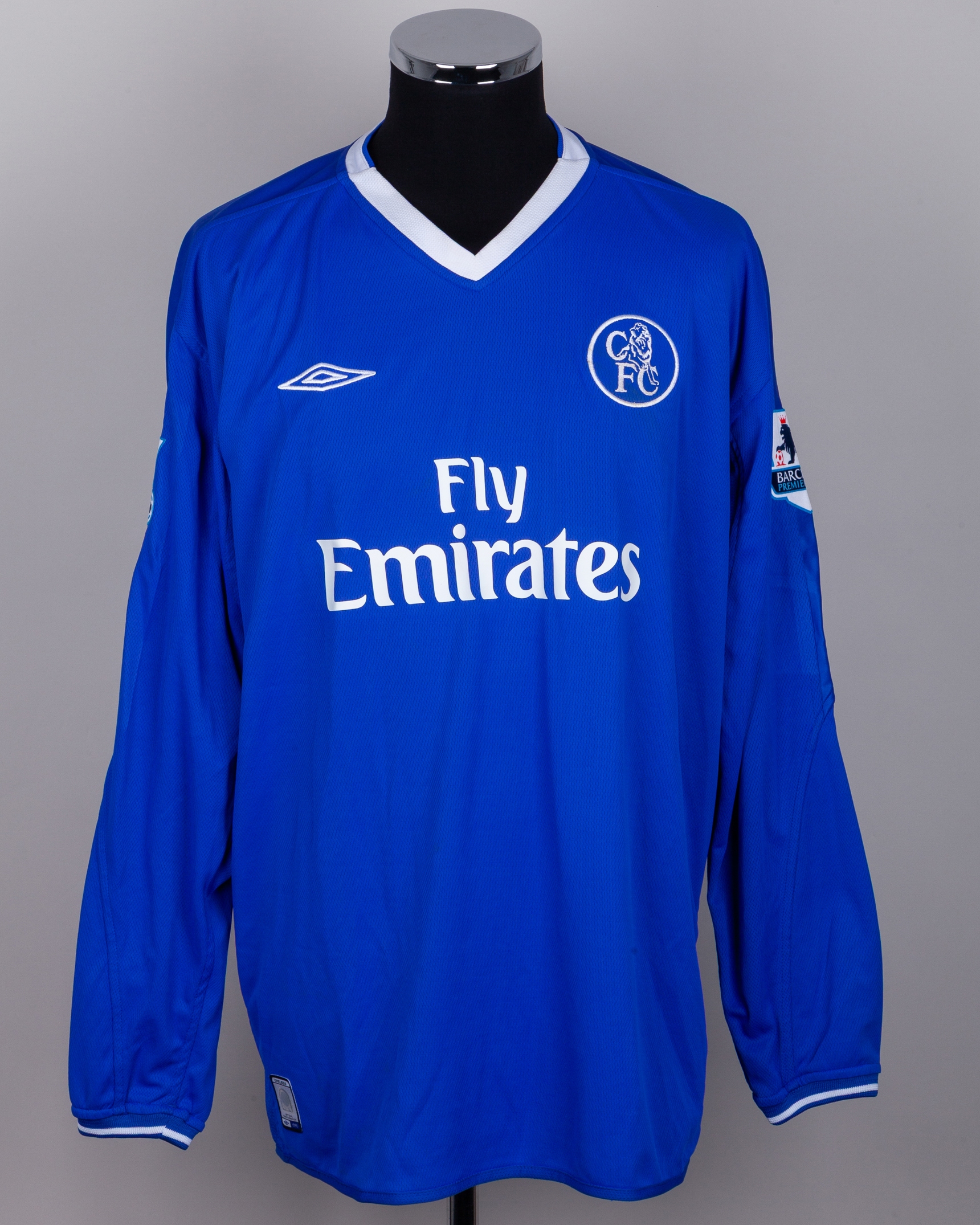Didier Drogba blue No.15 Chelsea v. Tottenham Hotspur match worn long-sleeved shirt, 2005, Umbro, XXL, with v-neck collar and embroidered badge inscribed CFC, the reverse lettered DROGBA, the sleeves with Barclays Premiership flashes