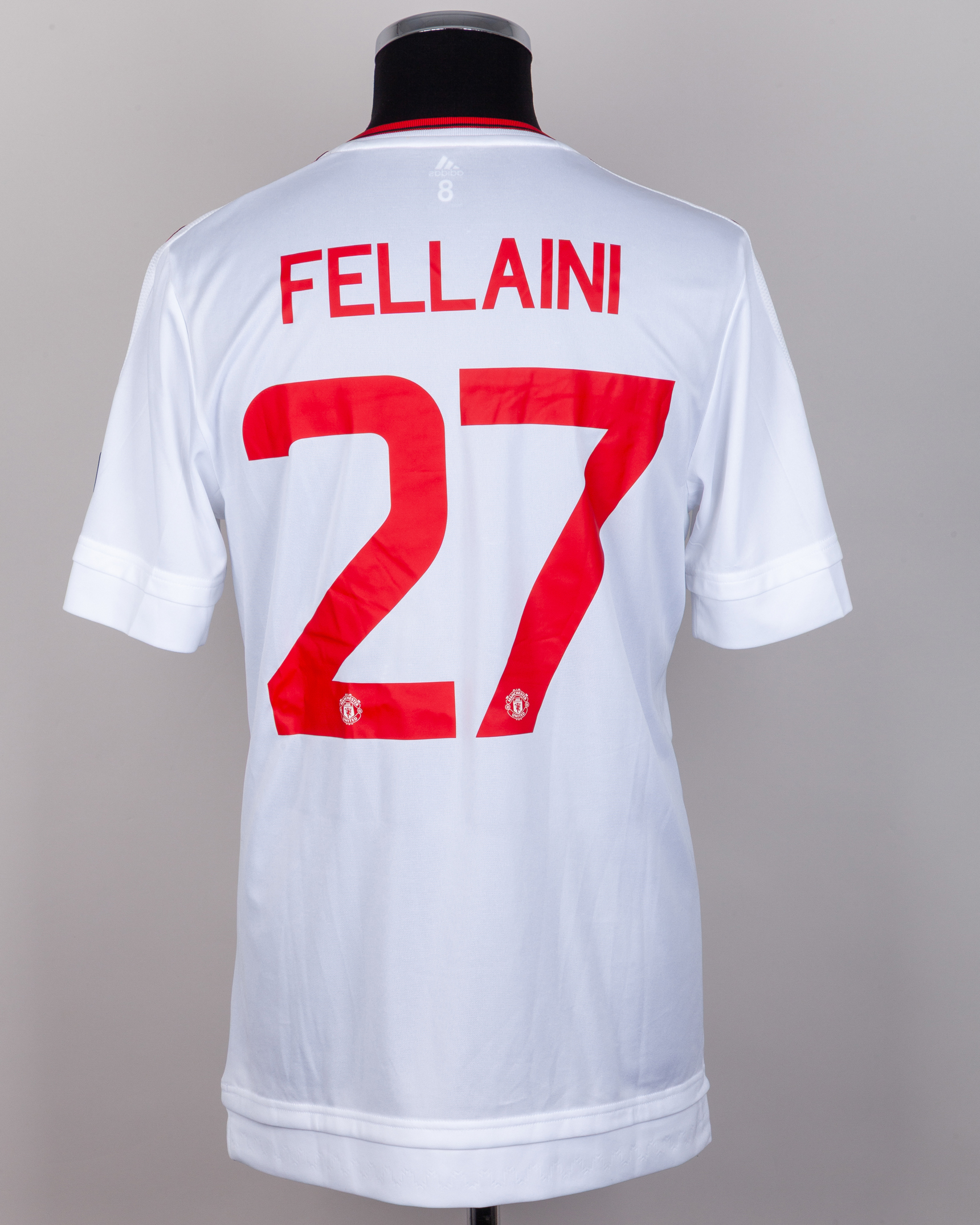 Marouane Fellaini white No.27 Manchester United v. Liverpool short-sleeved shirt, 2016, Adidas, 8, with v-neck collar and printed badge, the reverse lettered FELLAINI, the right sleeve with Europa League flash and the left sleeve with respect flash