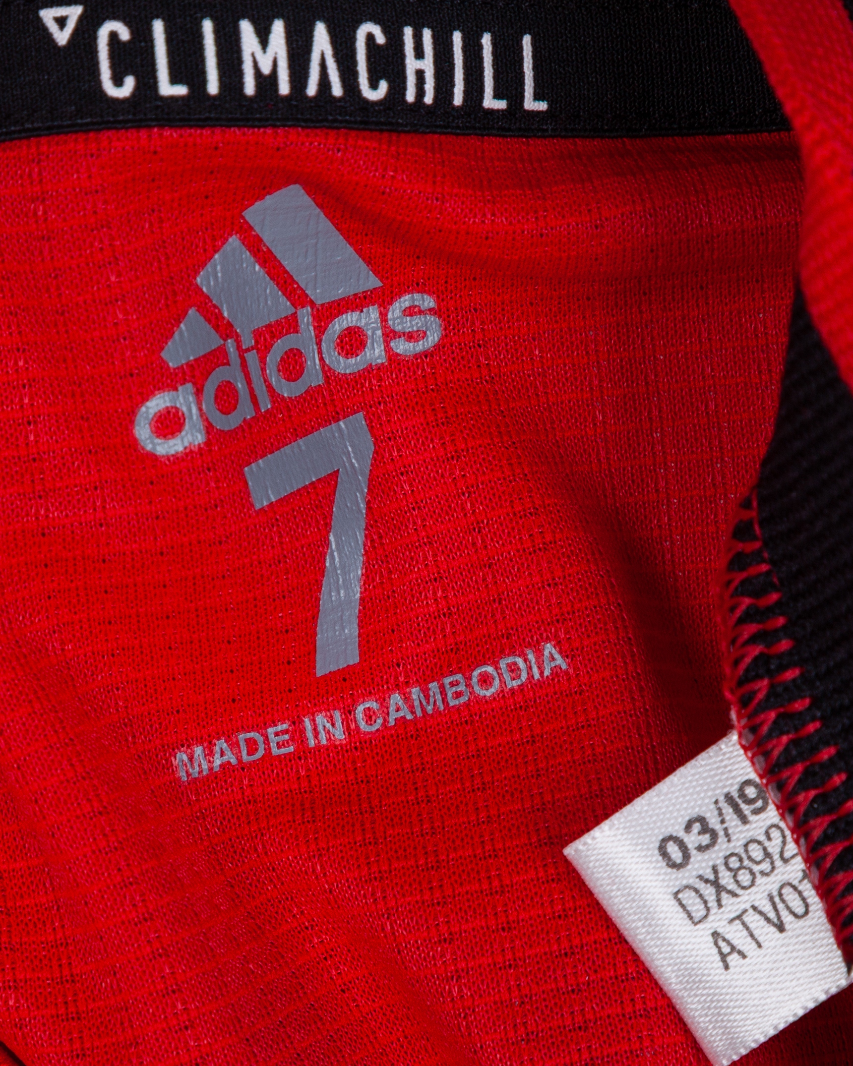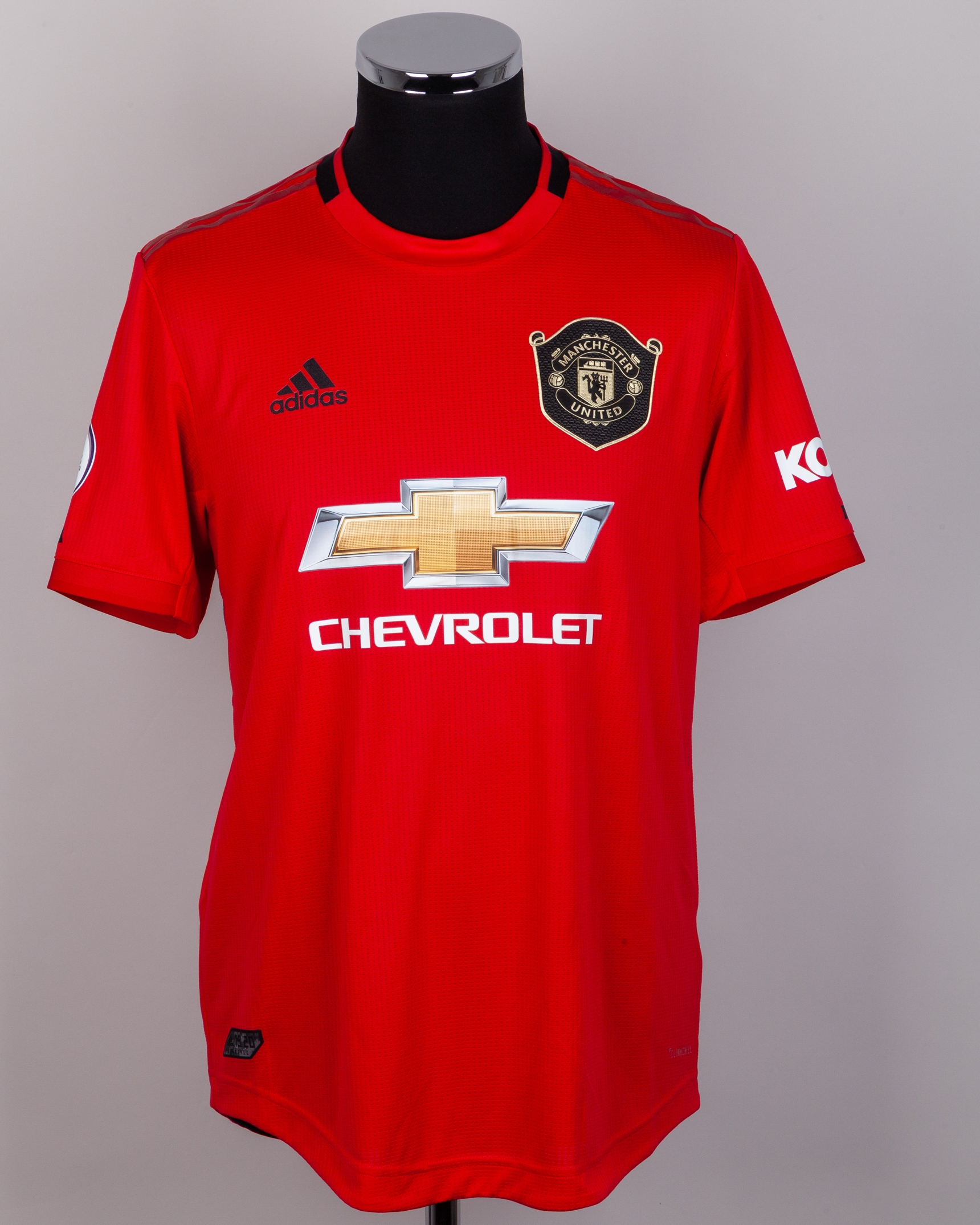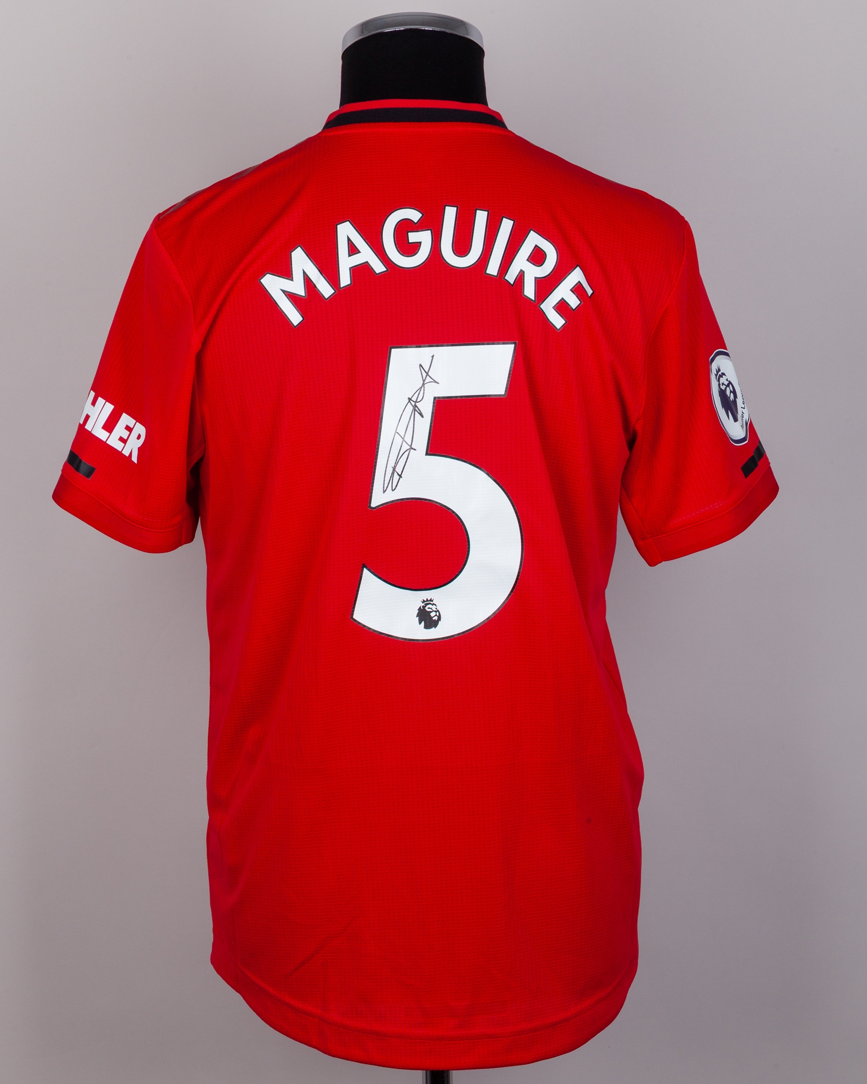 Harry Maguire red No.5 Manchester United v. Leicester City short-sleeved shirt, 2019-20, Adidas, 7, with crew-neck collar and printed badge, the reverse lettered MAGUIRE, autographed on the number, the right sleeve with Premier League flash