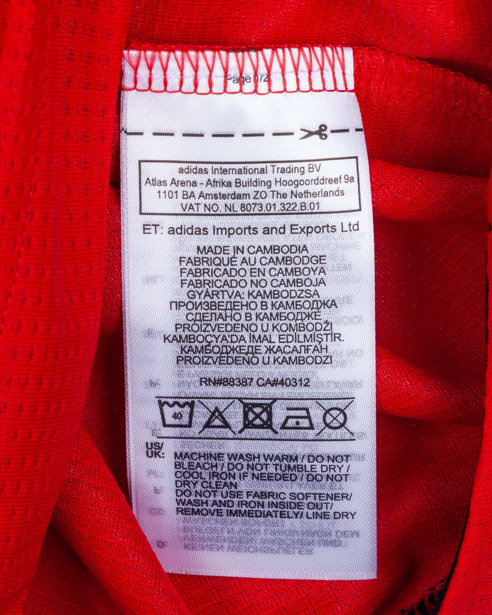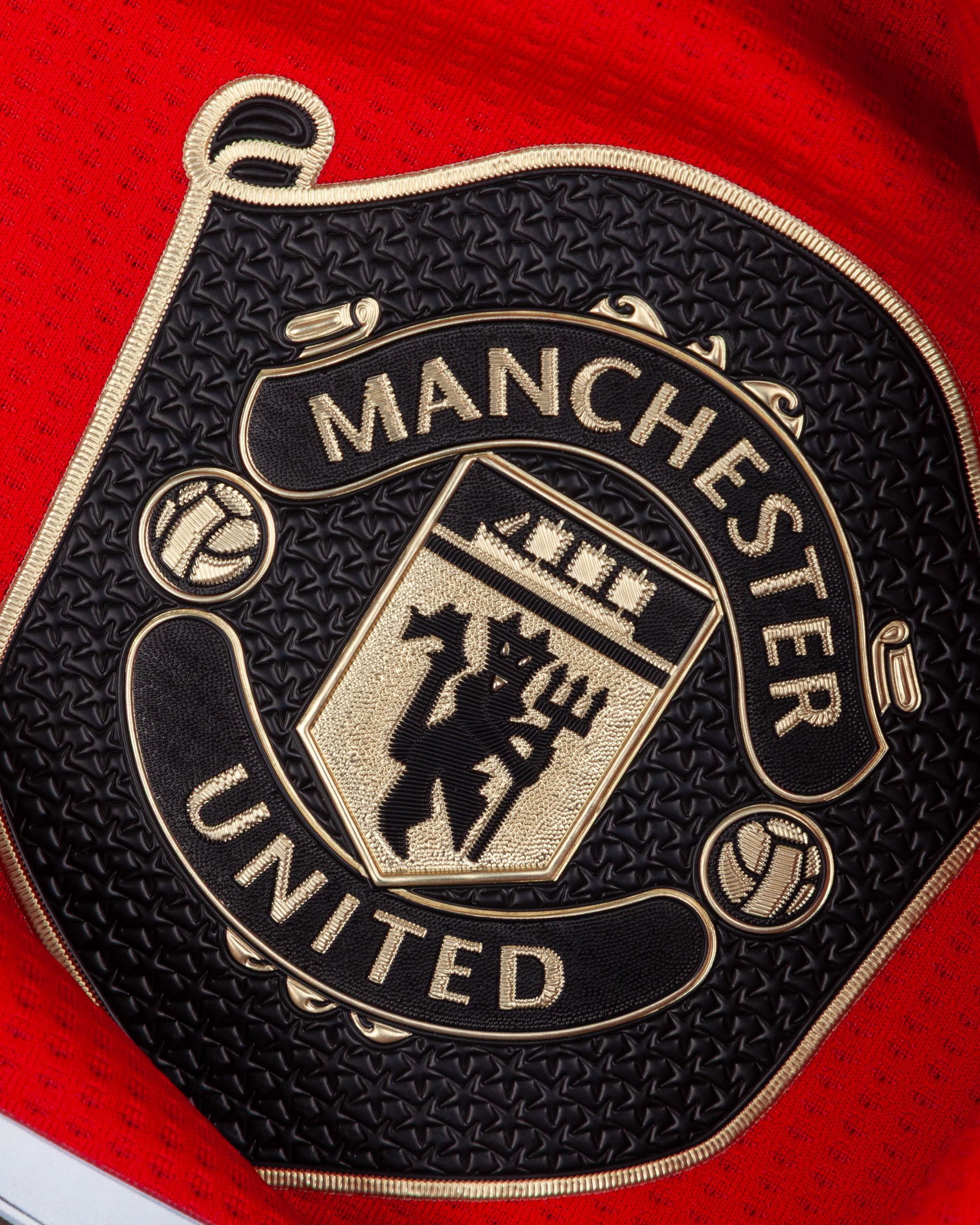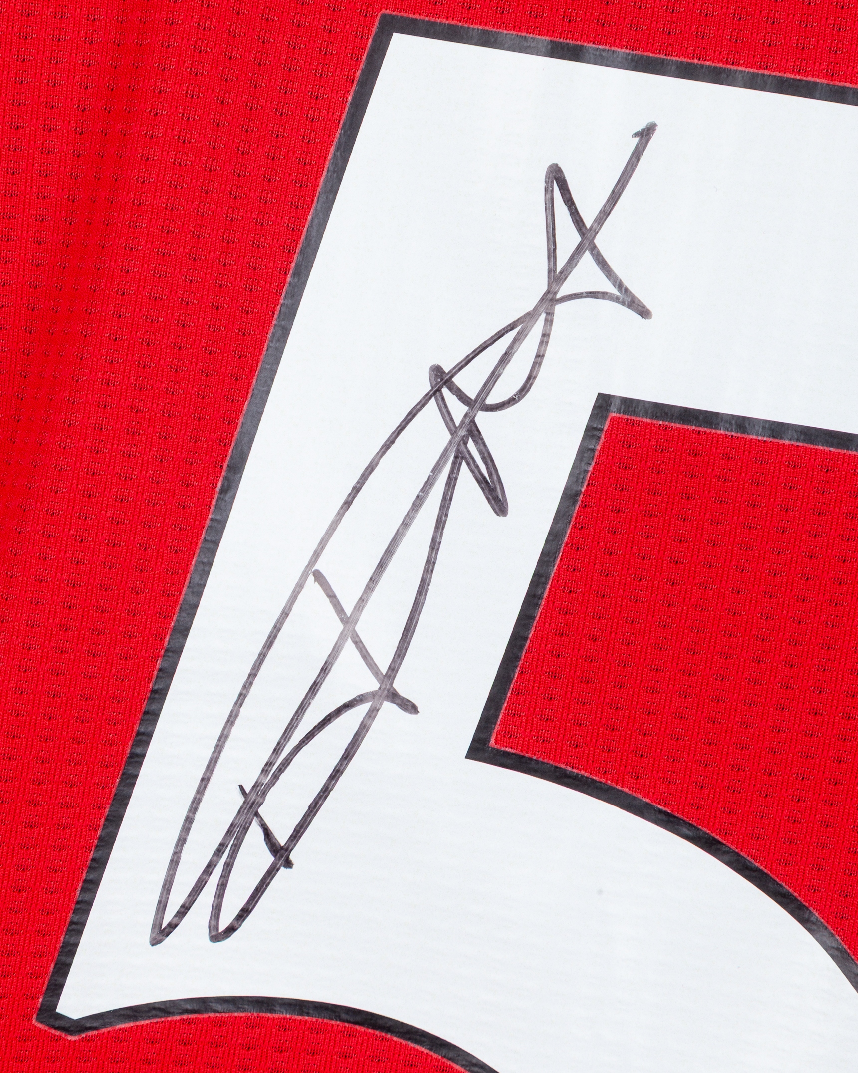 Harry Maguire red No.5 Manchester United v. Leicester City short-sleeved shirt, 2019-20, Adidas, 7, with crew-neck collar and printed badge, the reverse lettered MAGUIRE, autographed on the number, the right sleeve with Premier League flash