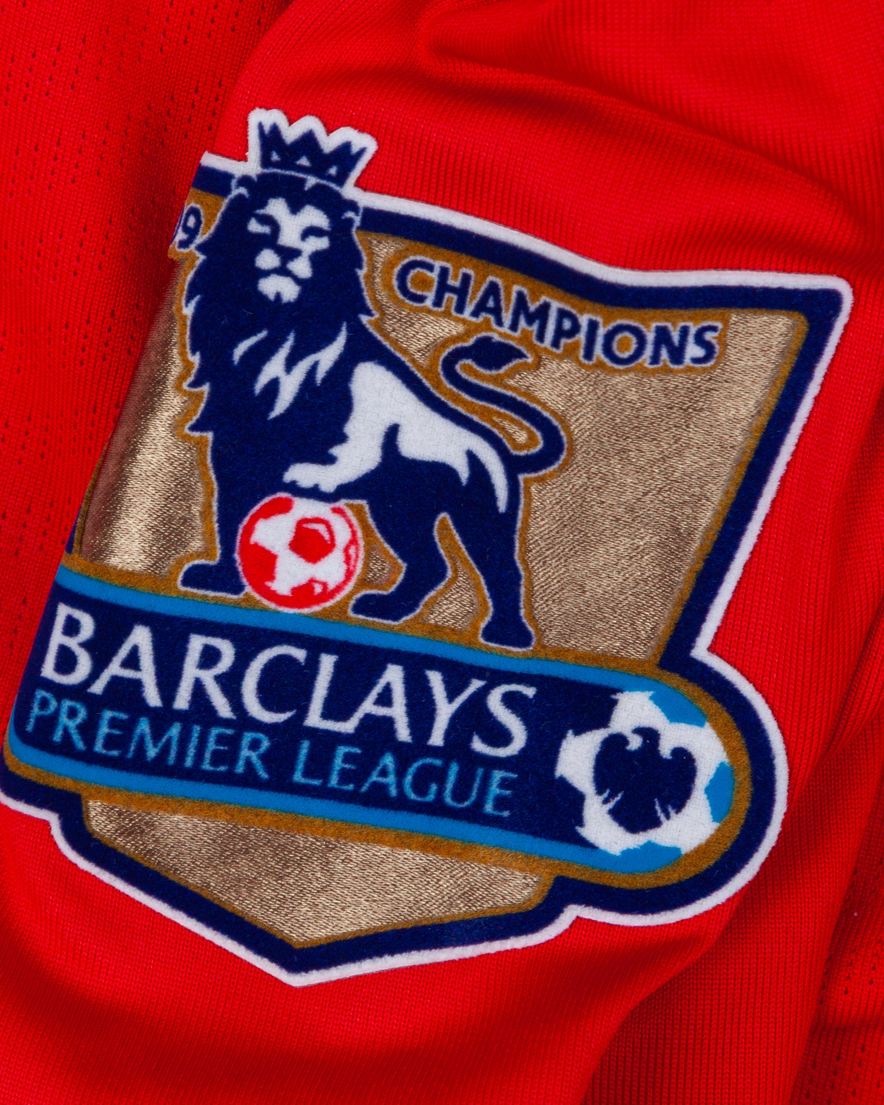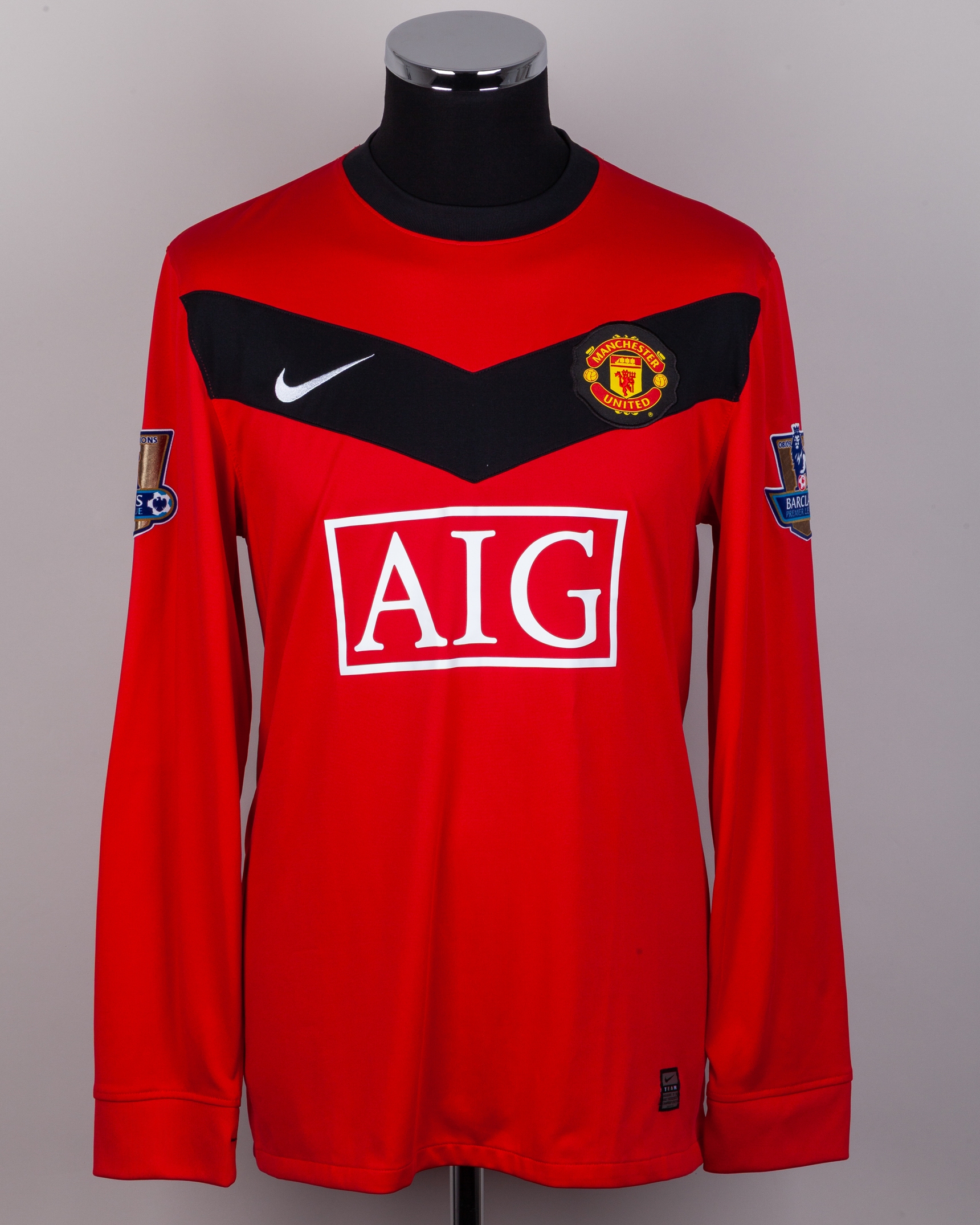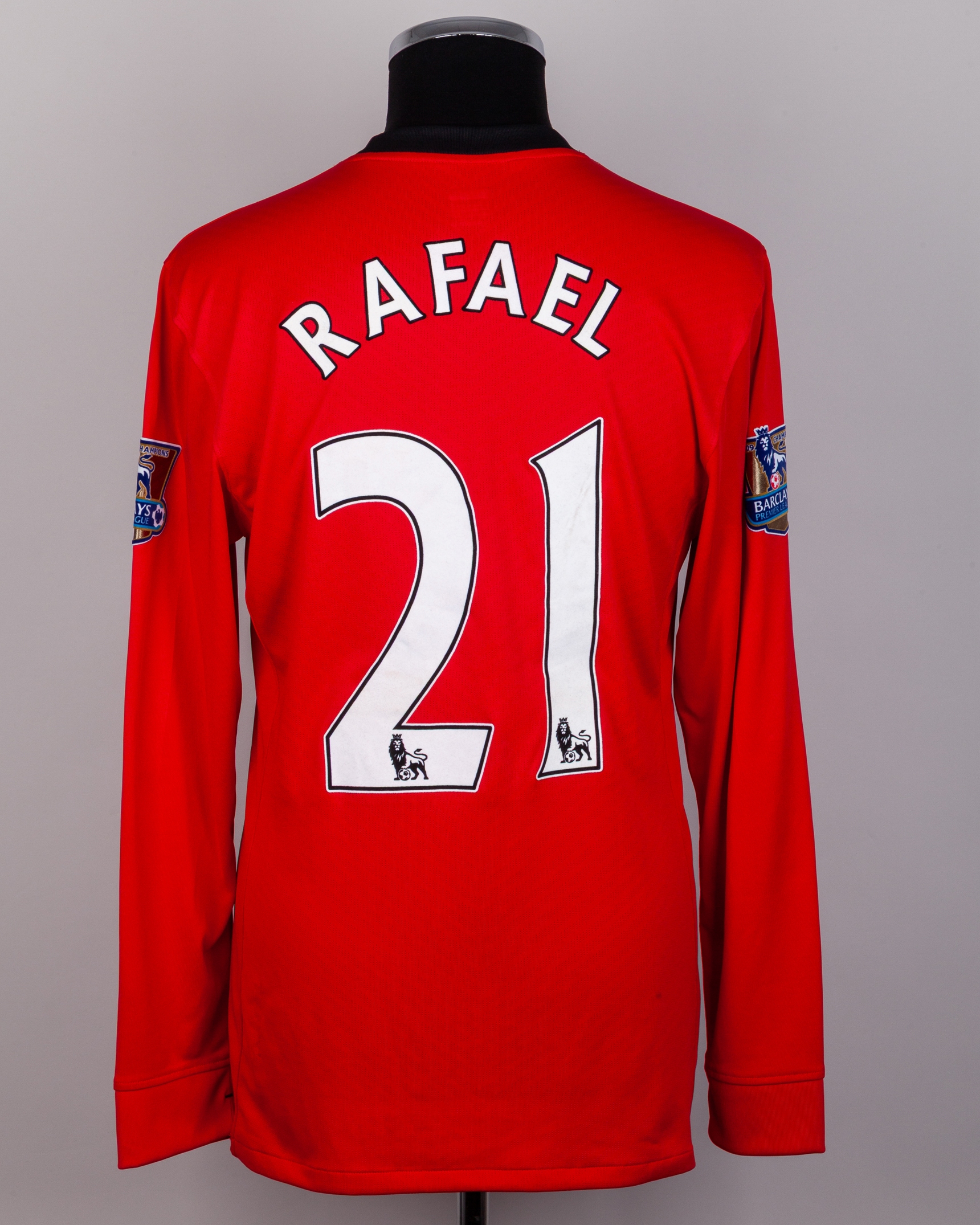 Rafael red No.21 Manchester United long-sleeved shirt, 2009-10, Nike, L, with crew-neck collar and embroidered cloth badge inscribed MANCHESTER UNITED, the reverse lettered RAFAEL, the sleeves with 08/09 Champions Barclays Premier League flashes