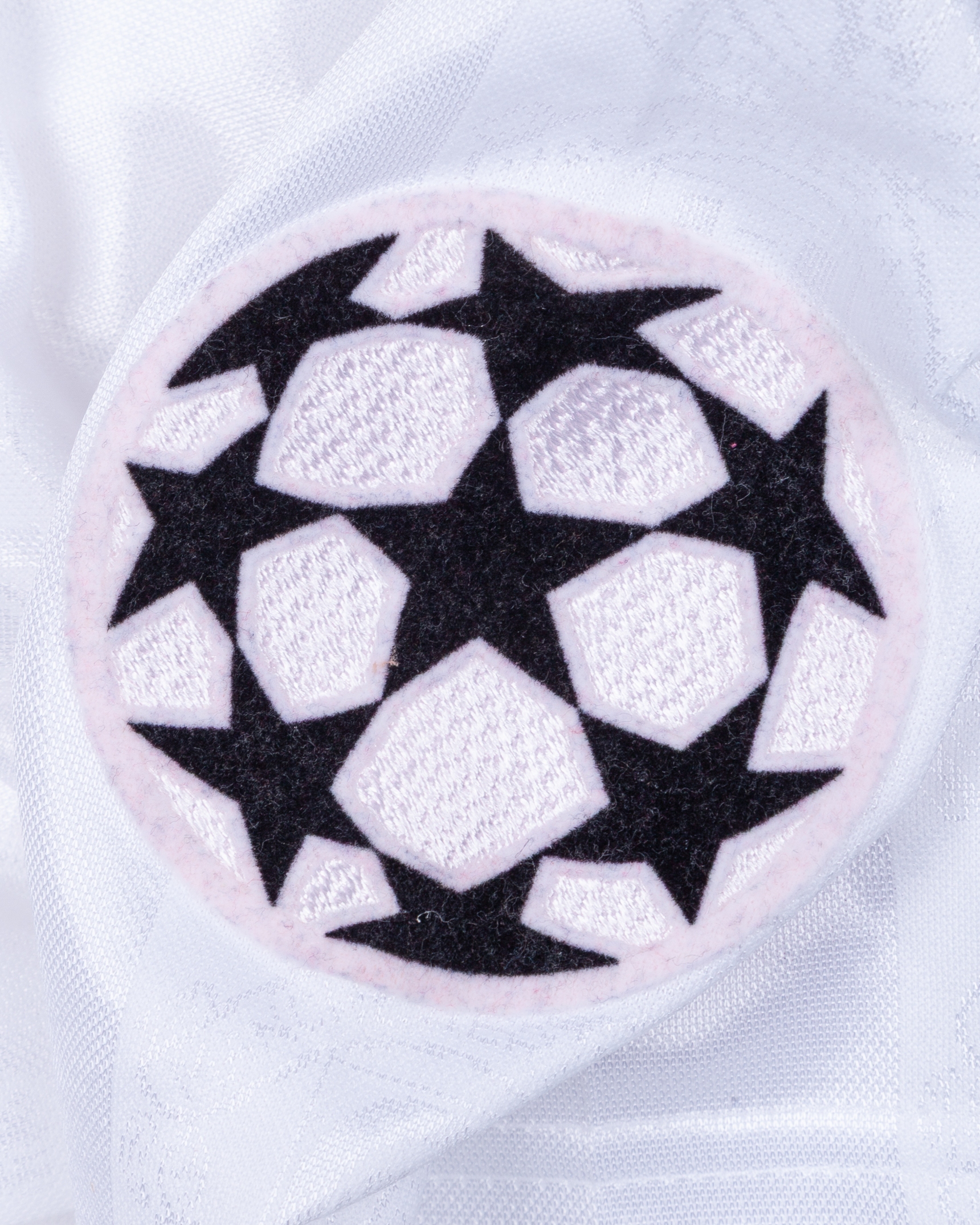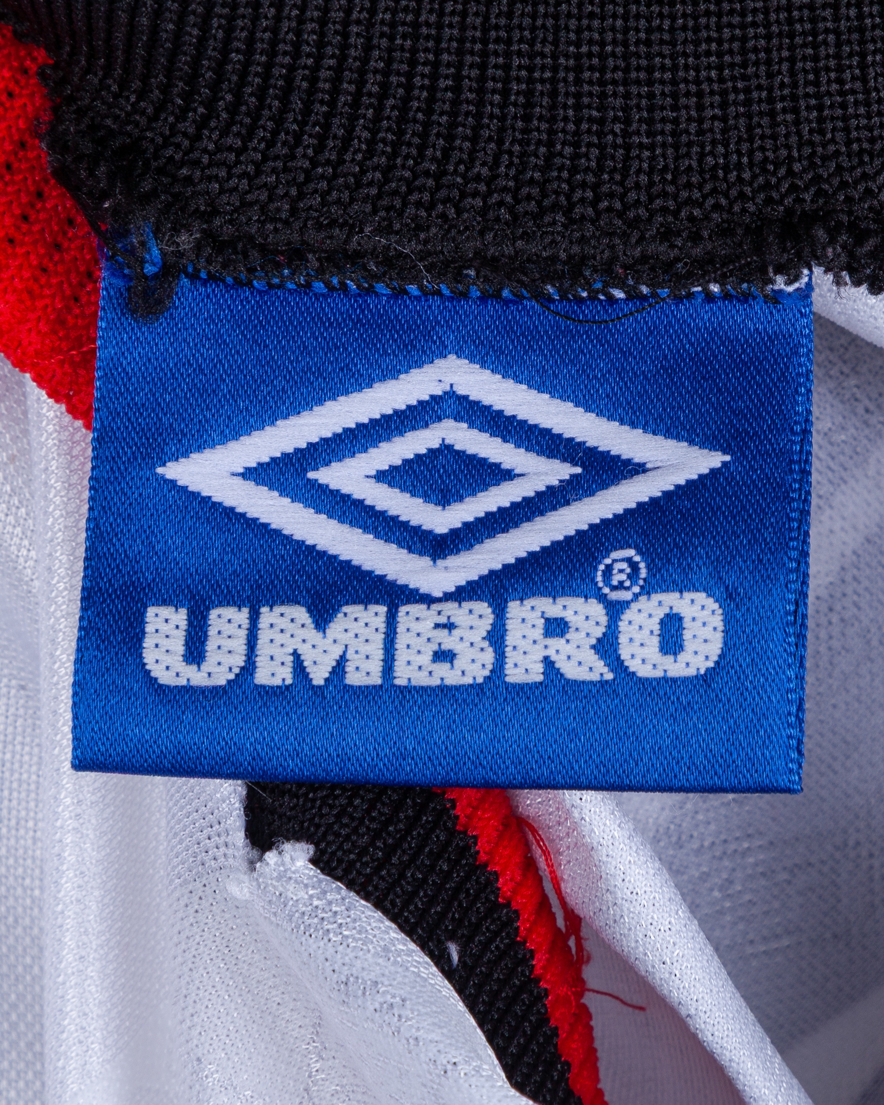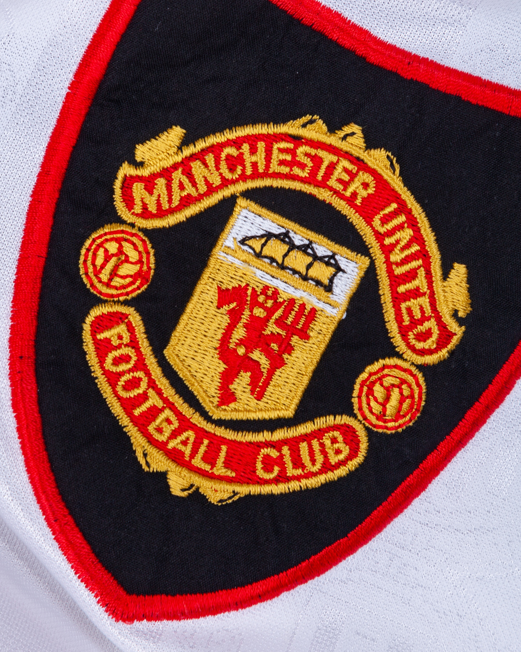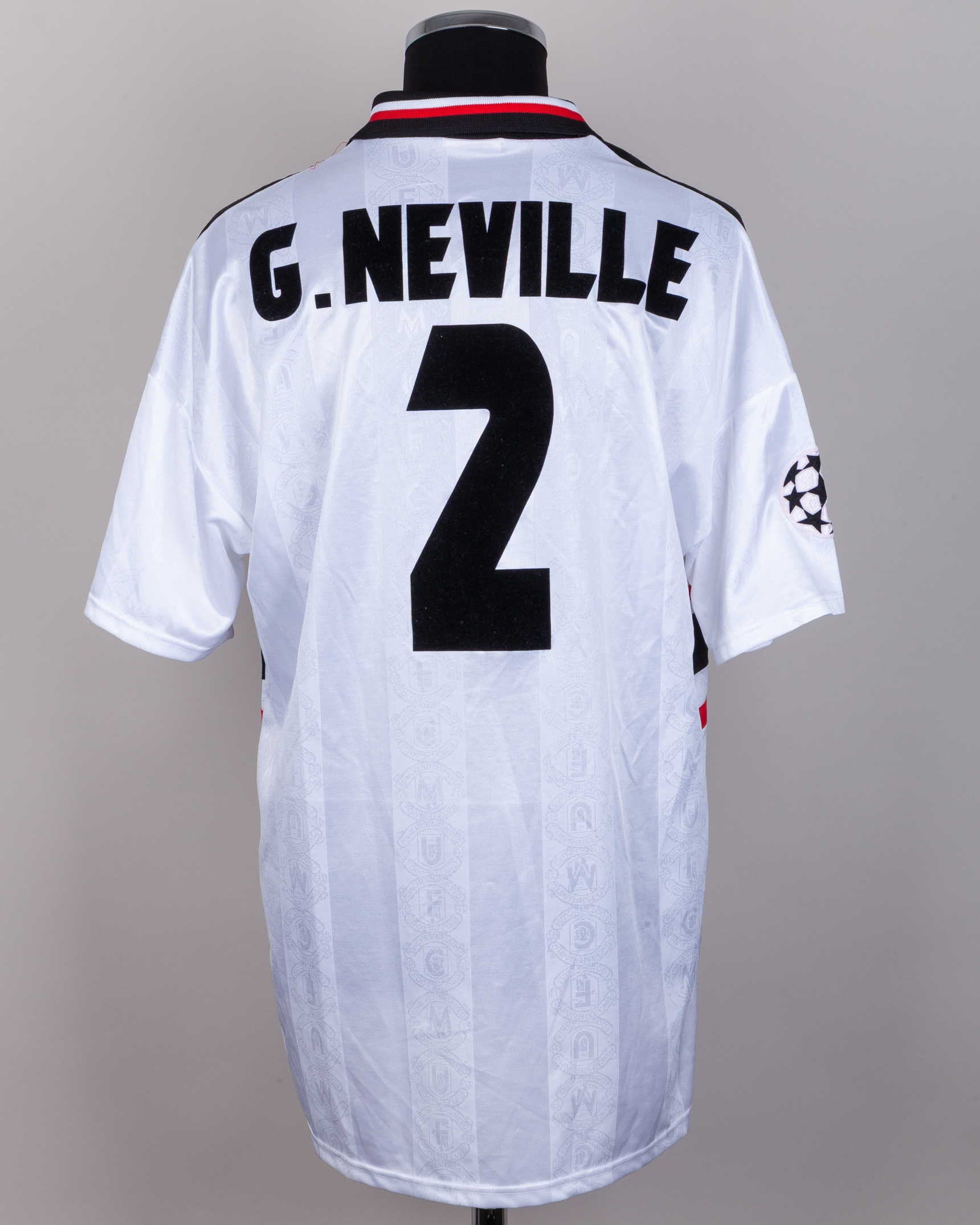 Gary Neville white No.2 Manchester United Champions League short-sleeved shirt, 1997-99, Umbro, XL, with v-neck collar and embroidered badge inscribed MANCHESTER UNITED FOOTBALL CLUB, the reverse lettered G.NEVILLE, the right sleeve with Champions League flash, with frayed threads, hole on the collar and flash discoloured