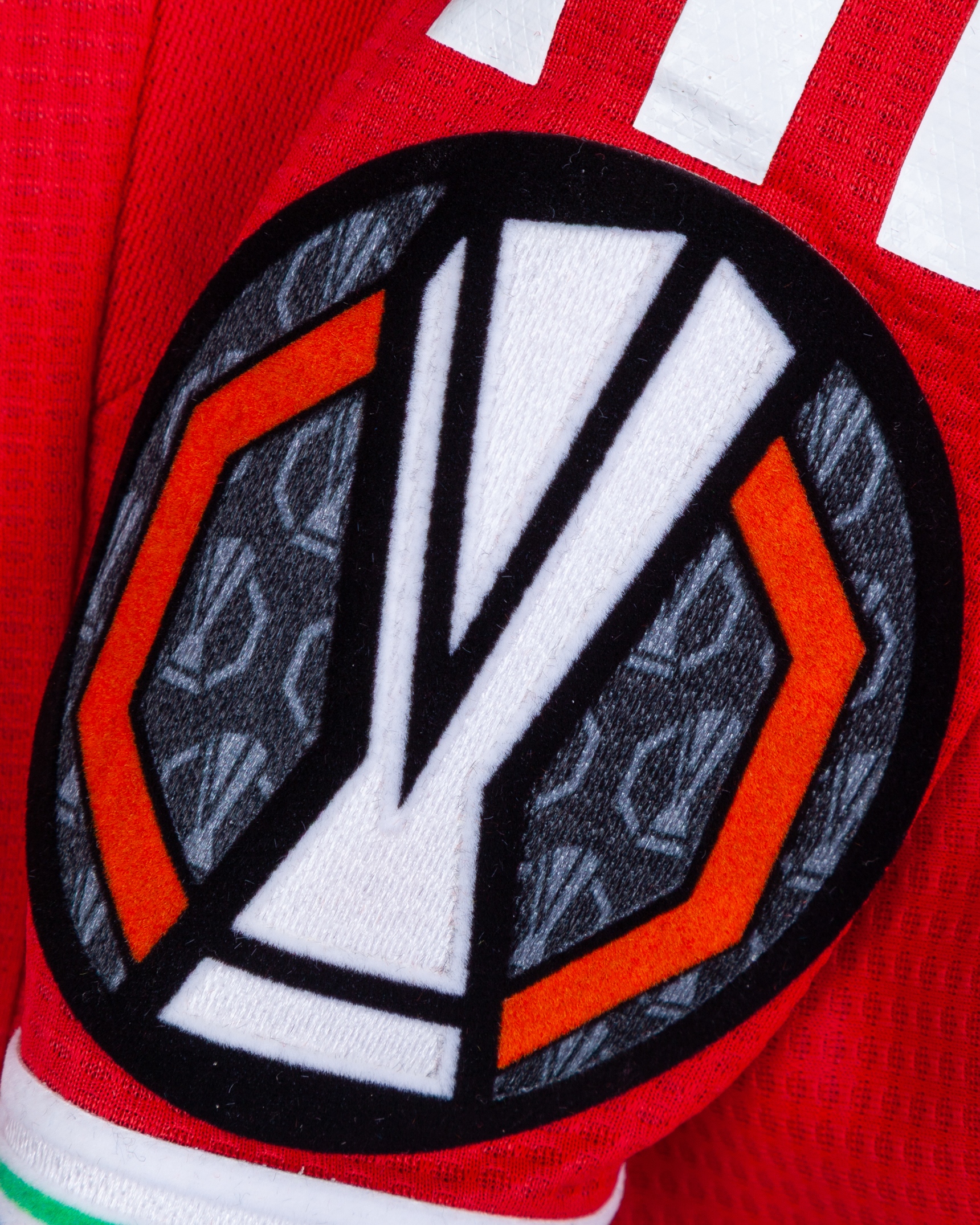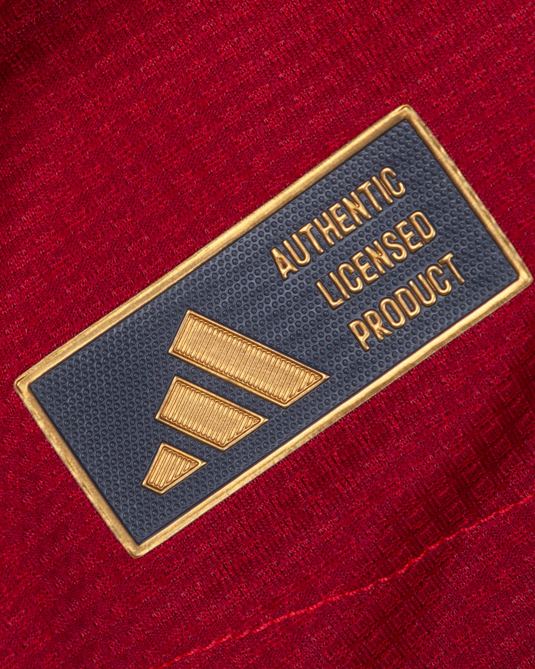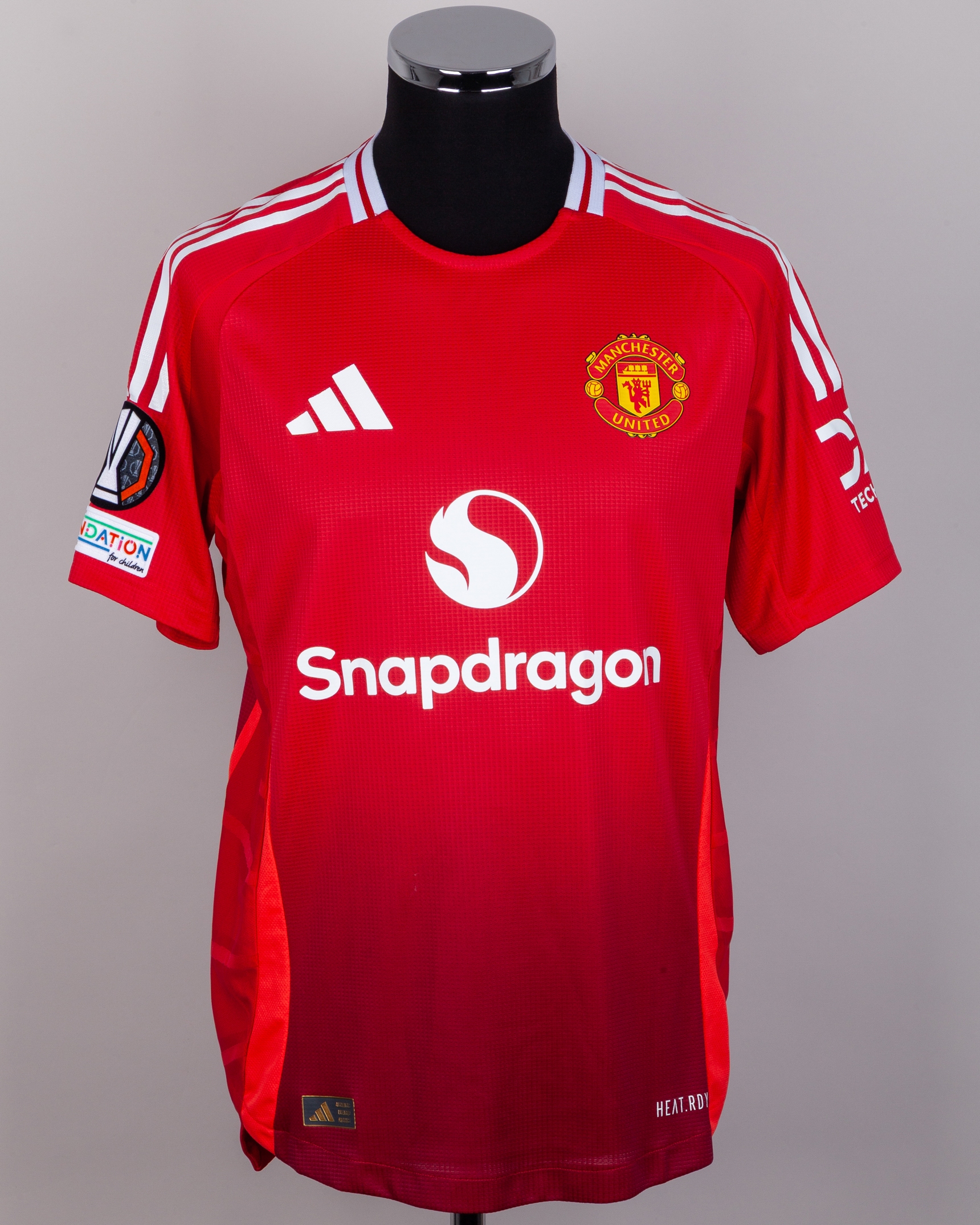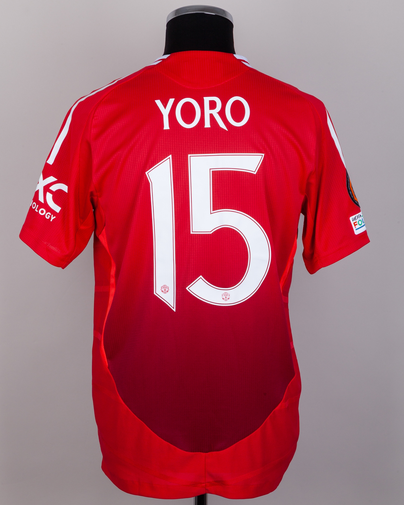 Leny Yoro red No.15 Manchester United v. Athletic Bilbao Europa League short-sleeved shirt, 2024-25, Adidas, L, with crew-neck collar and printed badge, the reverse lettered YORO, the right sleeve with Europa League and UEFA foundation flashes