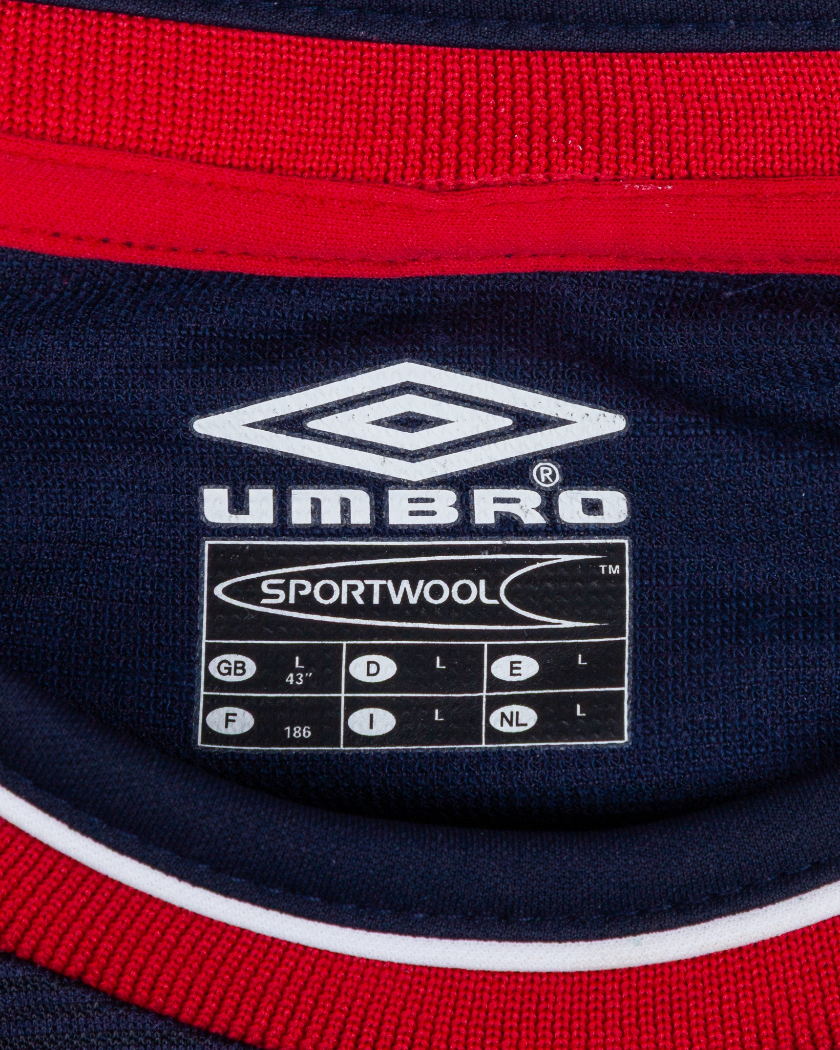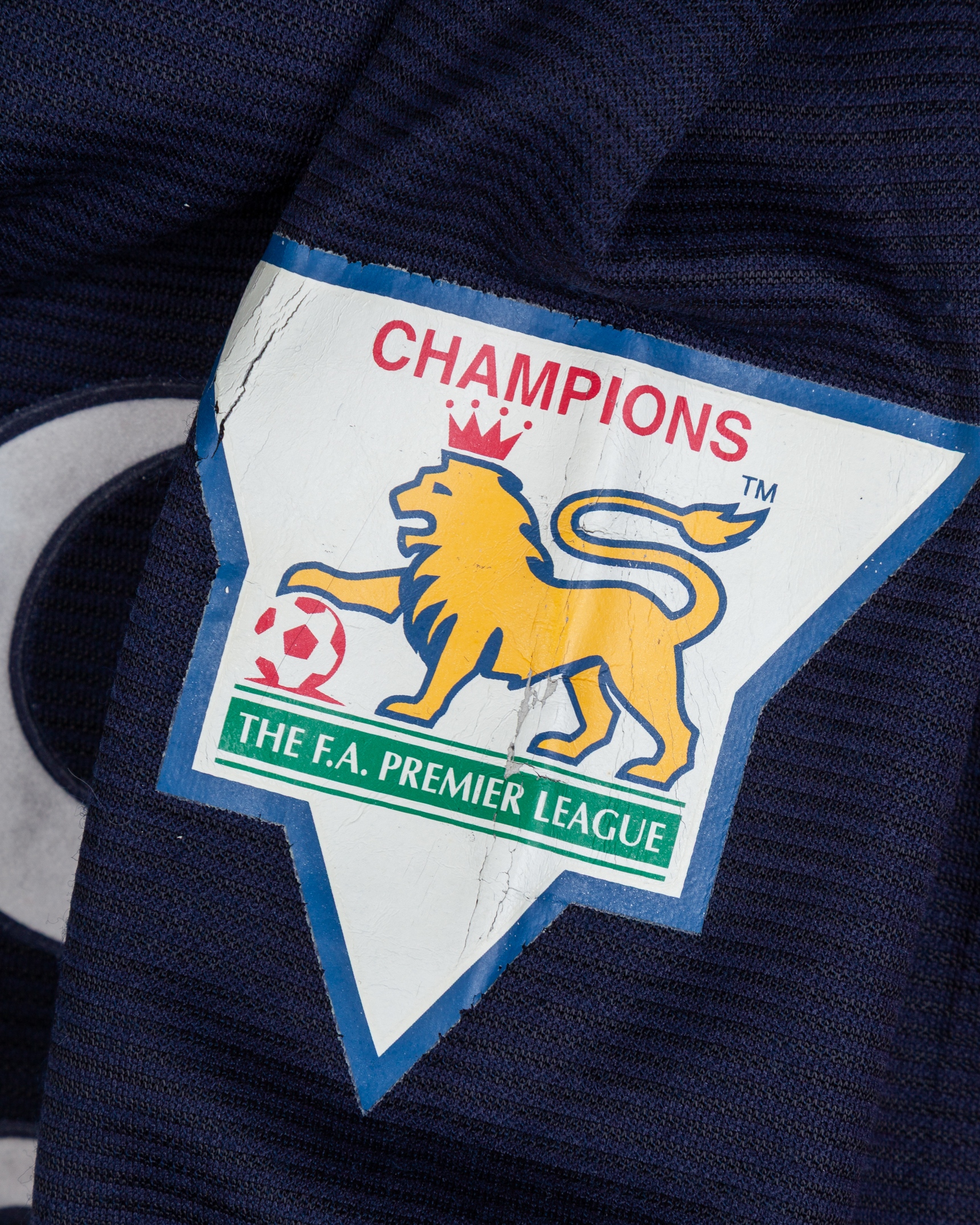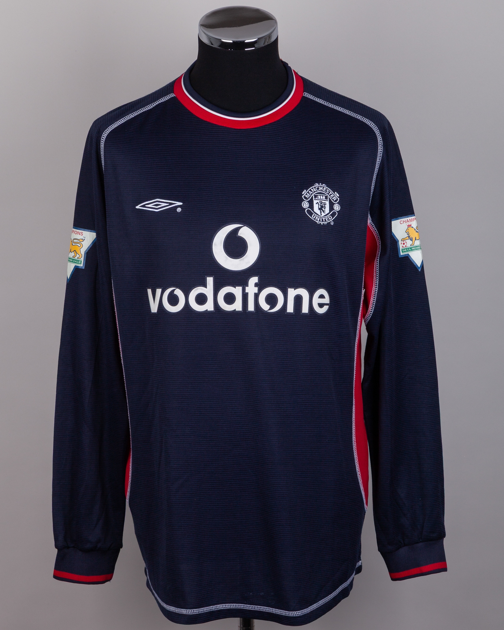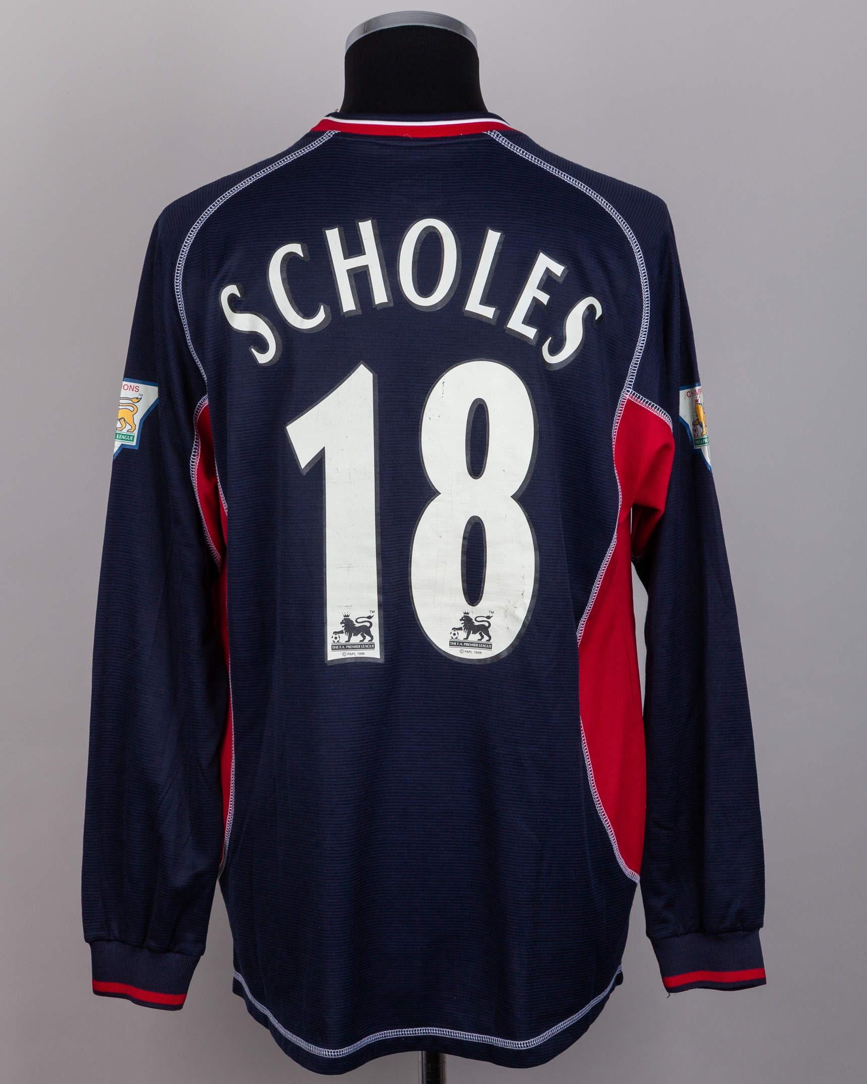 Paul Scholes blue No.18 Manchester United long-sleeved shirt, 2000-01, Umbro, L, with crew-neck collar and embroidered badge inscribed MANCHESTER UNITED, the reverse lettered SCHOLES, the sleeves with Champions the F.A. Premier League, with print worn and some discolouration