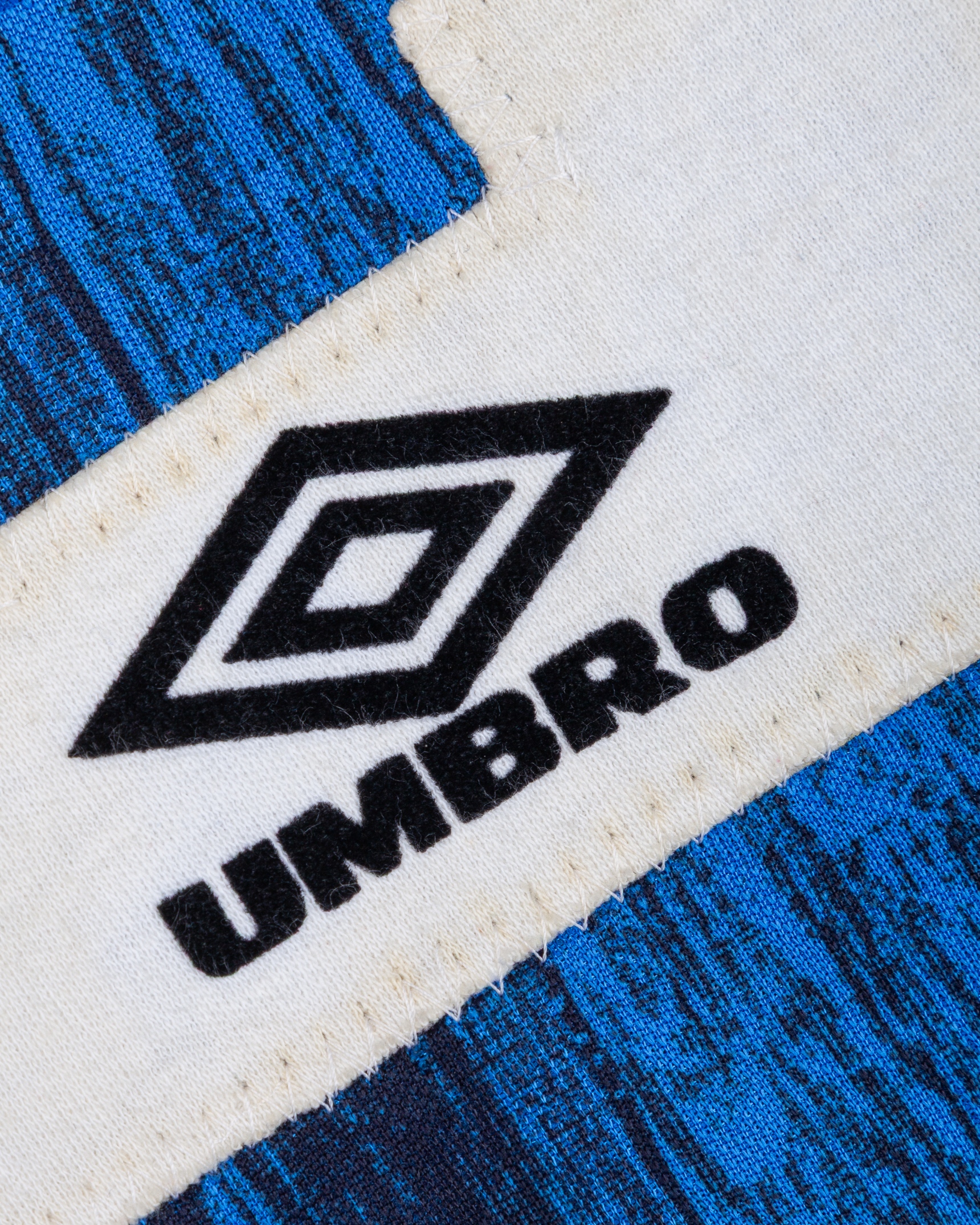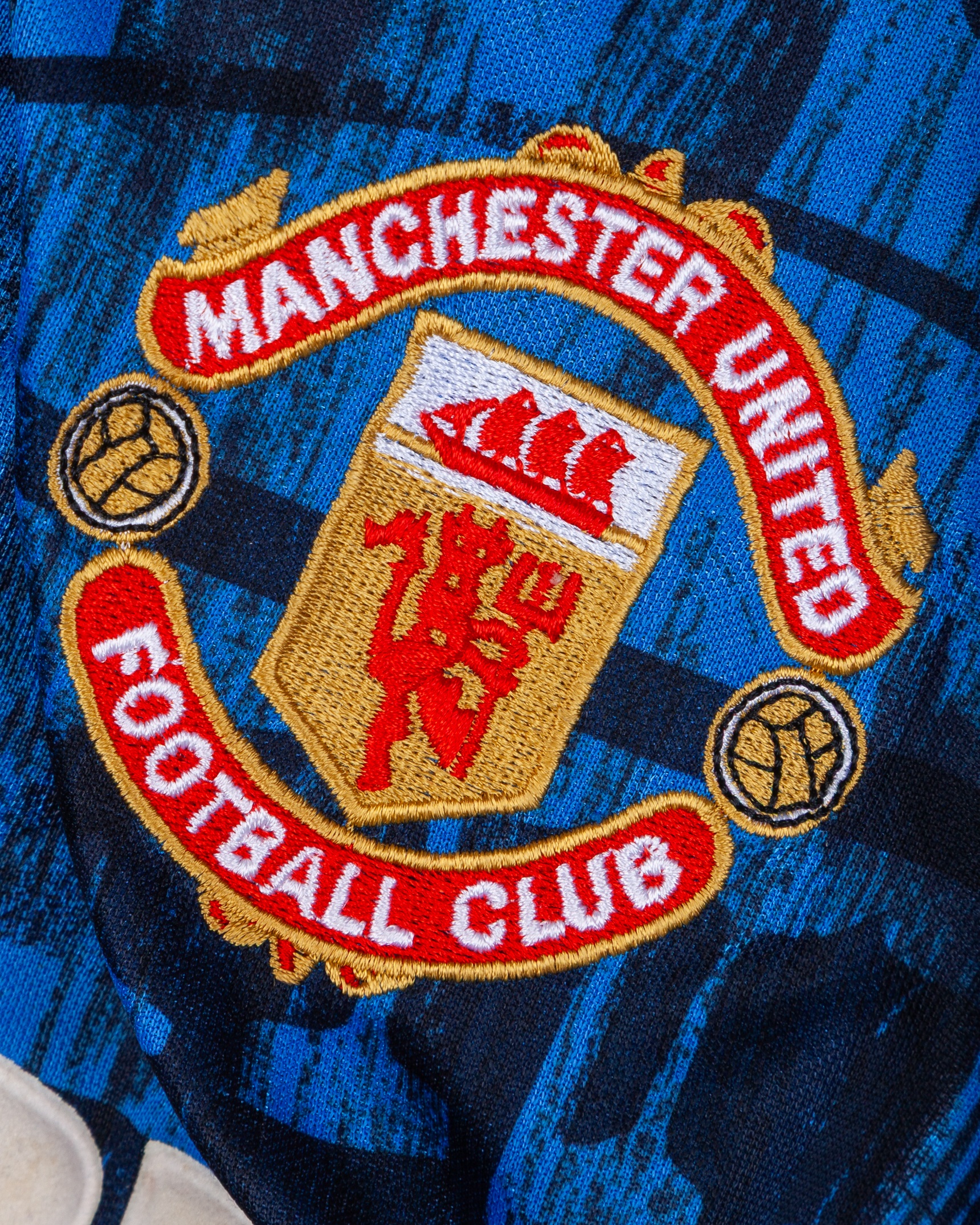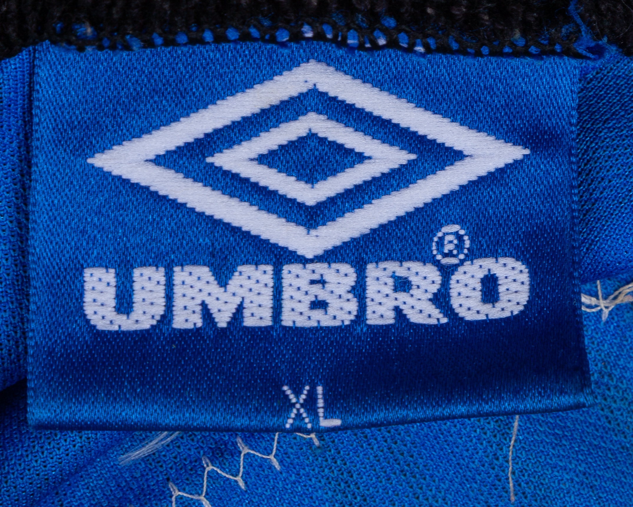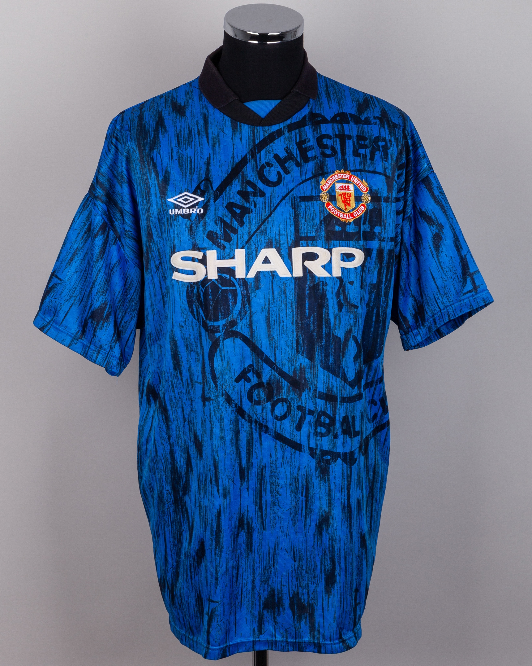 Paul Parker blue and black No.2 Manchester United short-sleeved shirt, 1992-93, Umbro, XL with v-neck collar and embroidered badge inscribed MANCHESTER UNITED FOOTBALL CLUB