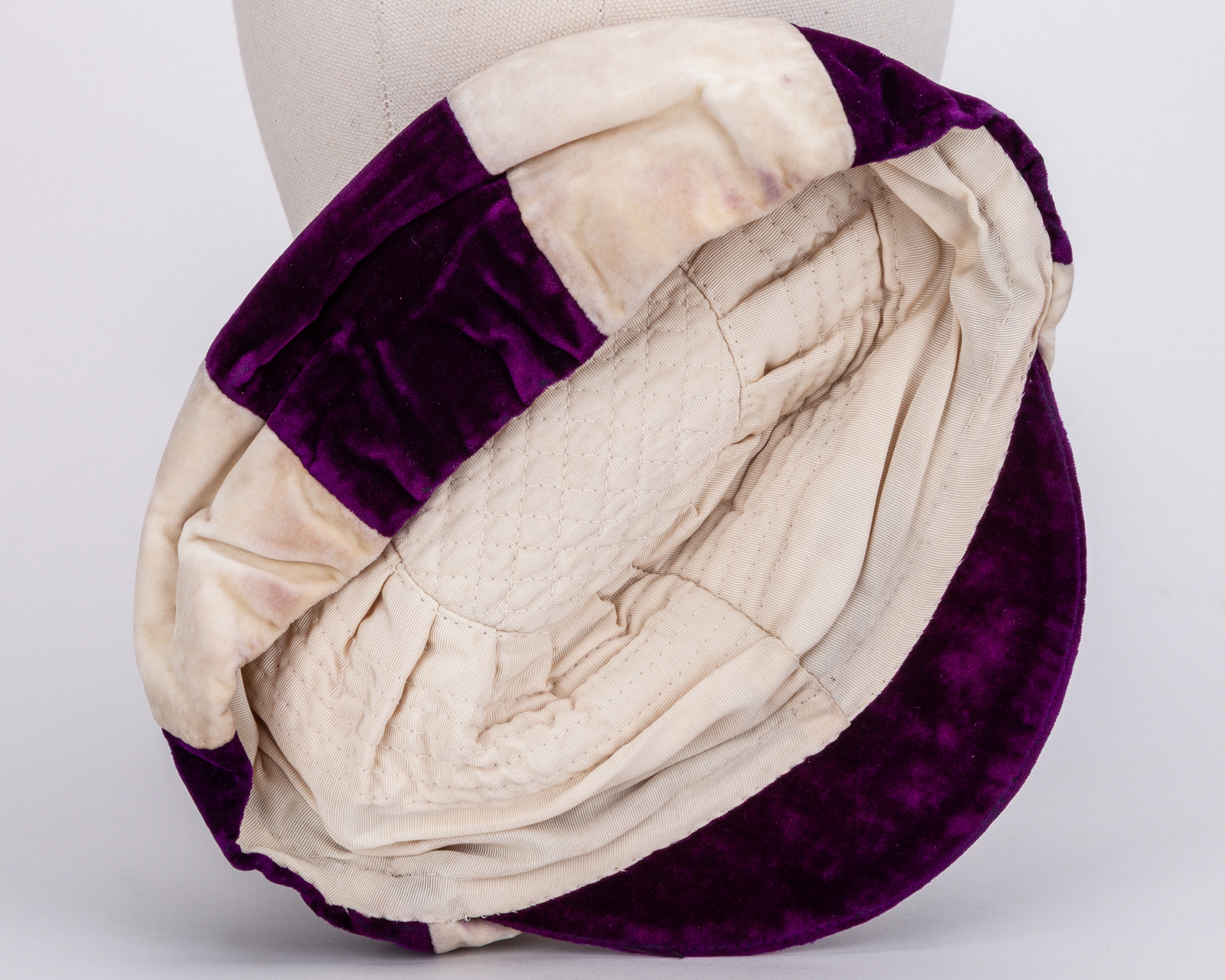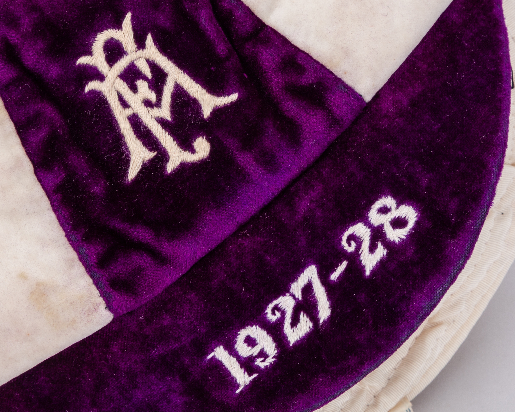 Roy Goodall purple and white Football Association trial cap, 1927-28, the quartered velvet cap embroidered FA and dated 1927-28