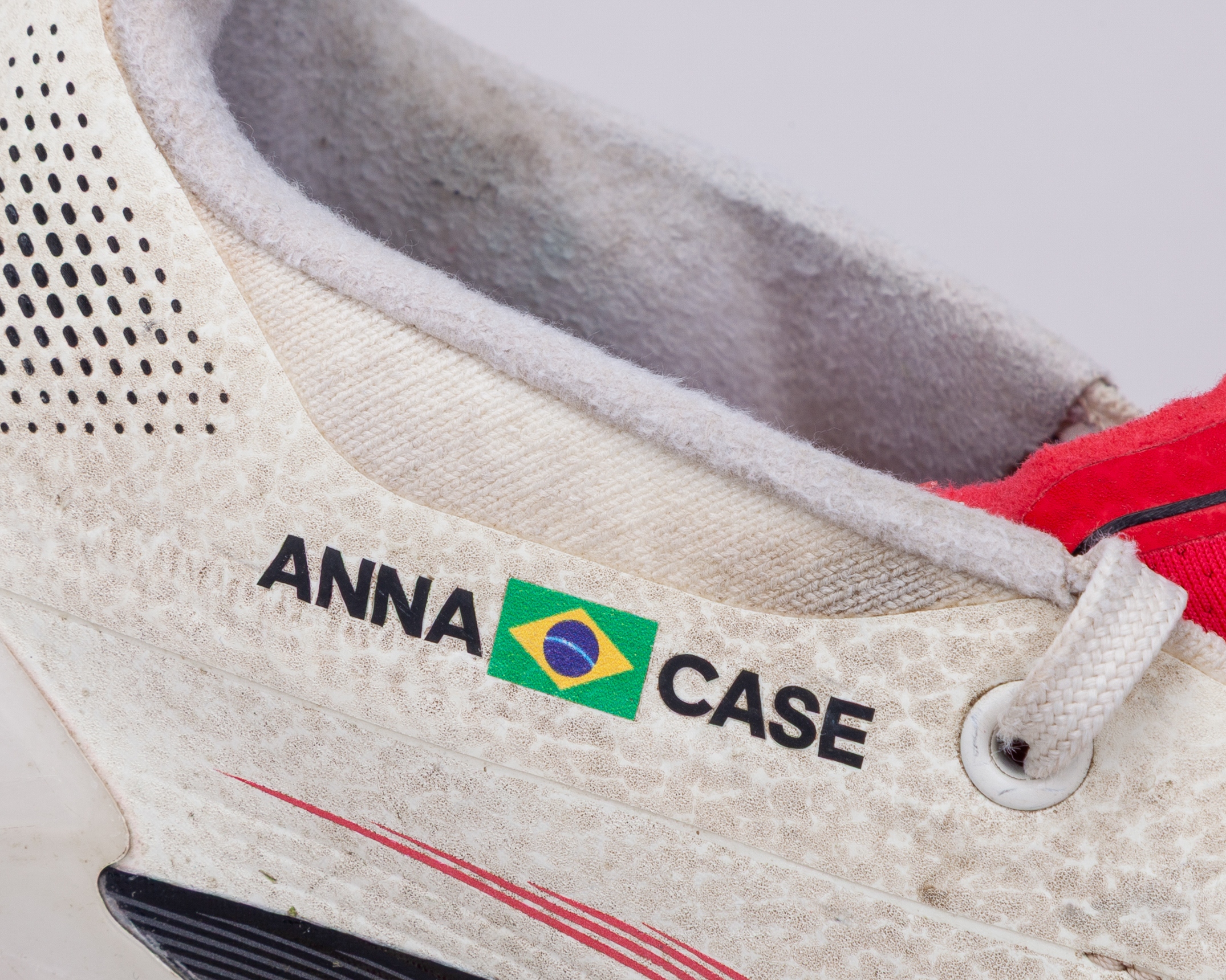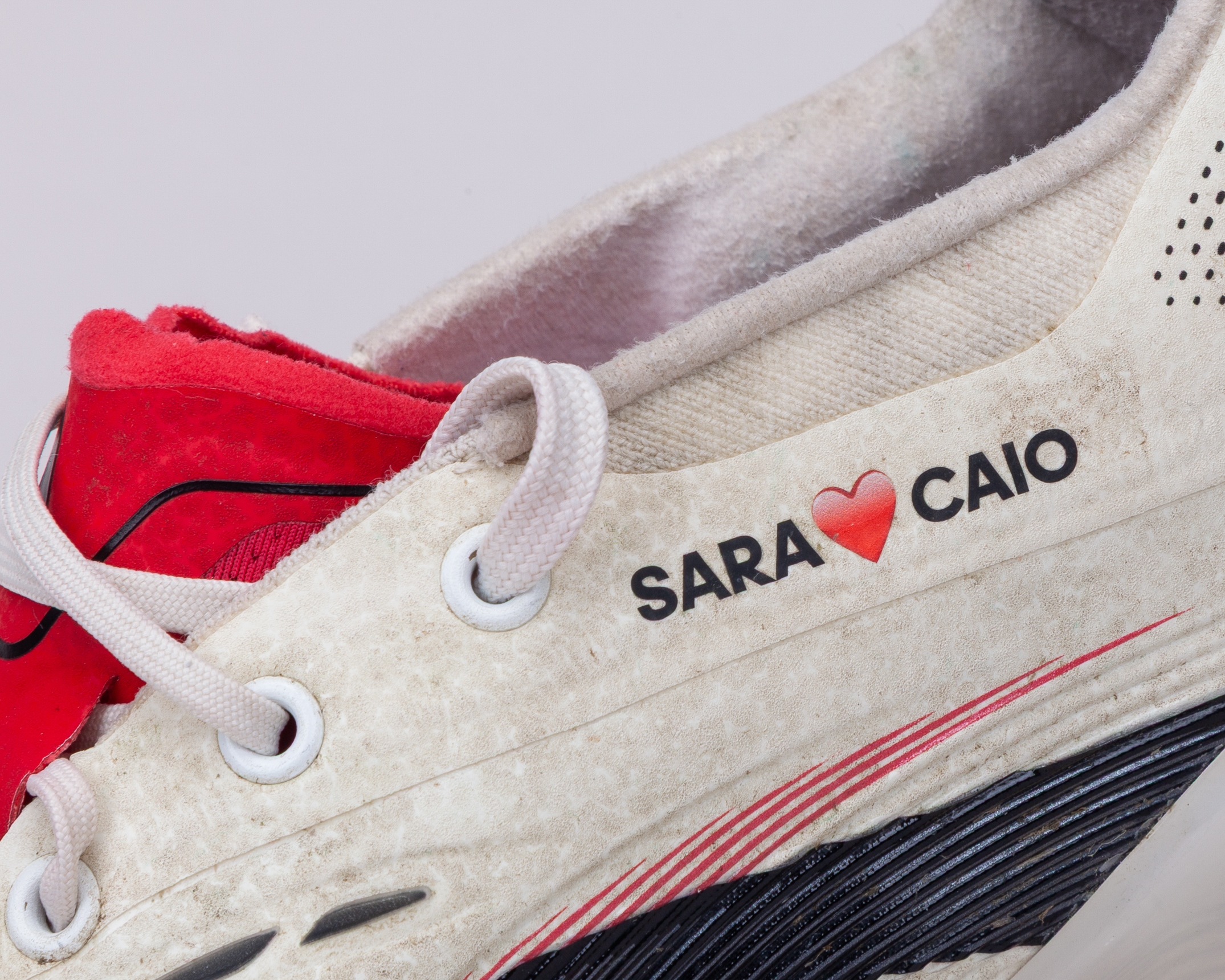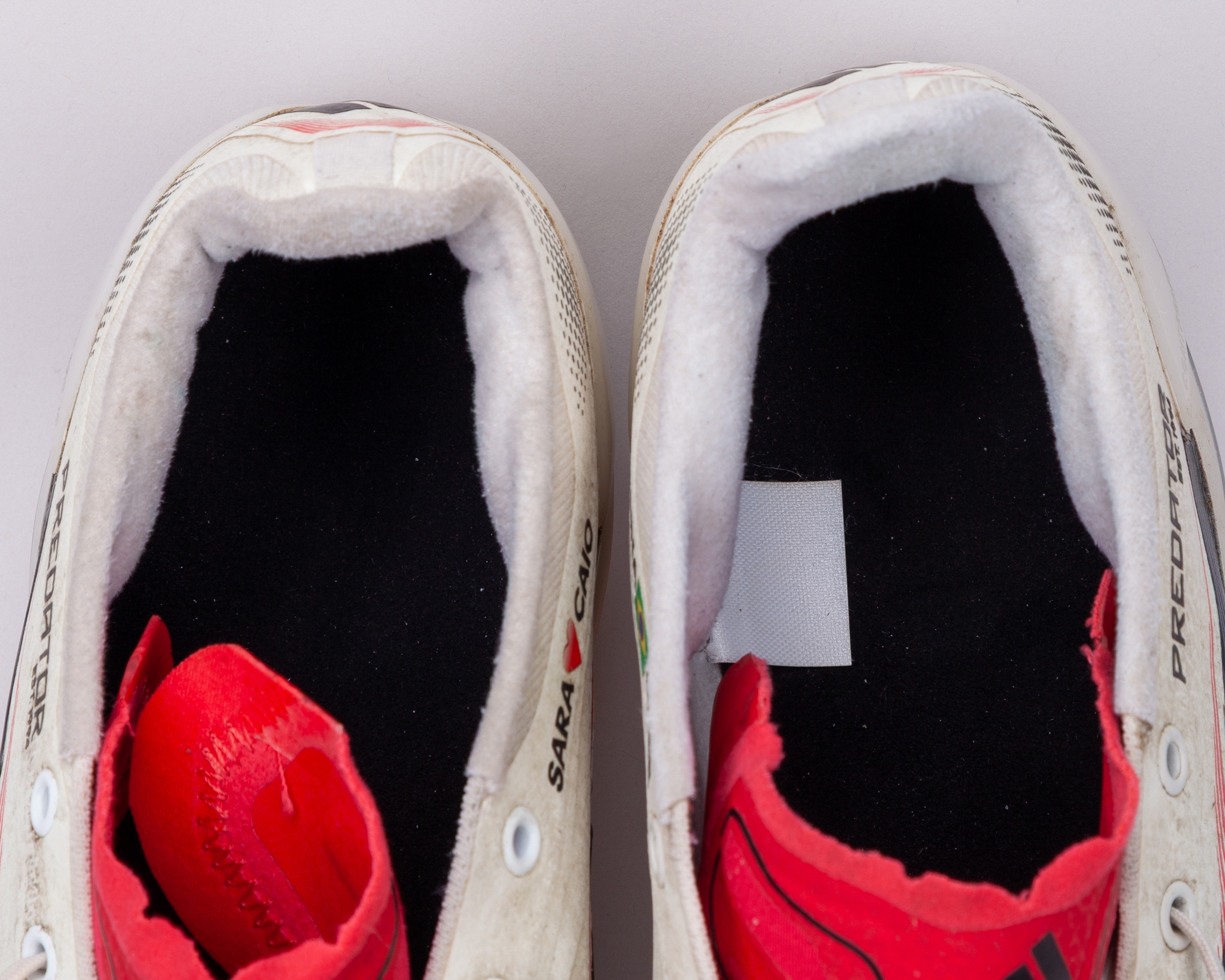 Casemiro white, black and red Adidas Predator worn football boots, 2024-25, L/R9.25/9UK, the right boot with SARA (love heart) CAIO decal and the left boot with ANNA (Brazil flag) CASE decal, with signs of wear
