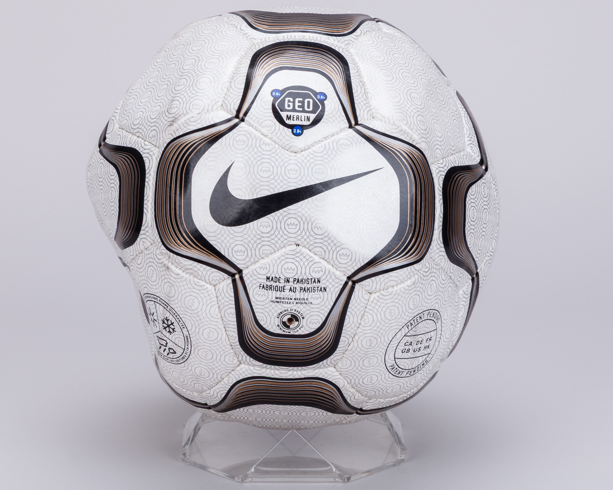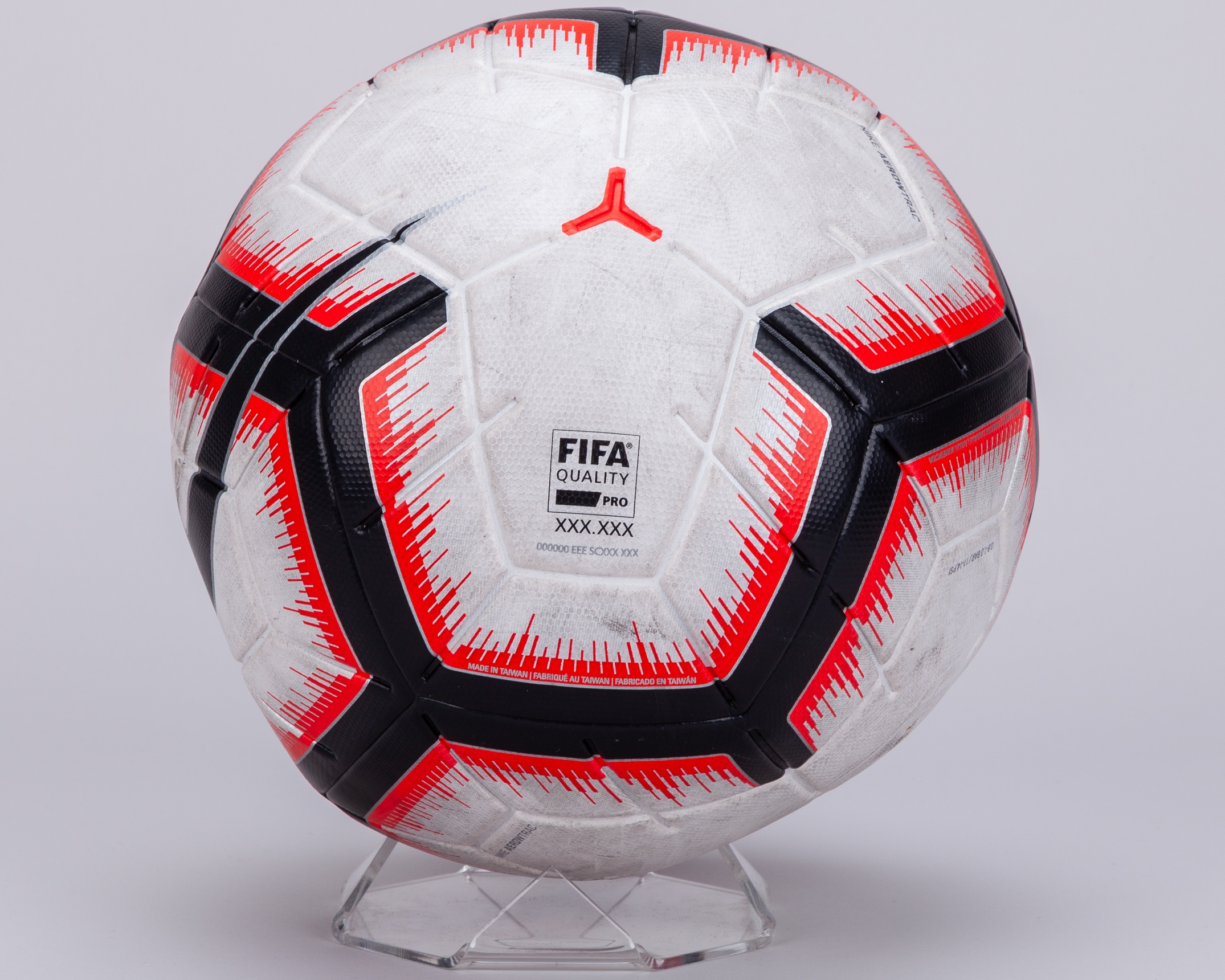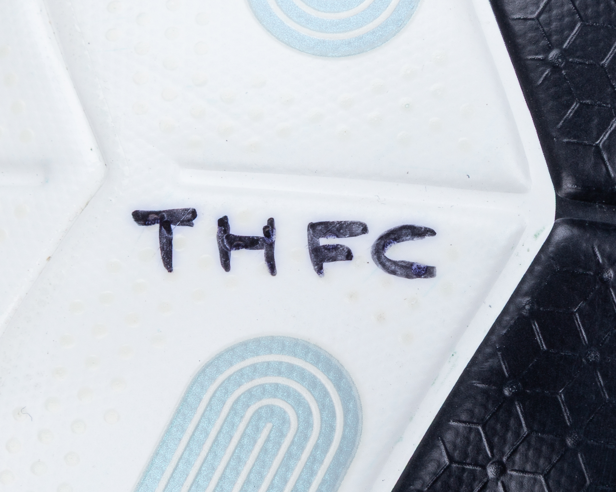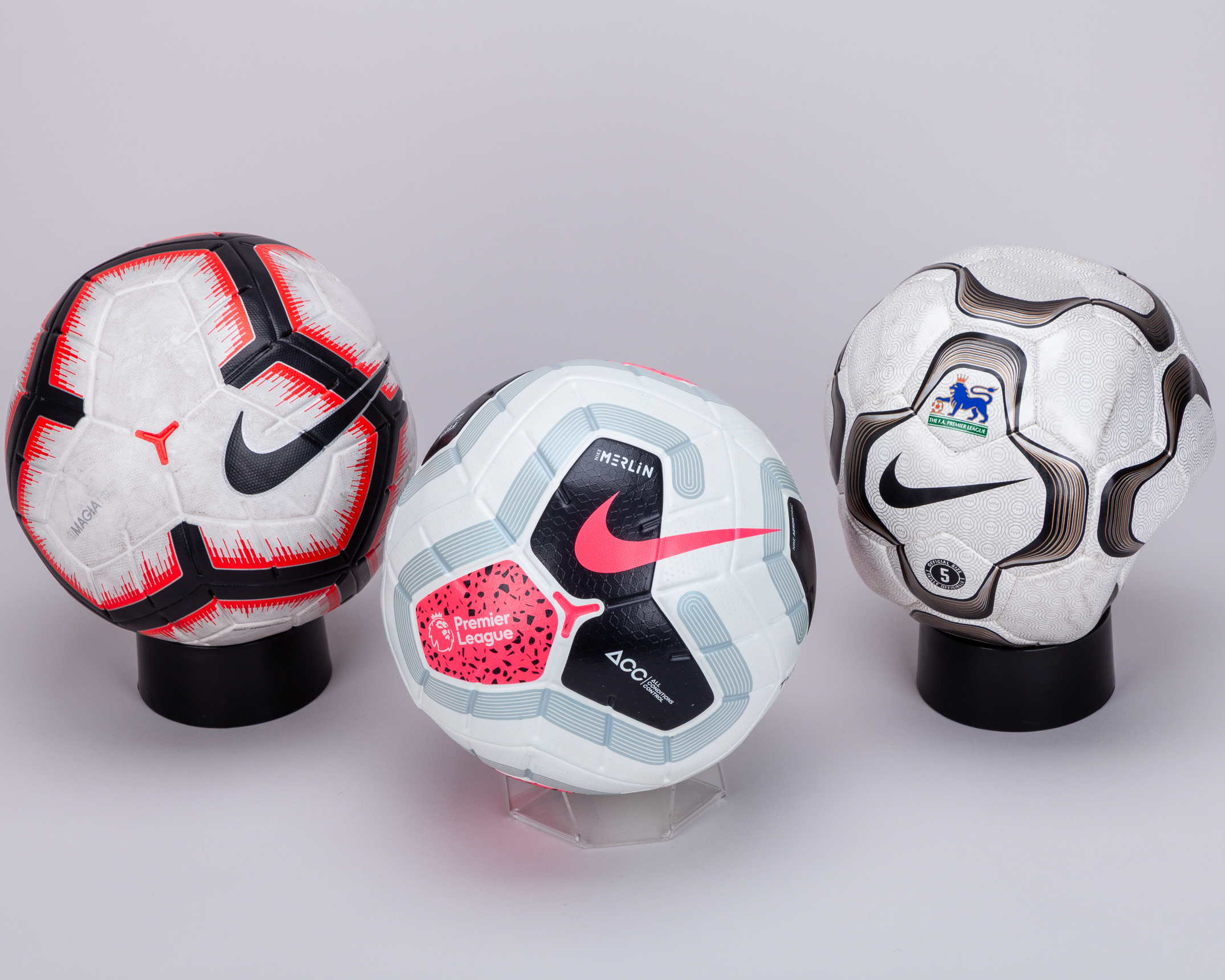 White, black and pink Nike Merlin Premier League official match ball, 2019-20, with THFC written in black marker, white and black Nike Geo Merlin Premier League football, 2000-02, white, black and red Nike Magia football, 2018-19 (3)