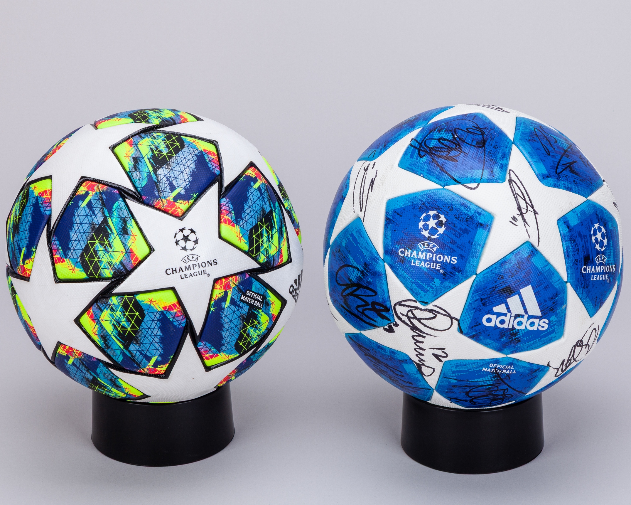 Tottenham Hotspur autographed blue and white Adidas Finale 18 Champions League official match ball, 2018-19, with approximately twenty autographs including Victor Wanyama, Ben Davies and Kieran Trippier etc., white and multi-coloured Adidas Finale 19 Champions League official match ball 2019-20 (2)