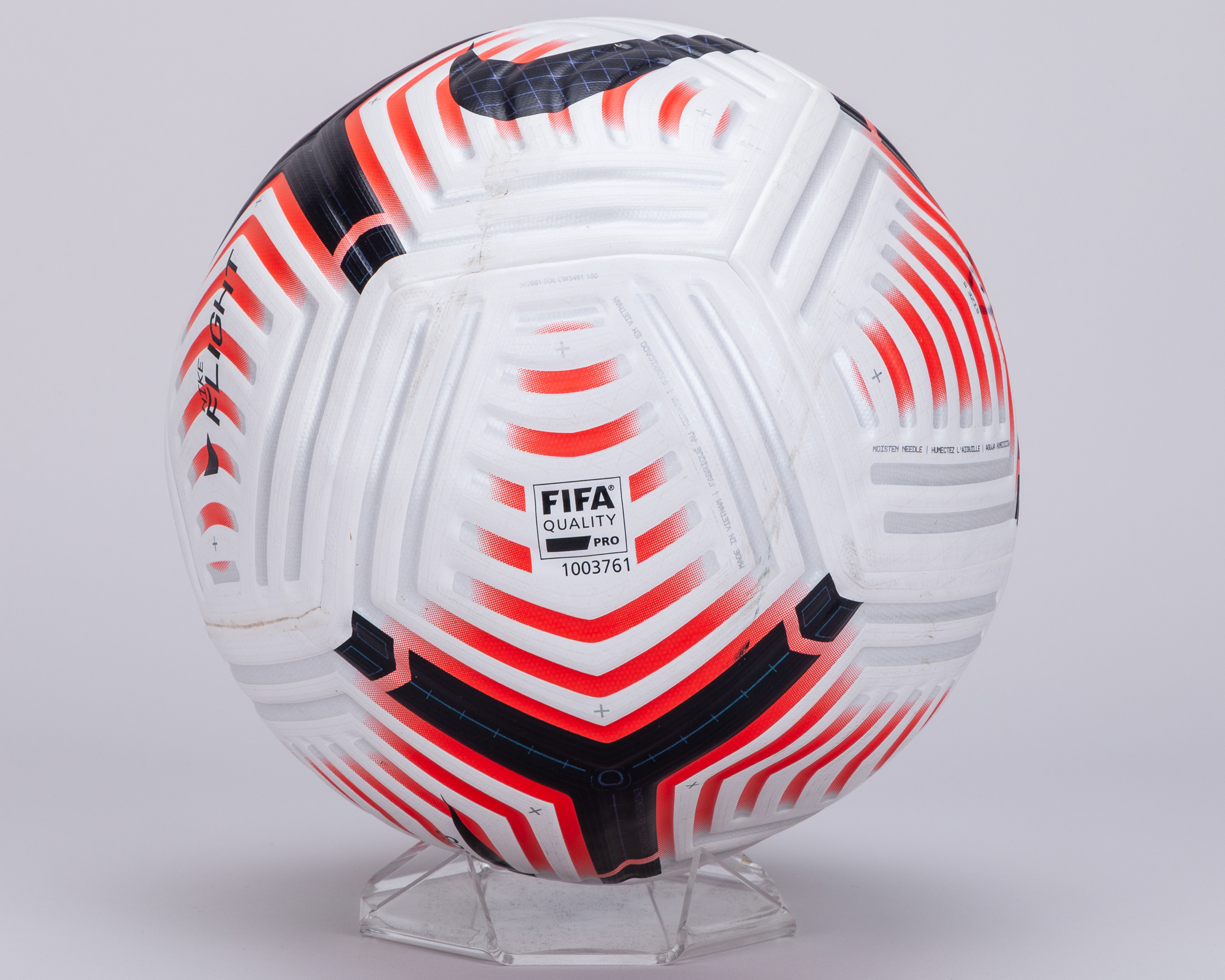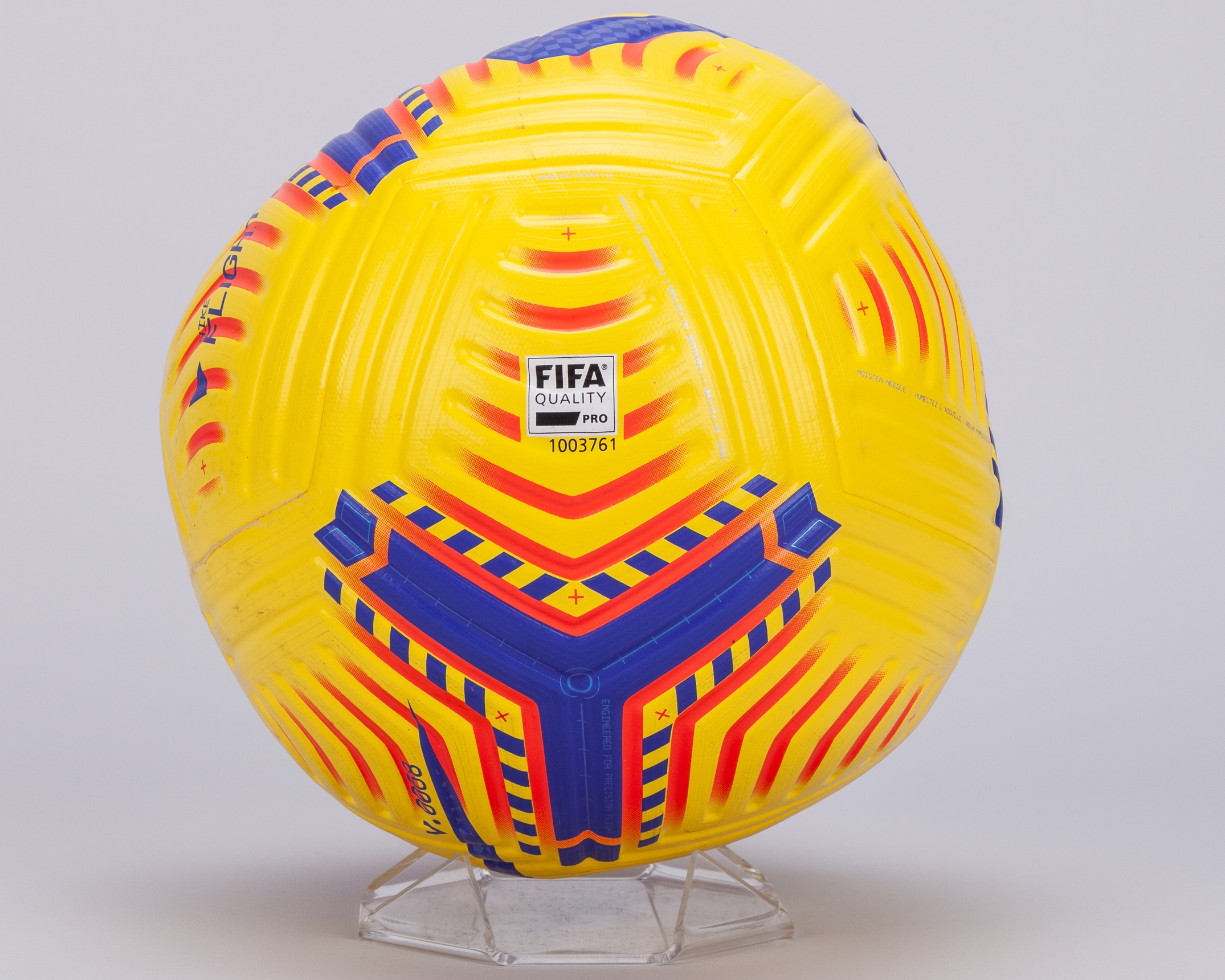 Three Nike Flight Premier League official match balls, 2020-21, including the white and black ball released at the start of the season, the yellow and blue high-visibility ball, the white, grey and blue ball released for the latter part of the season, (3)