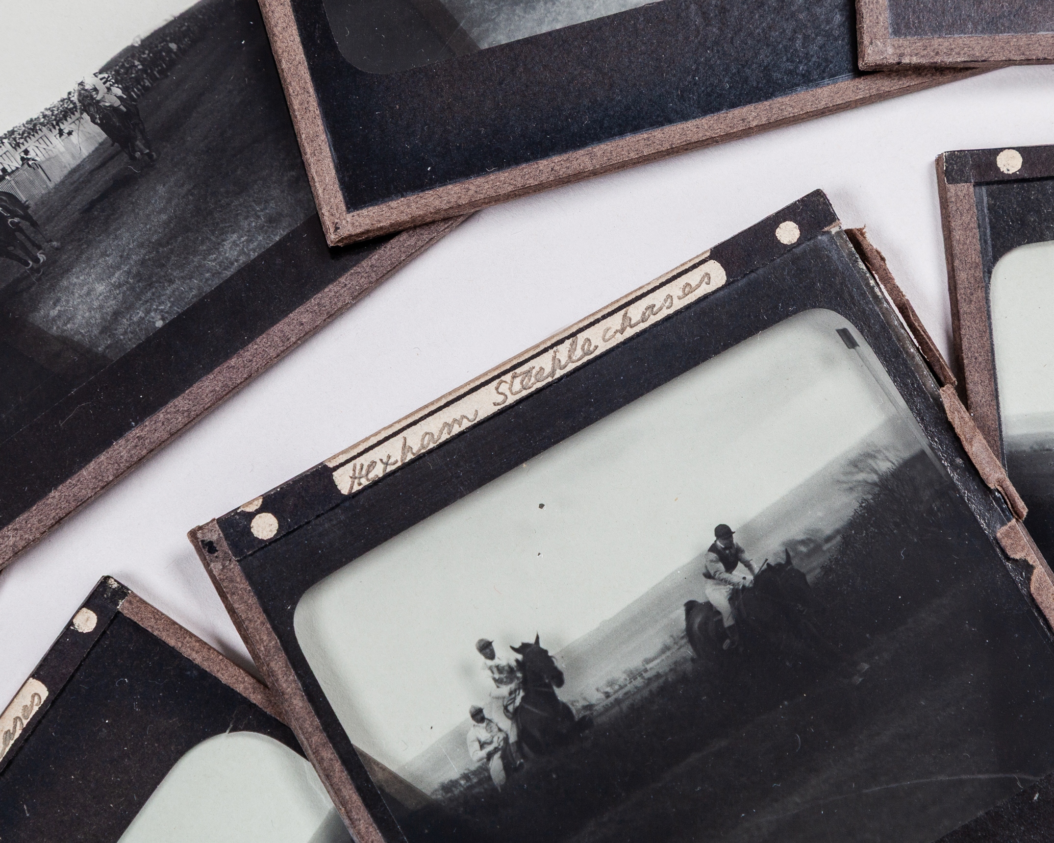 Seven equestrian Hexham Racecourse steeplechase photographic glass slides, early 1900s, two with the mounts inscribed in pencil Hexham, the other five inscribed Hexham Steeplechase, (7)