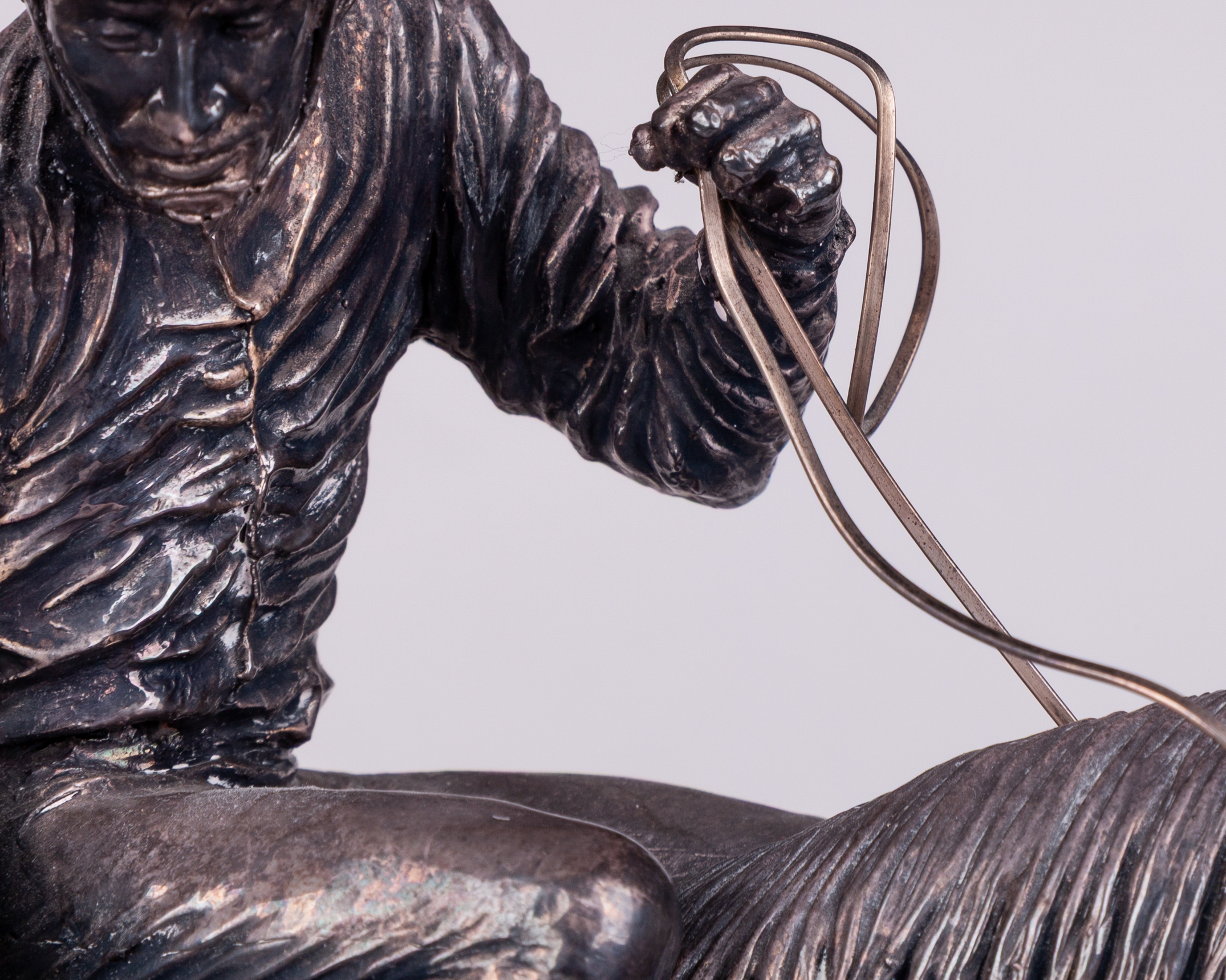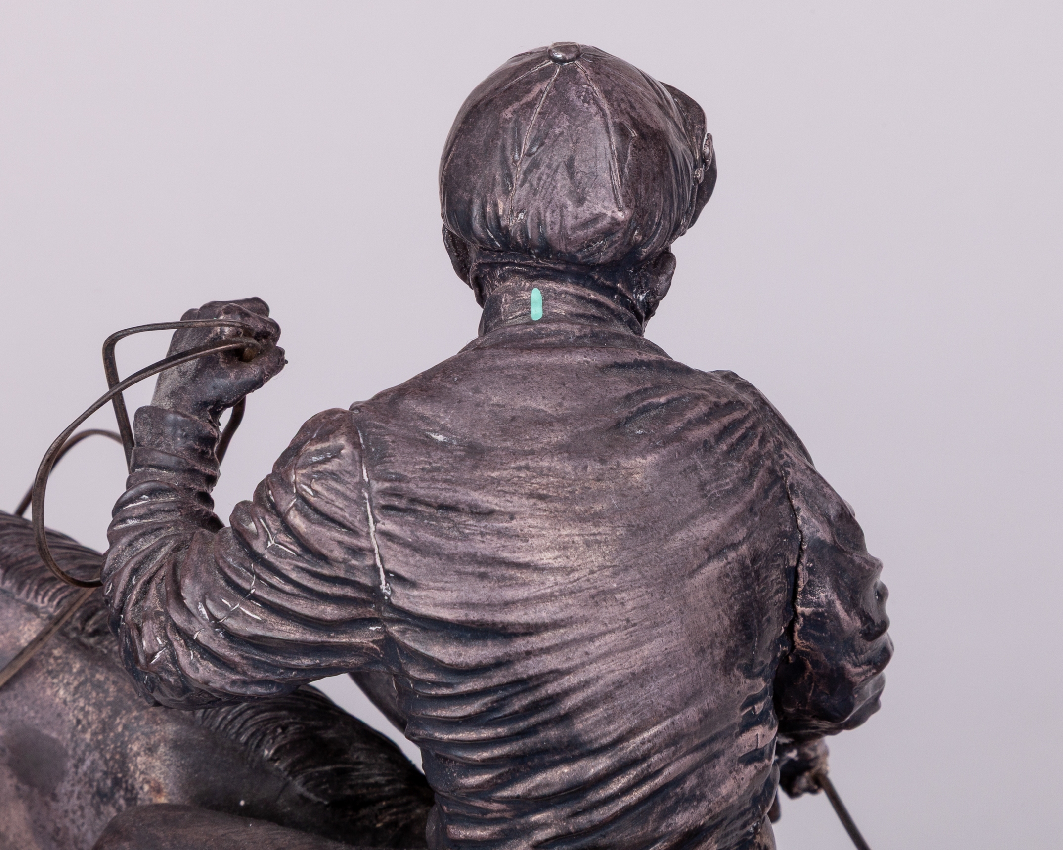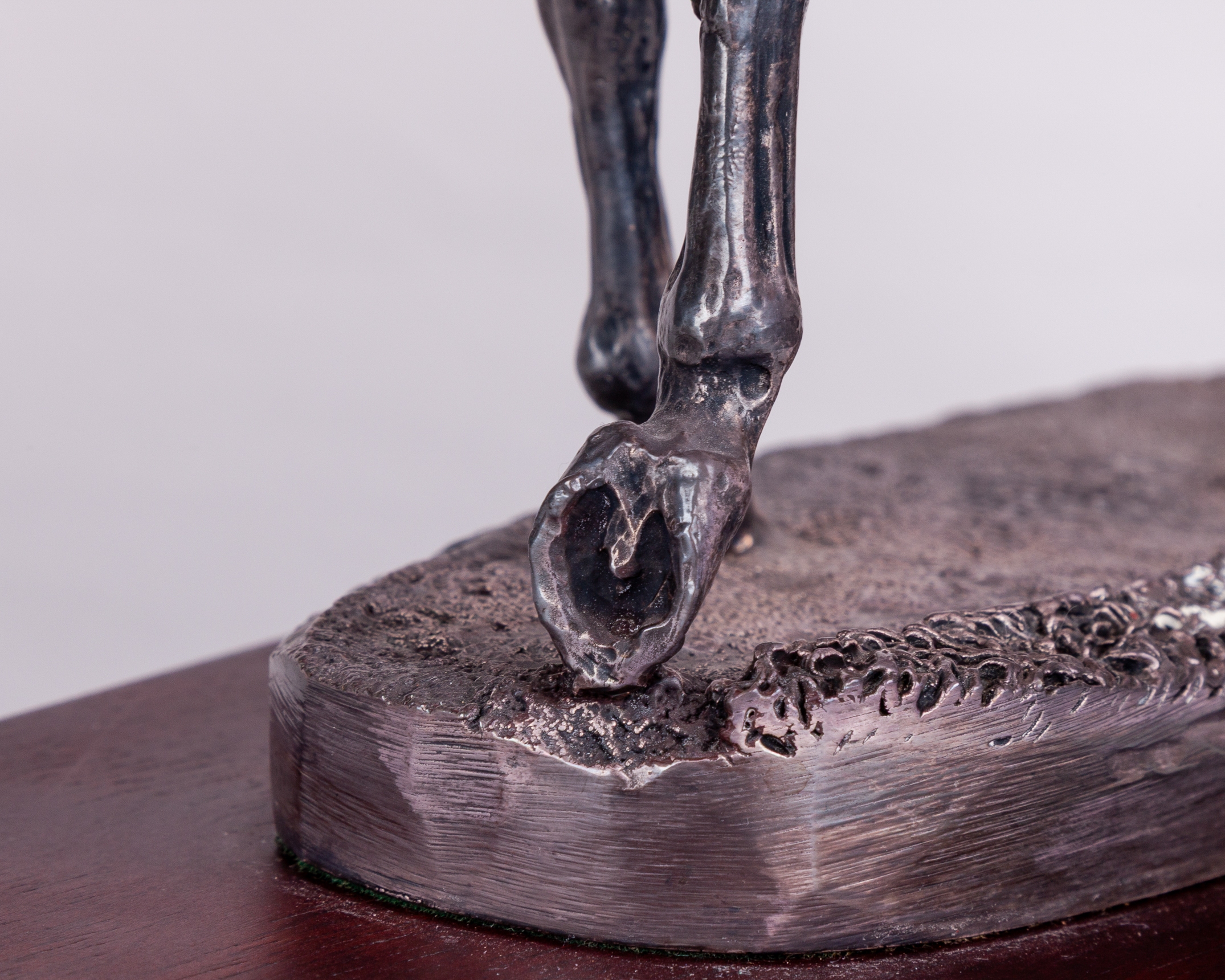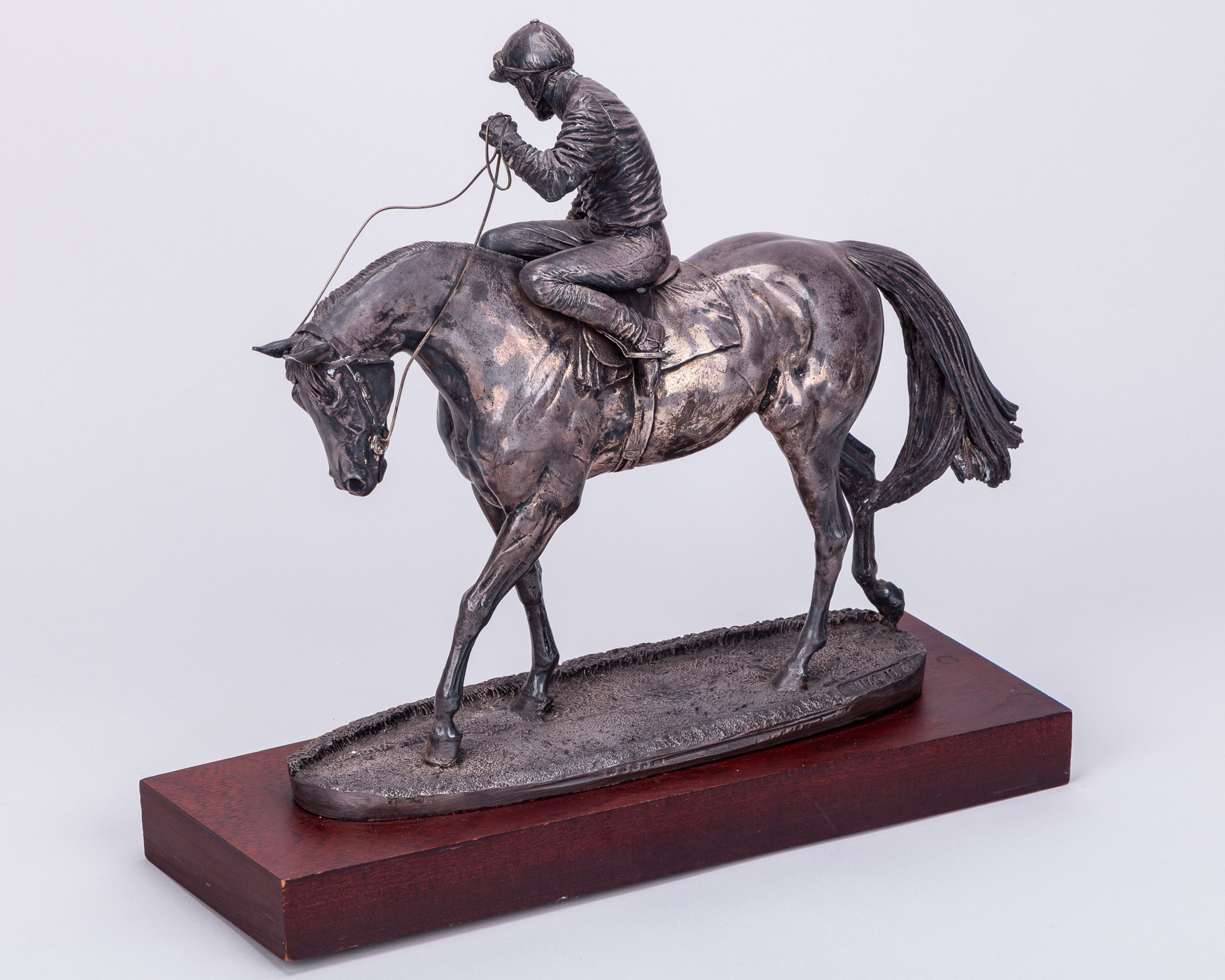 hallmarked Camelot Silverware Ltd, Sheffield, 1996, signed by the artist David Geenty and dated '93, modelled as a jockey adjusting a stirrup on a walking racehorse, mounted on a wooden plinth set with plaque inscribed PERSINA WAR HURDLE, CHEPSTOW, 1996, in good condition, overall 31 by 33 by 12.5cm.