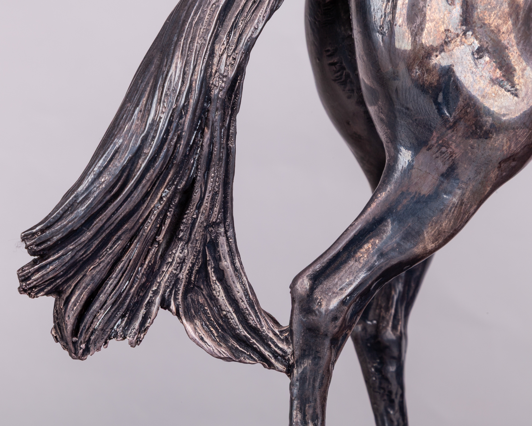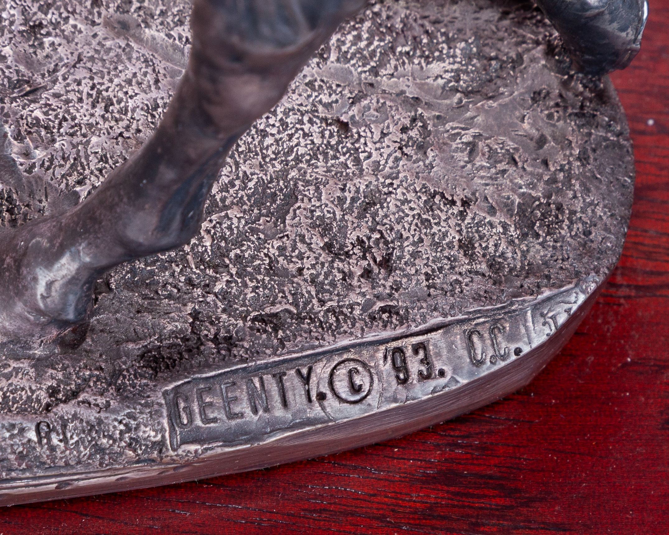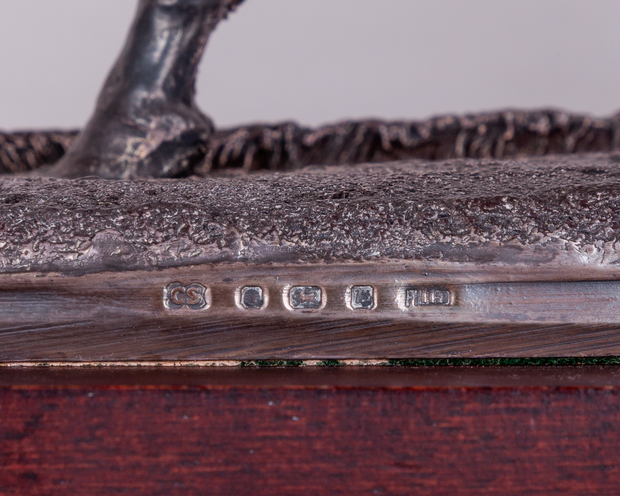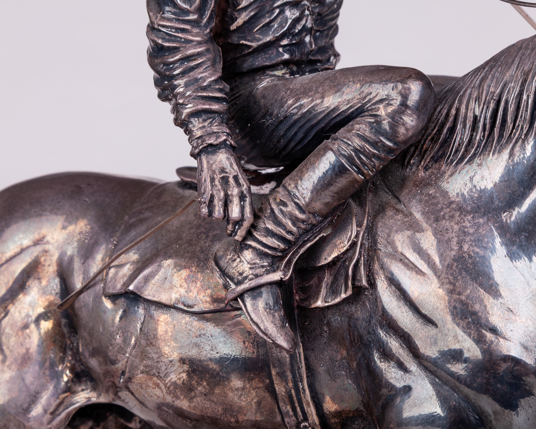 hallmarked Camelot Silverware Ltd, Sheffield, 1996, signed by the artist David Geenty and dated '93, modelled as a jockey adjusting a stirrup on a walking racehorse, mounted on a wooden plinth set with plaque inscribed PERSINA WAR HURDLE, CHEPSTOW, 1996, in good condition, overall 31 by 33 by 12.5cm.