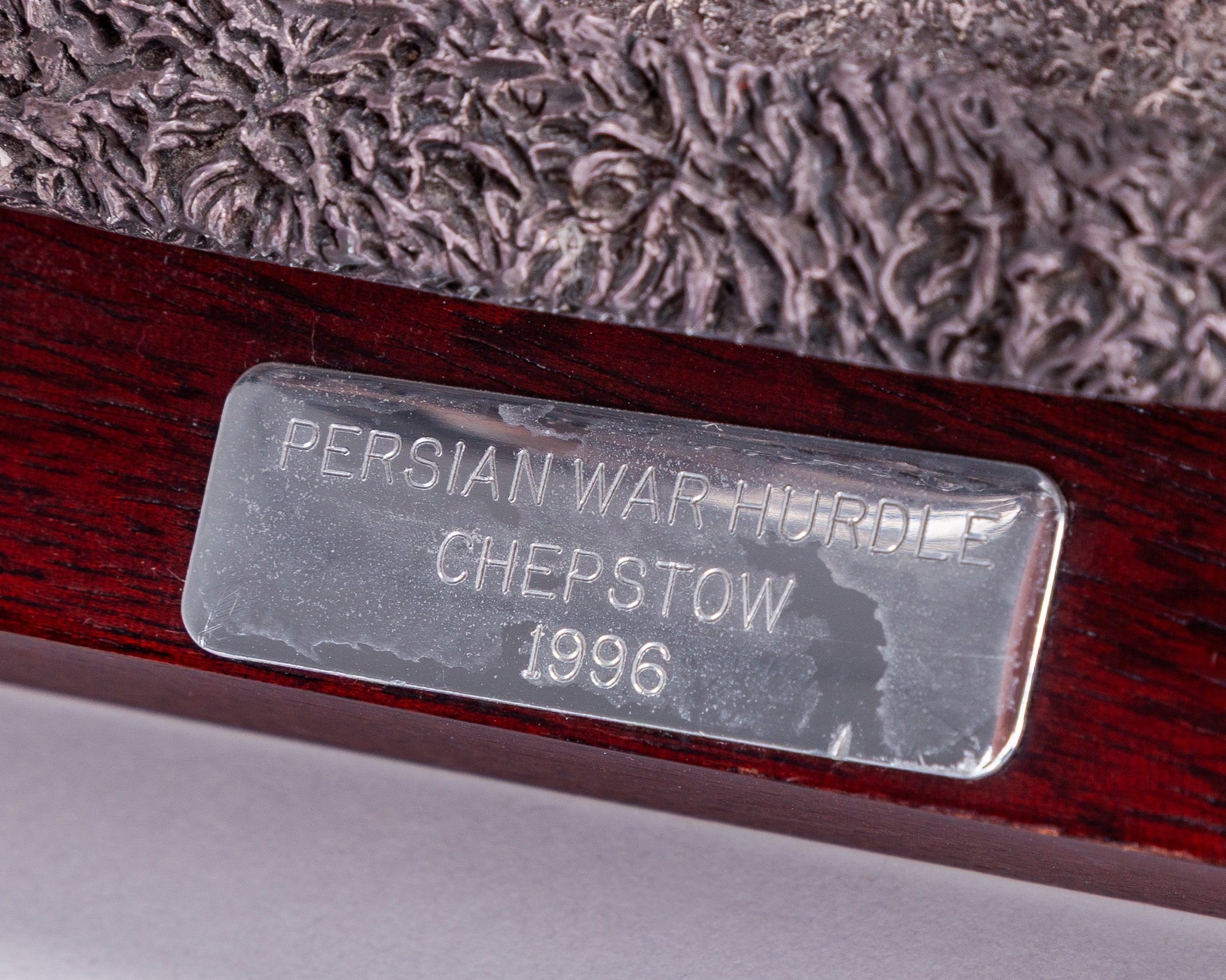 Silver racehorse & jockey trophy for the 1996 Persian War Hurdle at Chepstow,