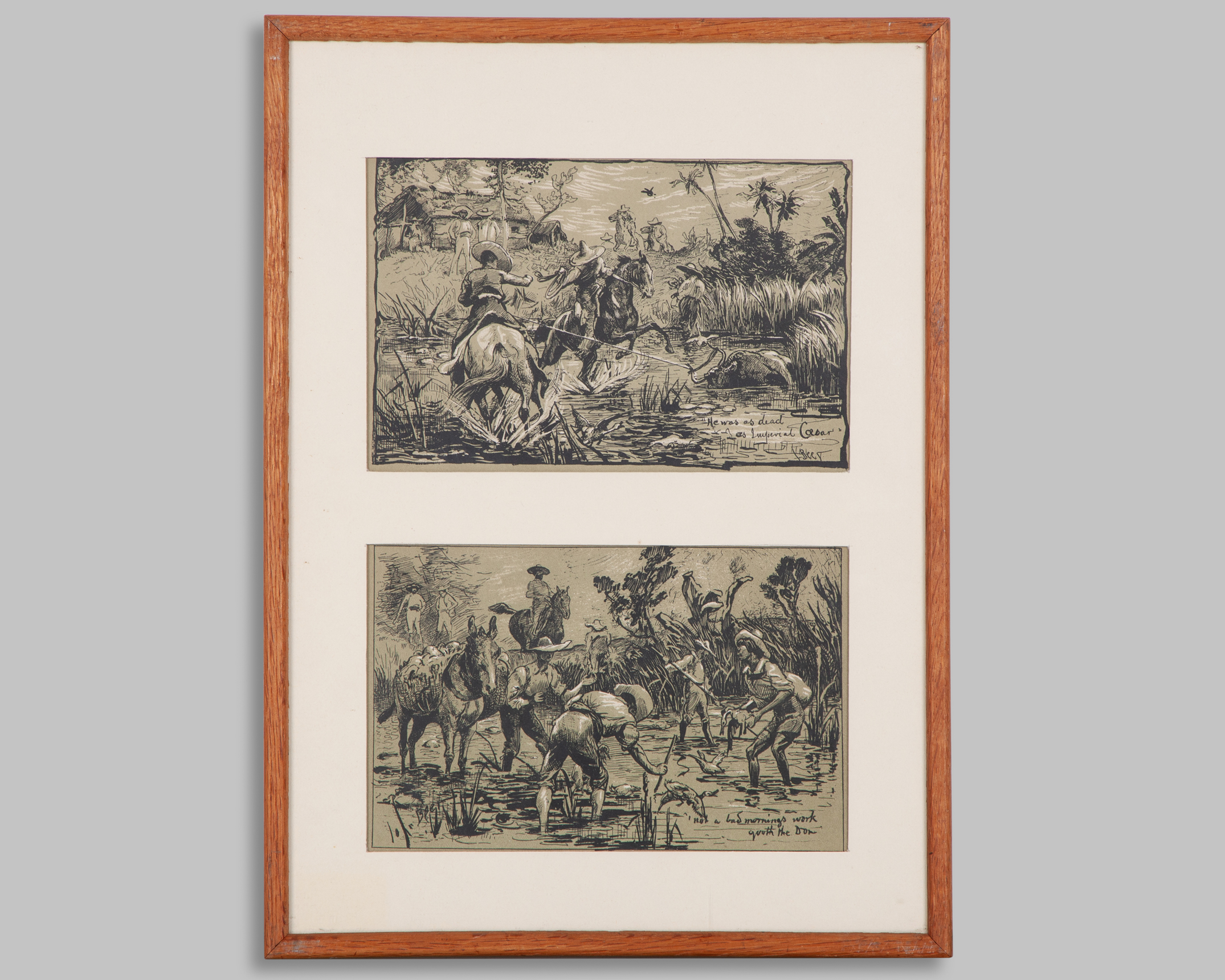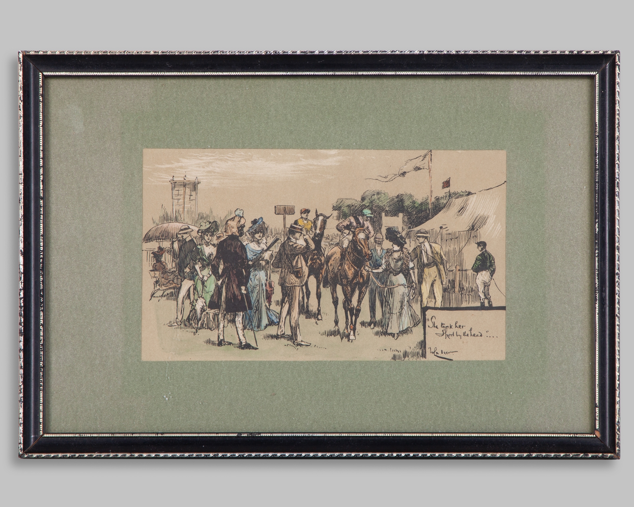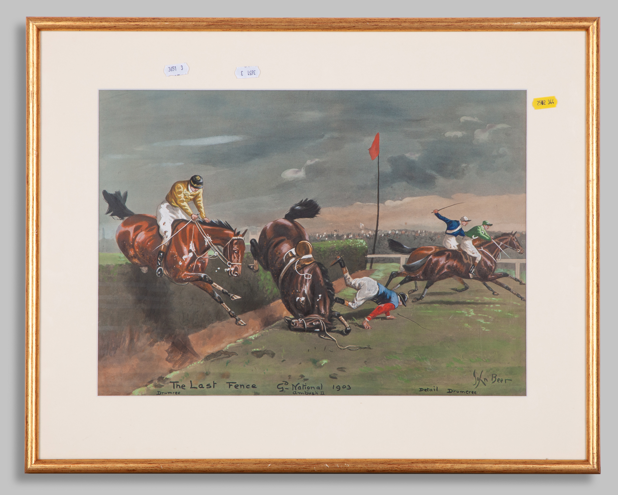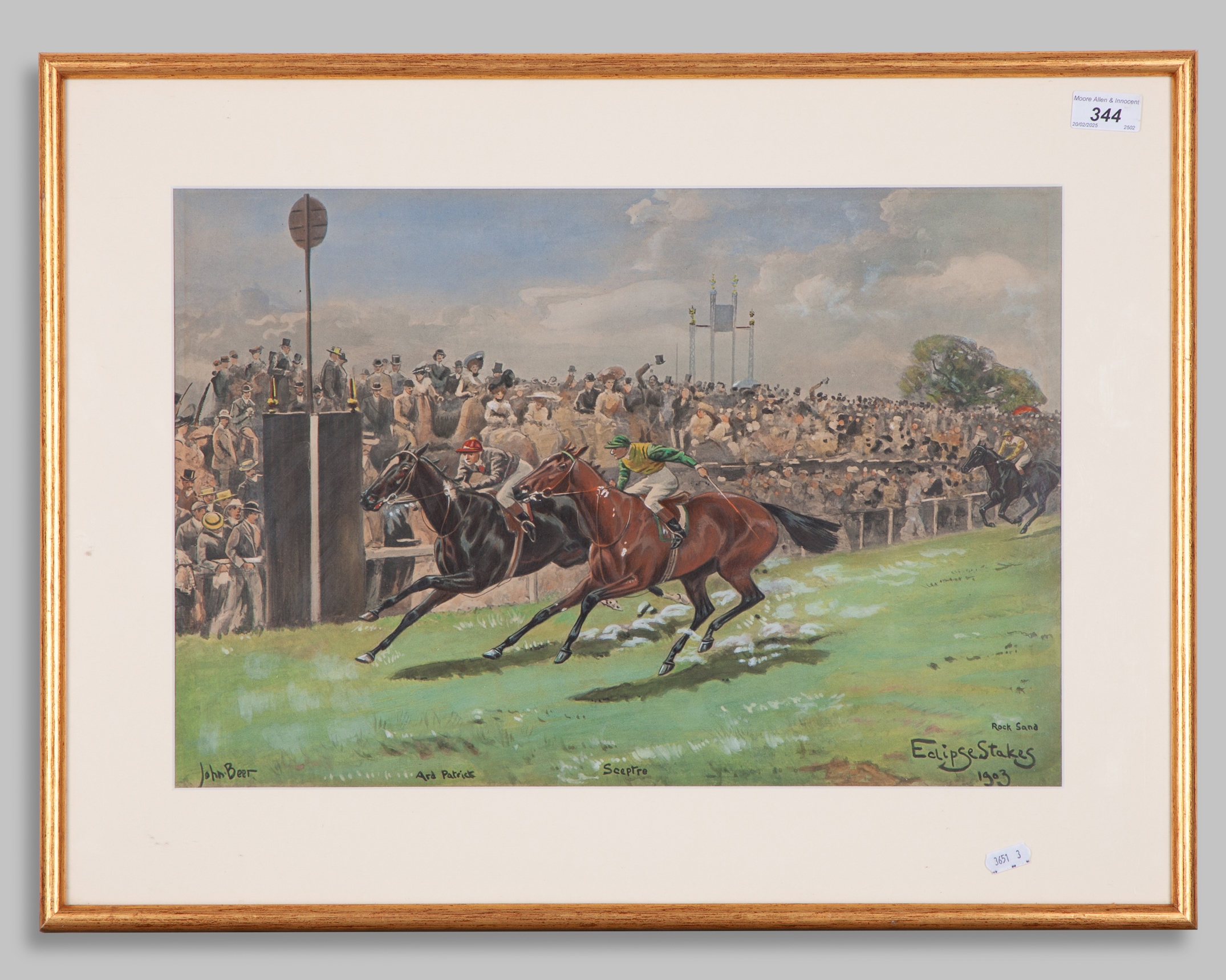 including two colourful prints, the first of the 1903 Eclipse Stakes at Sandown Park won by Ard Patrick (beating Sceptre), the other depicting the last fence fall of HM King Edward VII's Ambush II in the 1903 Grand National (won by Drumcree); together with a smaller print of a winner being led in by an Edwardian lady owner; the lot also including a double-mounted pair of John Beer book plates showing Spanish colonial hunting scenes, 5 prints in 4 frames, various sizes, the largest 49 by 66cm., (4)
