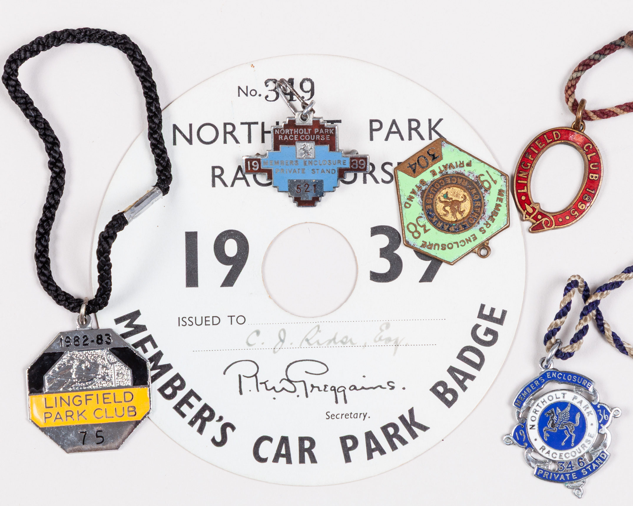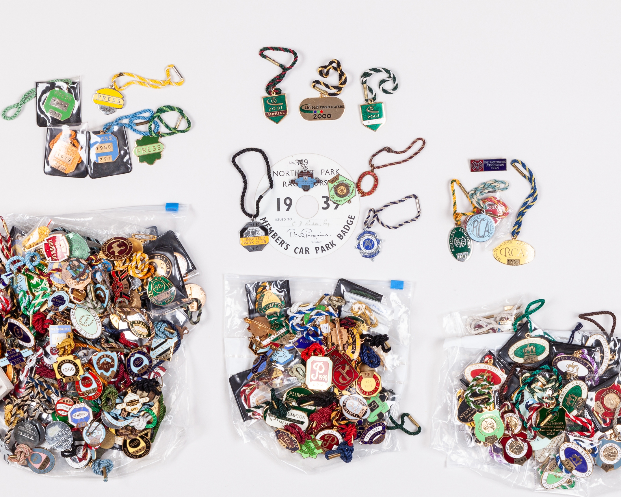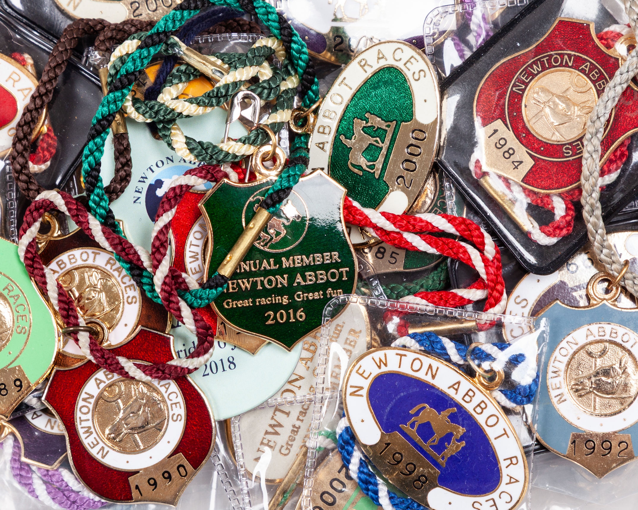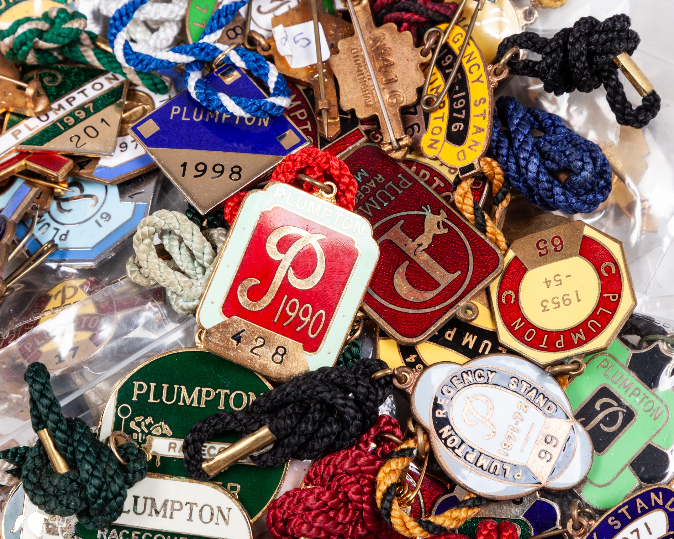 comprising: three badges for the defunct Northolt Park Racecourse, 1936, 1938 & 1939 and a cardboard member's car park badge for 1939; Lingfield Park 1895 and another for 1982-83; a large selection for Newbury 1905, 1907, 1908 (x2), 1909, 1912, 1914, 1915, 1919, 1920, 1922, 1923 (x 2), 1926, 1927 (x2), 1929 (x3), 1930, 1931, 1932 (x3), 1933, 1934 (x3), 1936, 1937, 1938, 1939 (x2), 1940 (x2), 1949 (x4), 1951, 1952, 1953, 1954, 1955 (x3), 1956, 1957 (numbered pair), 1958 (x3 including a numbered pair), 1959 (x2), 1960 (x2), 1961, 1962 (x3), 1963 (x2), 1964 (x2), 1965 (x3), 1966 (x2, one boxed), 1967 (x6), 1968 x 3, 1969, 1970, 1971 (x3 including a numbered pair), 1972 (x2), 1973, 1974, 1975 (x2), 1976 (x3 including a numbered pair), 1977 (x2), 1978 (x2), 1979 (x2), 1980, 1981, 1982, 1983, 1984, 1985, 1986 (x3 including a numbered pair), 1987, 1988 (x2), 1990, 1991, 1992, 1993, 1994, 1995 (x2), 1996, 1997, 1998, 1999, 1999-2000, 2000 (x3 including a numbered pair), 2000-01 (numbered pair), 2001 (x4 two numbered pairs), 2003, 2003-04, 2004, 2006 (x3), 2007 (x3), 2008 (x3), 2009, 2010 (x2), 2011 (x2), and 2012 (x2), plus two 1905-2005 badges, and one undated badge; Plumpton for 1947-48, 1949-50, 1950-51, 1953-54, 1954-55, 1959-60, 1963-64, 1965-66 (x2), 1966-67 (x2), 1967-68, 1968-69, 1969-70, 1970-71, 1971-72, 1972-73 (x2), 1973-74, 1974-75, 1975-76, 1976-77, 1977-78, 1979 (x2), 1981, 1982, 1983, 1984, 1985, 1986, 1987, 1988, 1989, 1990, 1991, 1992, 1993, 1994, 1997, 1998, 1999, 2000 (x2), 2001, 2004 (x2), 2005 & 2007; Newton Abbot for 1984, 1985, 1986, 1987, 1988, 1989, 1990, 1991, 1992, 1993 (x2), 1994, 1995, 1996, 1997, 1998, 1999 (x2), 2000 (x2). 2001, 2002, 2003, 2004, 2005, 2006, 2007, 2008, 2010, 2012, 2013 & 2016, plus three Shareholders badge; and 13 other badges for RCA, Press and United Racecourses dating between 1979 and 2017