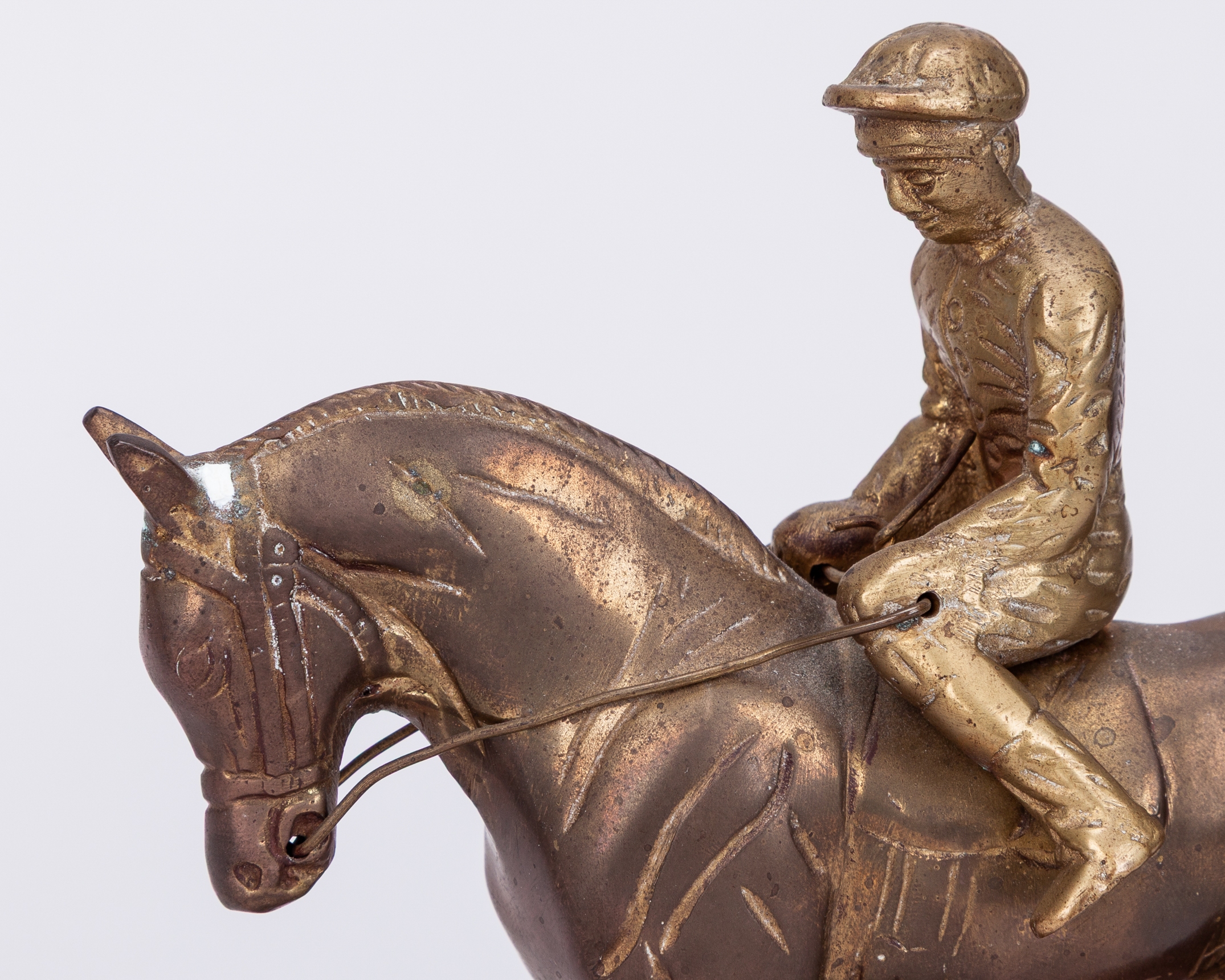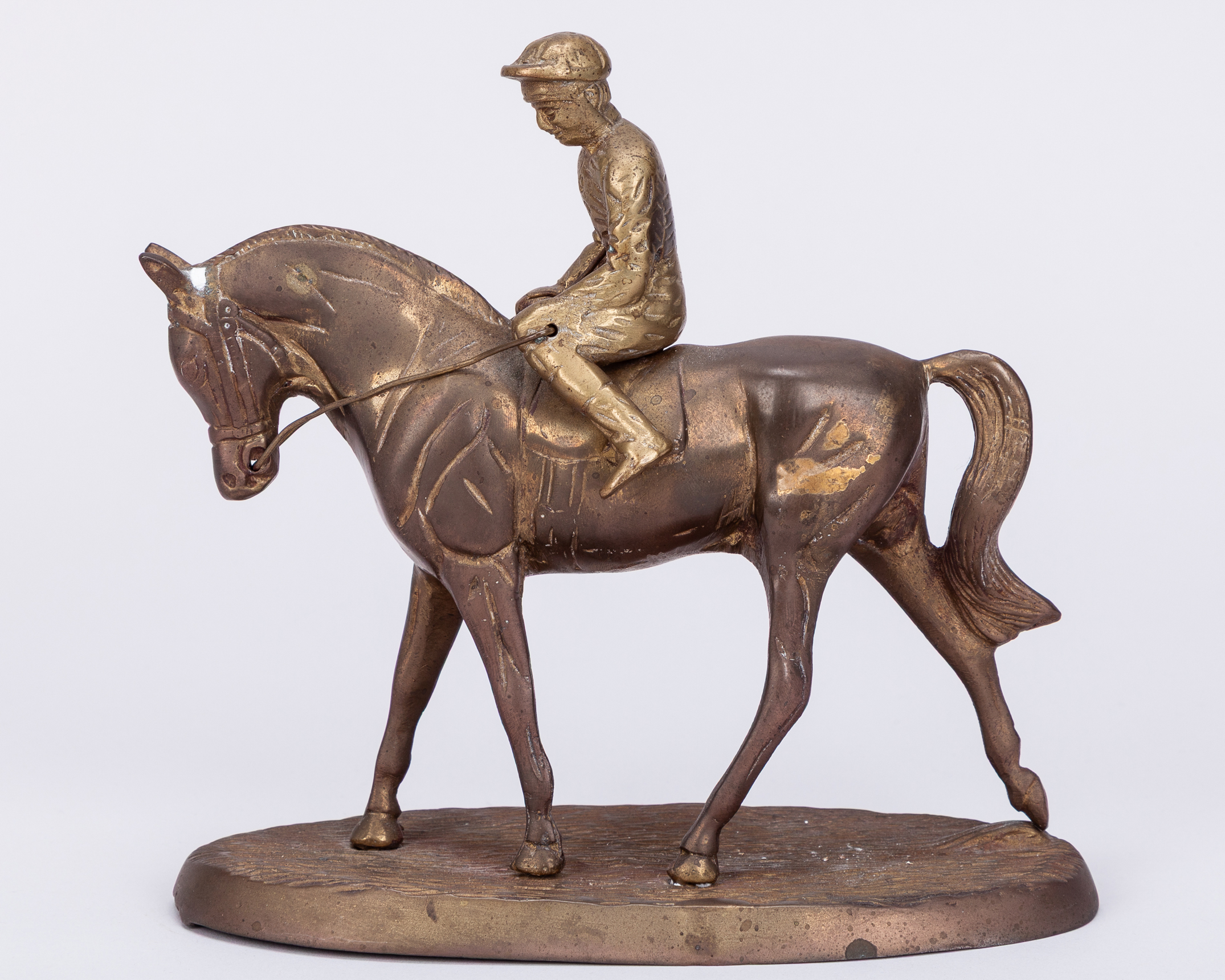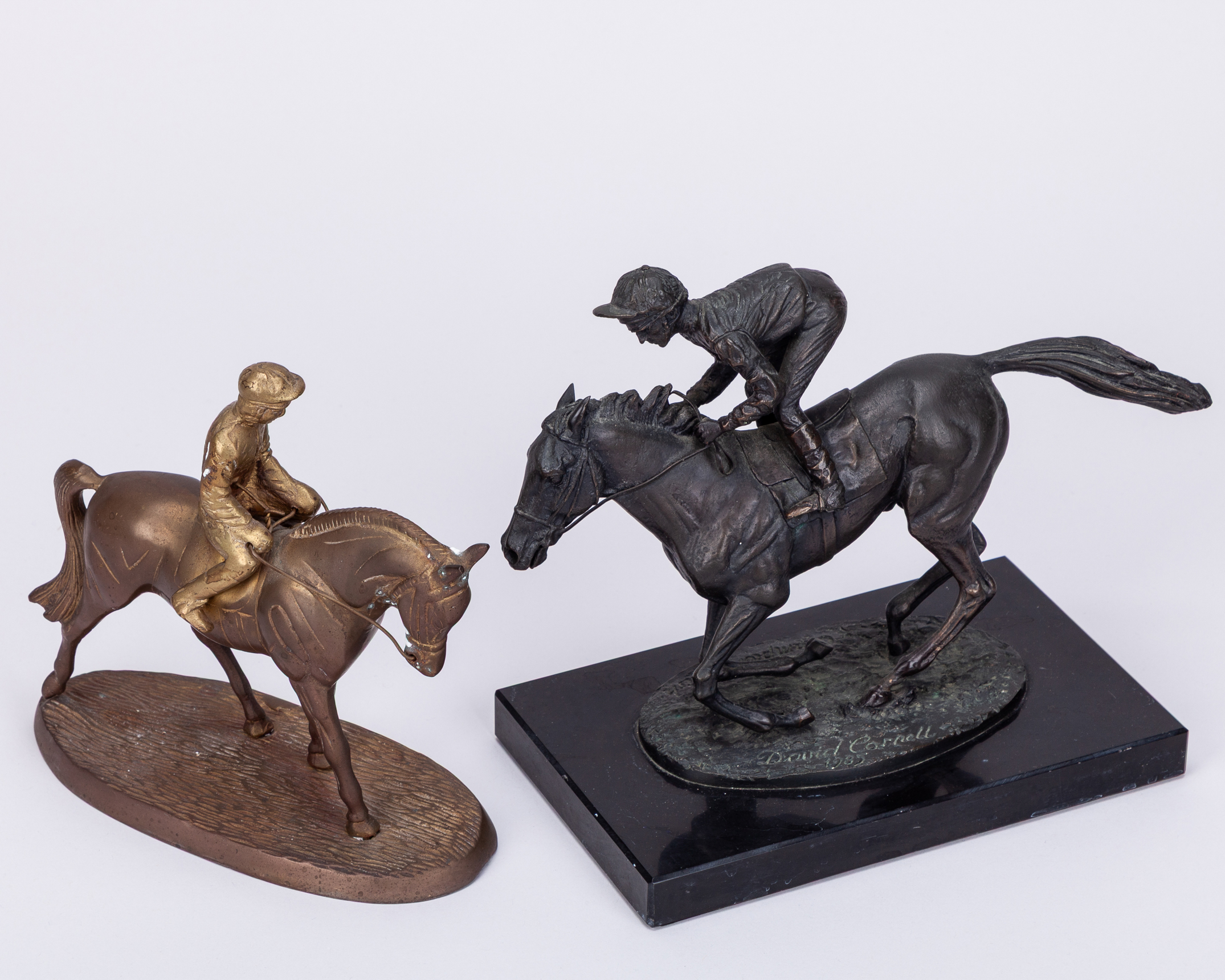 signed & dated 1985, produced at the time of Lester Piggott's retirement from race riding in 1985 and modelled as him riding Nijinksy, 20 by 19 by 12cm. good condition; sold together with an older gilt-metal model of a racehorse and jockey, areas of wear, 18 by 18cm., (2)
