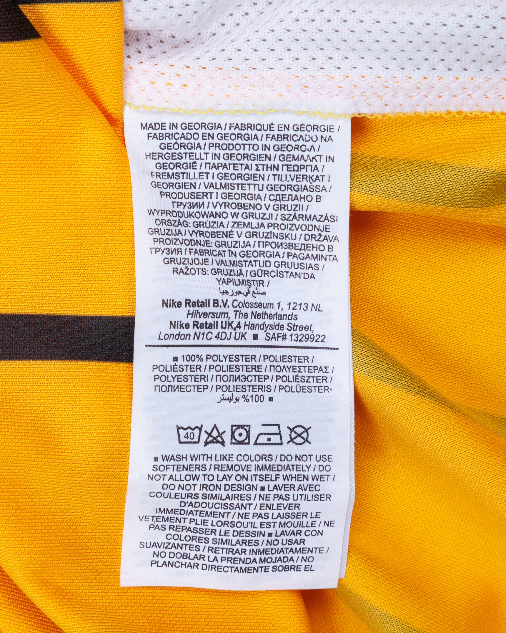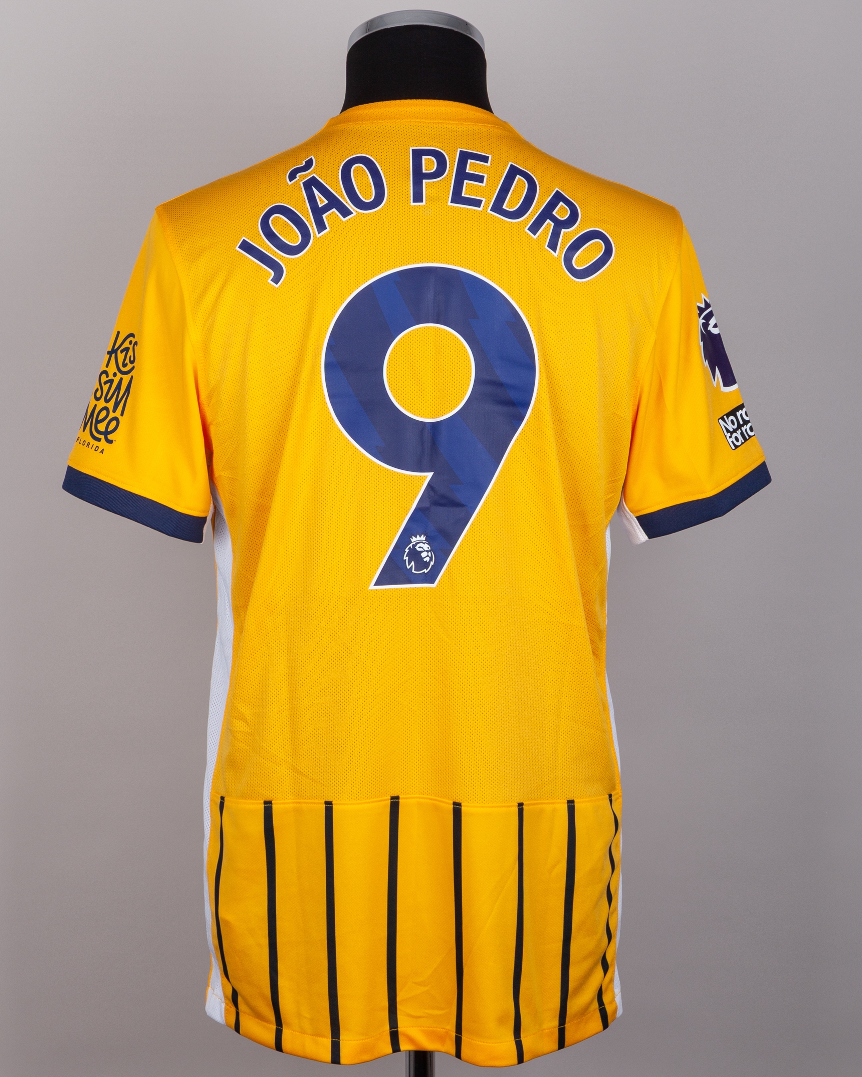 Joao Pedro yellow and blue No.9 Brighton & Hove Albion short-sleeved shirt, Nike, L, with crew-neck collar and embroidered badge inscribed BRIGHTON & HOVE ALBION, the reverse letter JOAO PEDRO, the right sleeve with Premier League flash