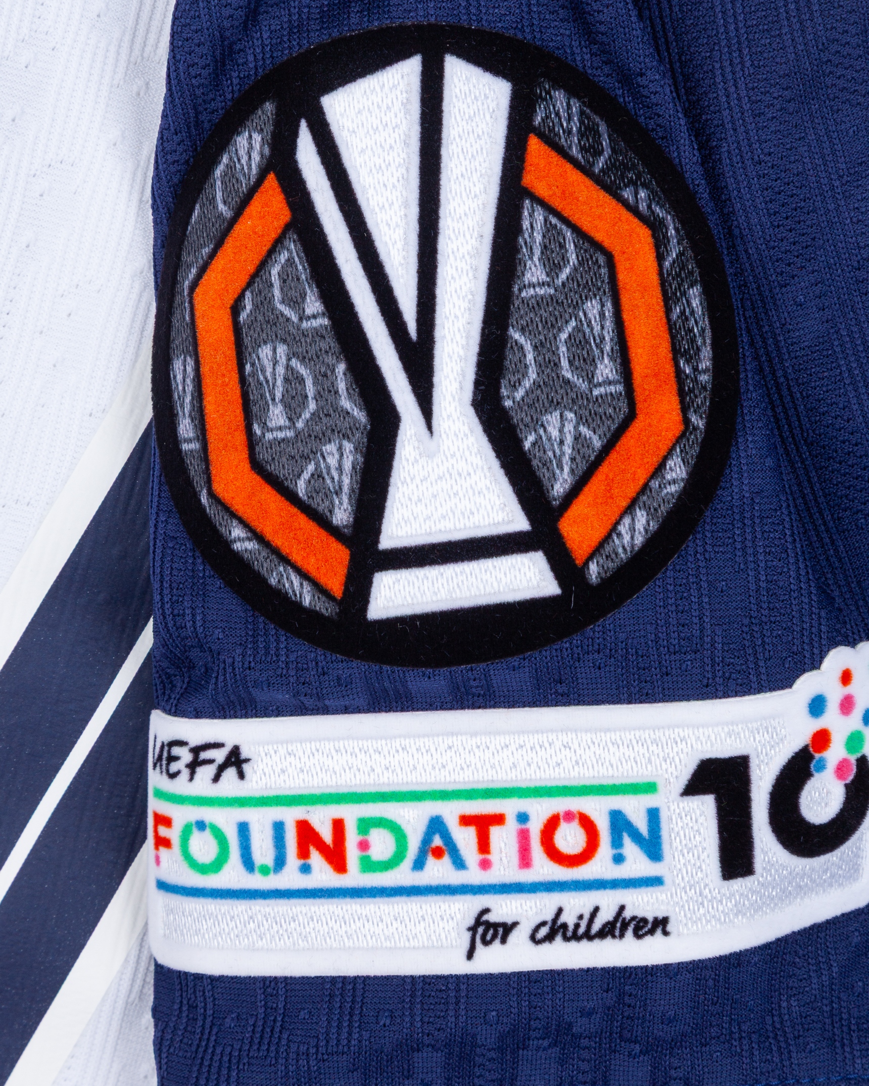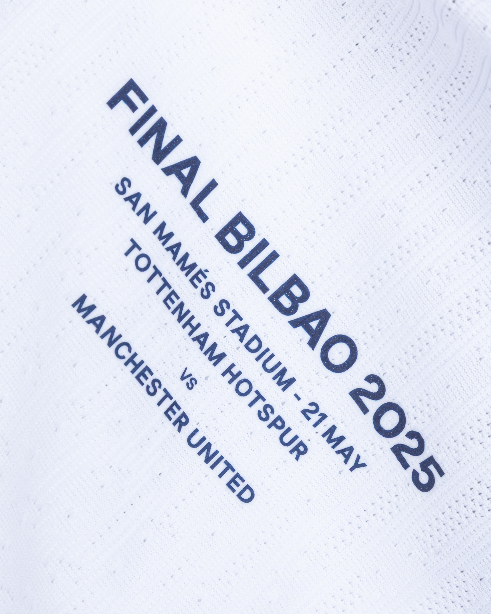 Son Heung-Min white and blue No.7 Tottenham Hotspur v. Manchester United UEFA Europa League match issued short-sleeved shirt, 2025, Nike, M, with crew-neck collar and printed badge, with FINAL BILBAO 2025 SAN MAMES STADIUM - 21 MAY TOTTENHAM HOTSPUT vs MANCHESTER UNITED decal, the reverse lettered son, the right sleeve with UEFA EUROPA LEAGUE UEFA Foundation for children 10 Years flashes