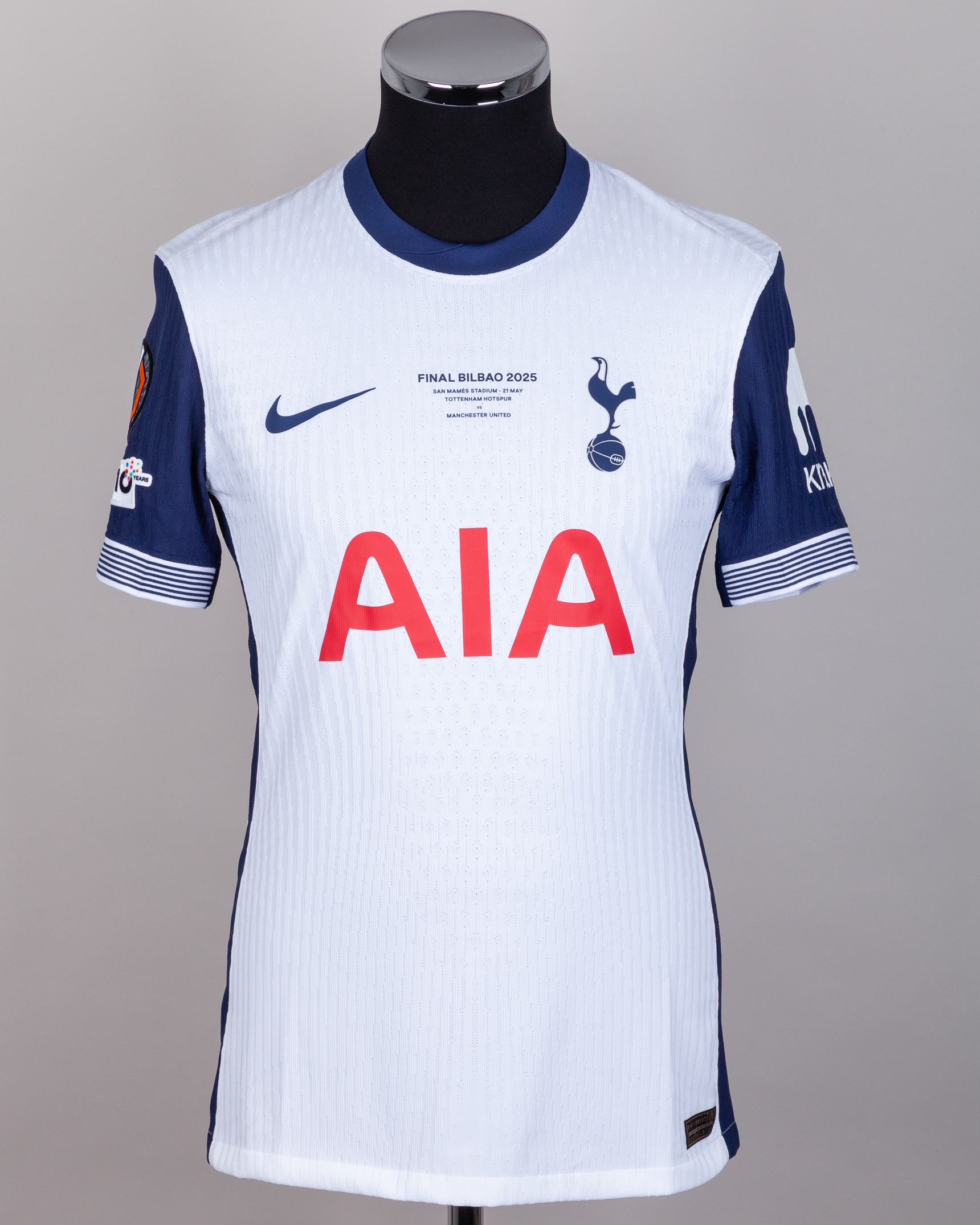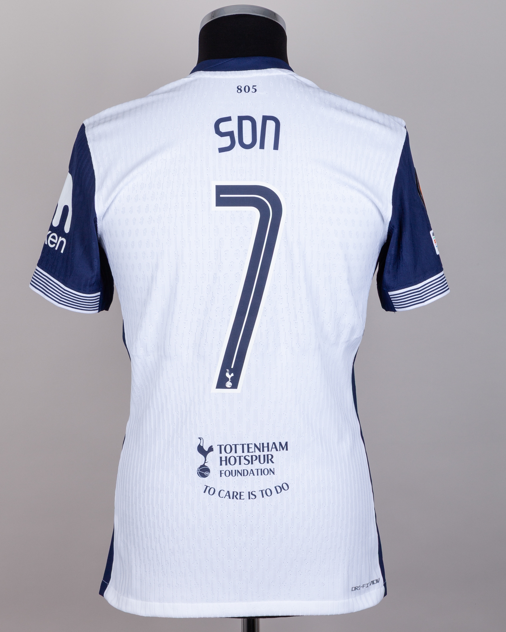 Son Heung-Min white and blue No.7 Tottenham Hotspur Europa League match issued shirt, 2025