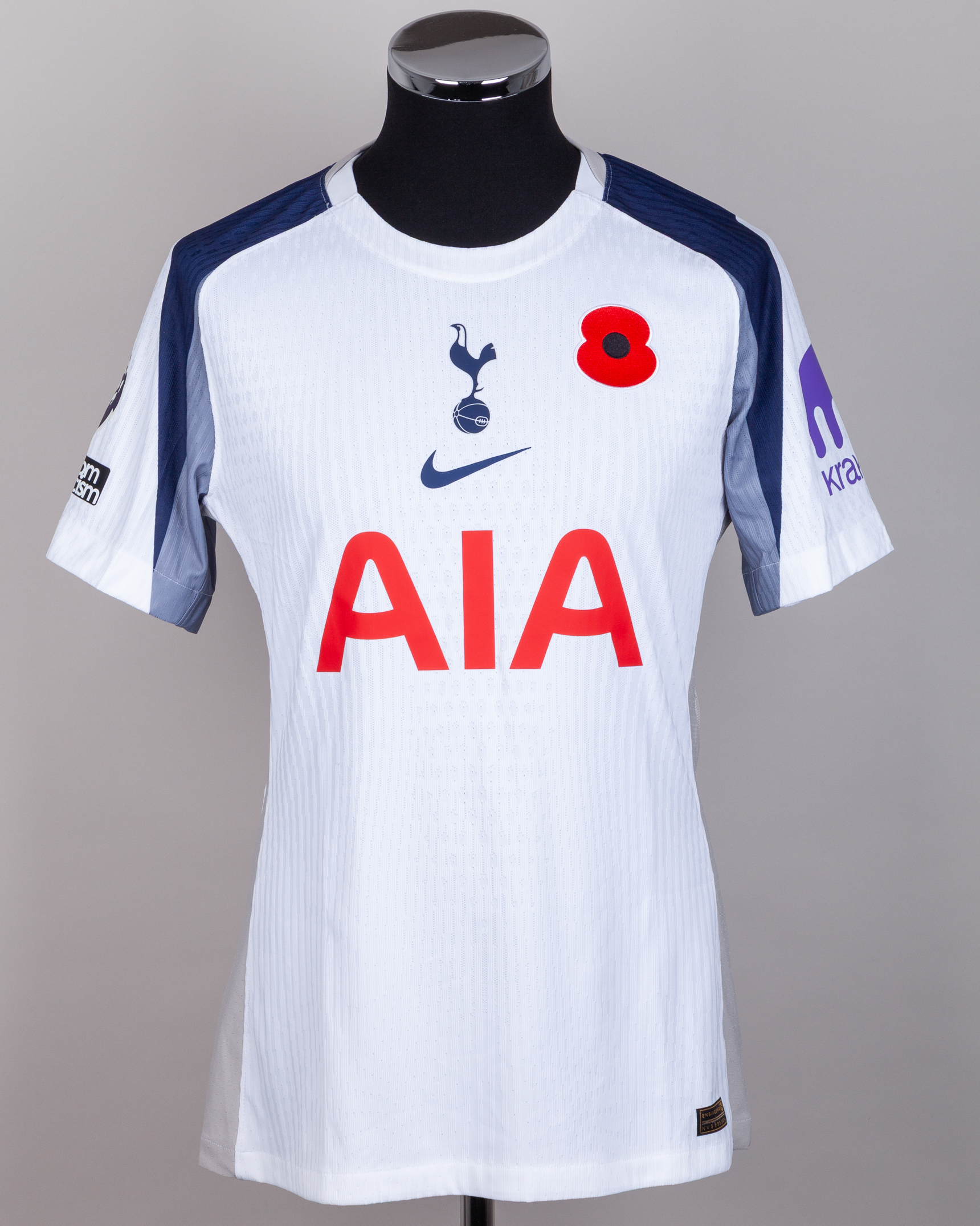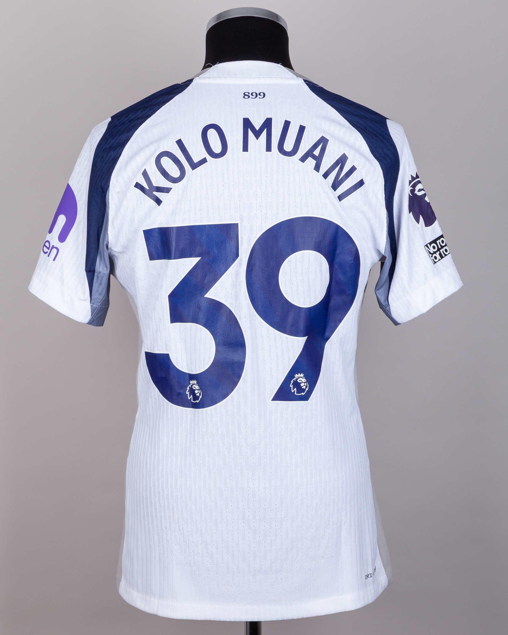 Kolo Muani white and blue No.39 Tottenham Hotspur v. Manchester United match issued short-sleeved shirt, Nike, L, with crew-neck collar and printed badge, with embroidered poppy, the reverse lettered KOLO MUANI, the right sleeve with Premier League flash