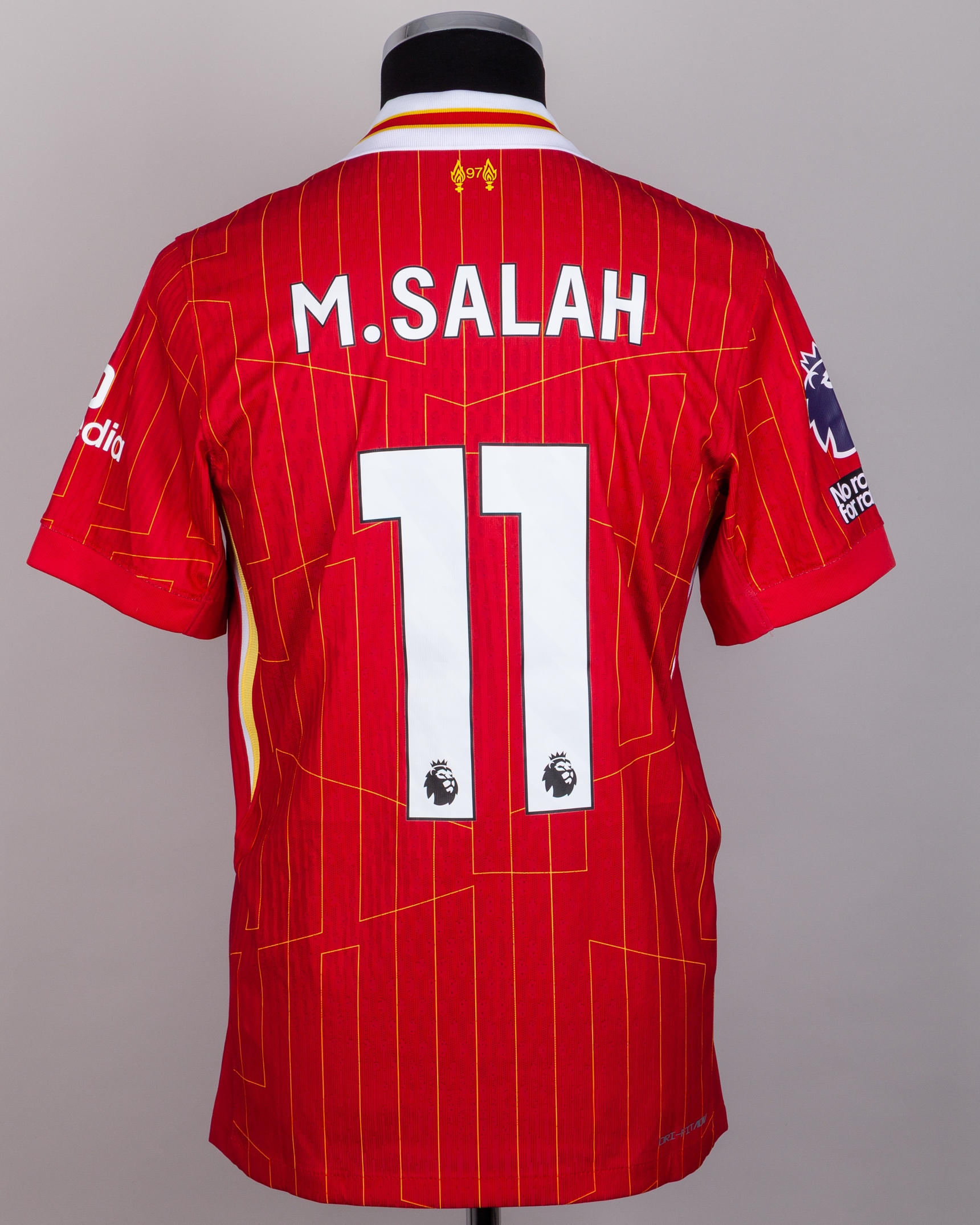 Mohammad Salah red and yellow red No.11 Liverpool match issued short-sleeved shirt, Nike, M, with crew-neck collar and printed badge, the reverse lettered SALAH, the right sleeve with Premier League flash