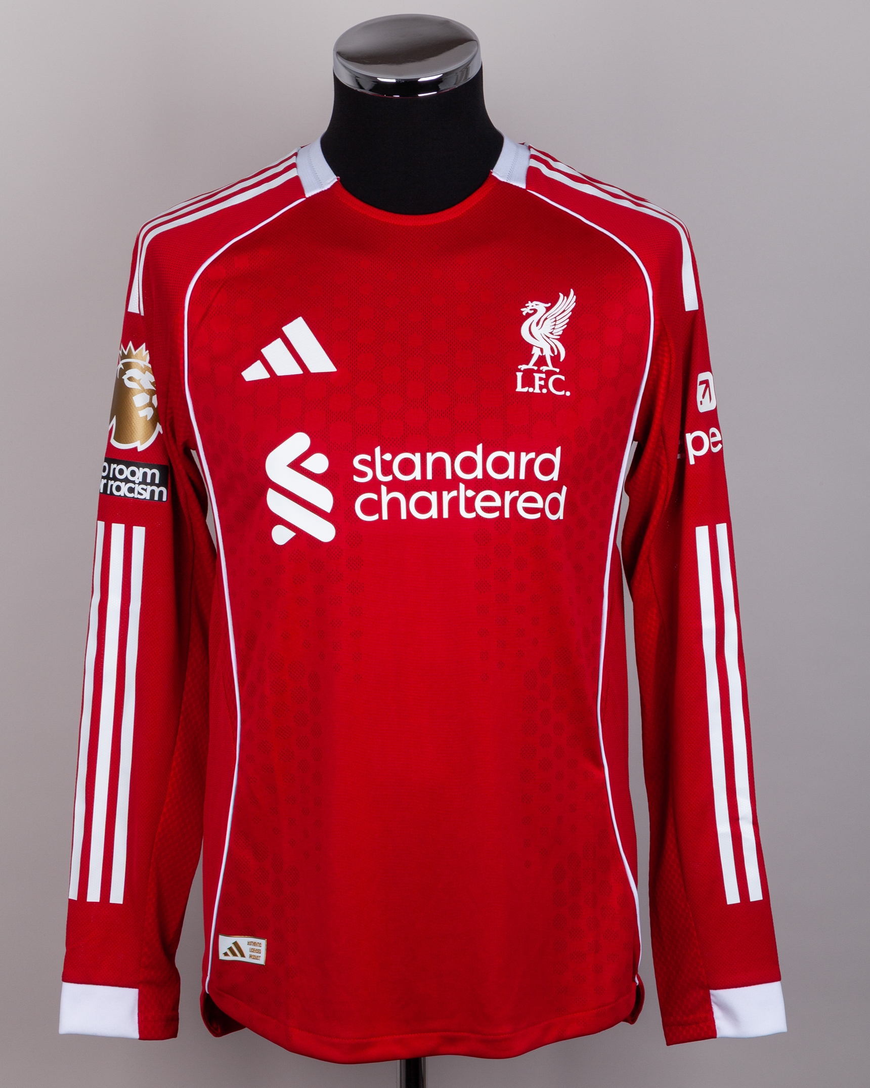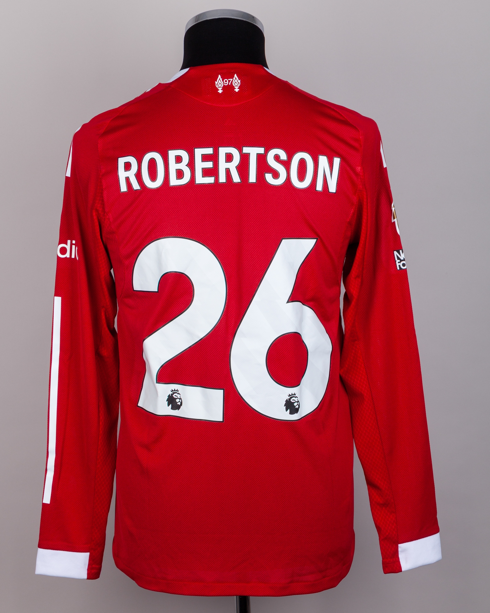 Andy Robertson red No.26 Liverpool match issued long-sleeved shirt, Adidas, M, with crew-neck collar and printed badge, the reverse lettered ROBERTSON, the right sleeve with Premier League Champions flash