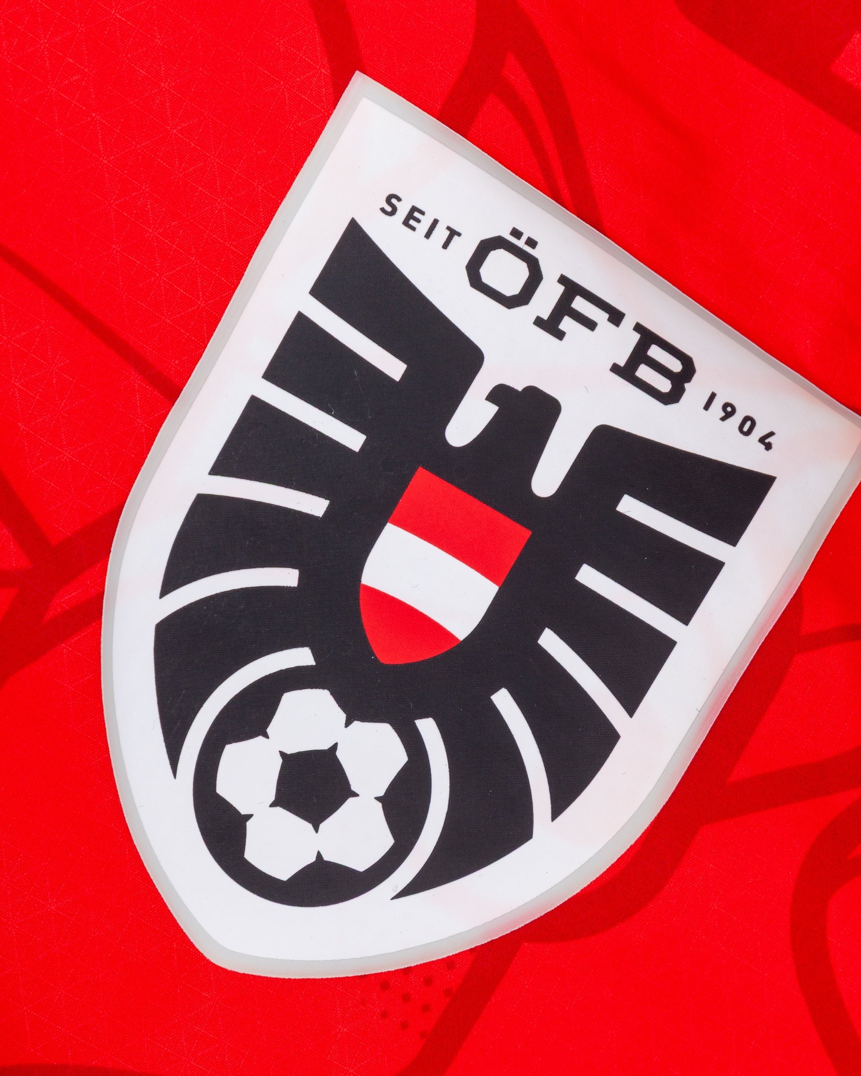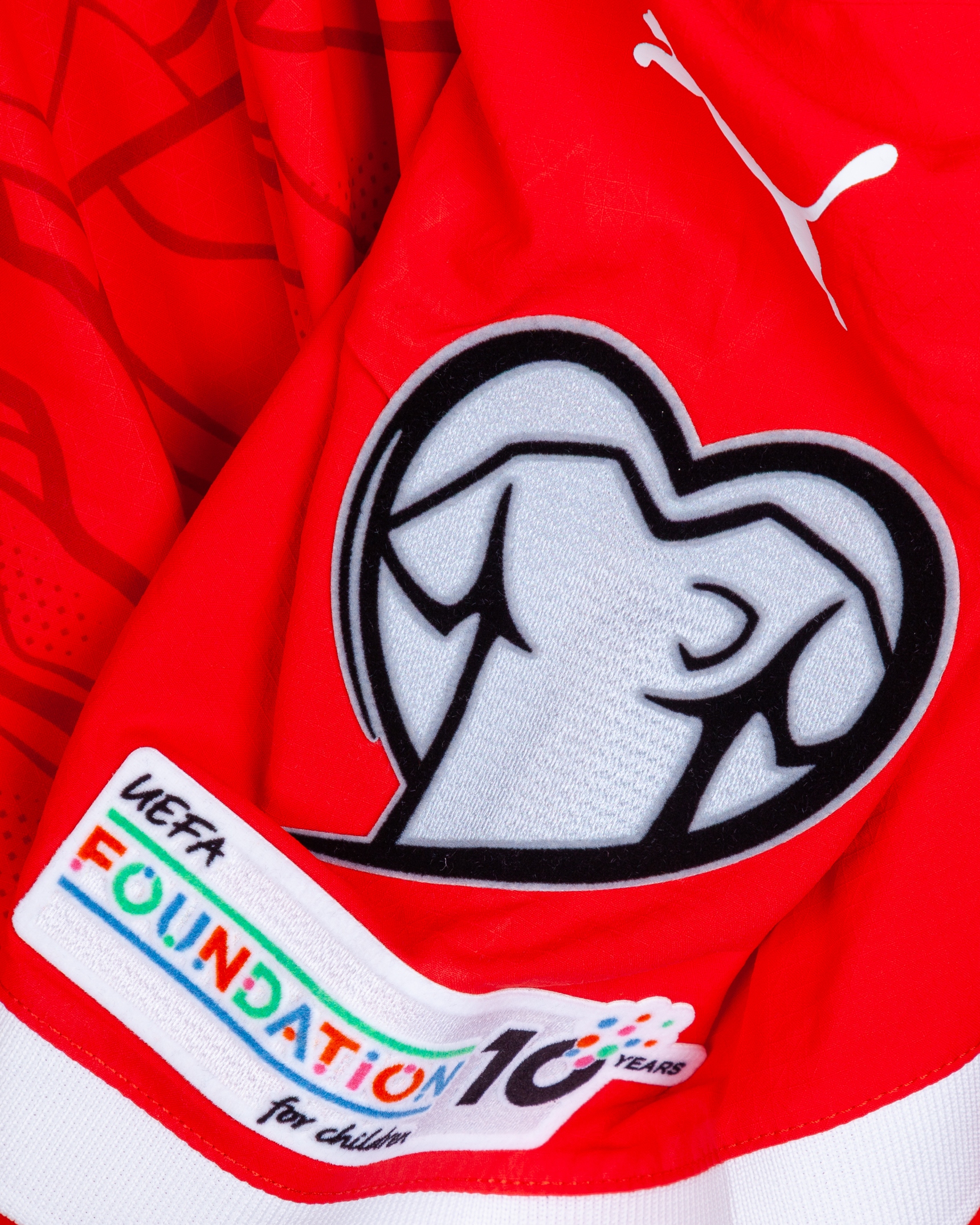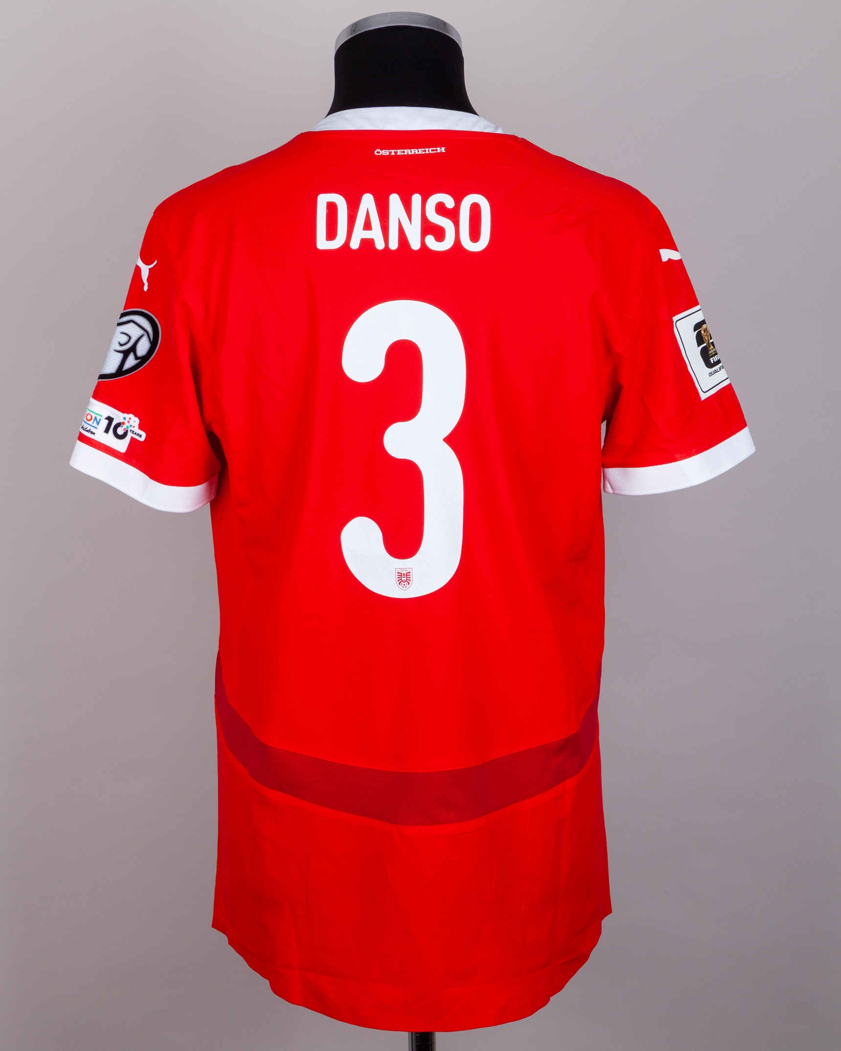 Kevin Danso red and white No.3 Austria short-sleeved shirt, 2024, Puma, size XL, with country emblem, FIFA QUALIFIERS and UEFA sleeve badges, reverse lettered DANSO
