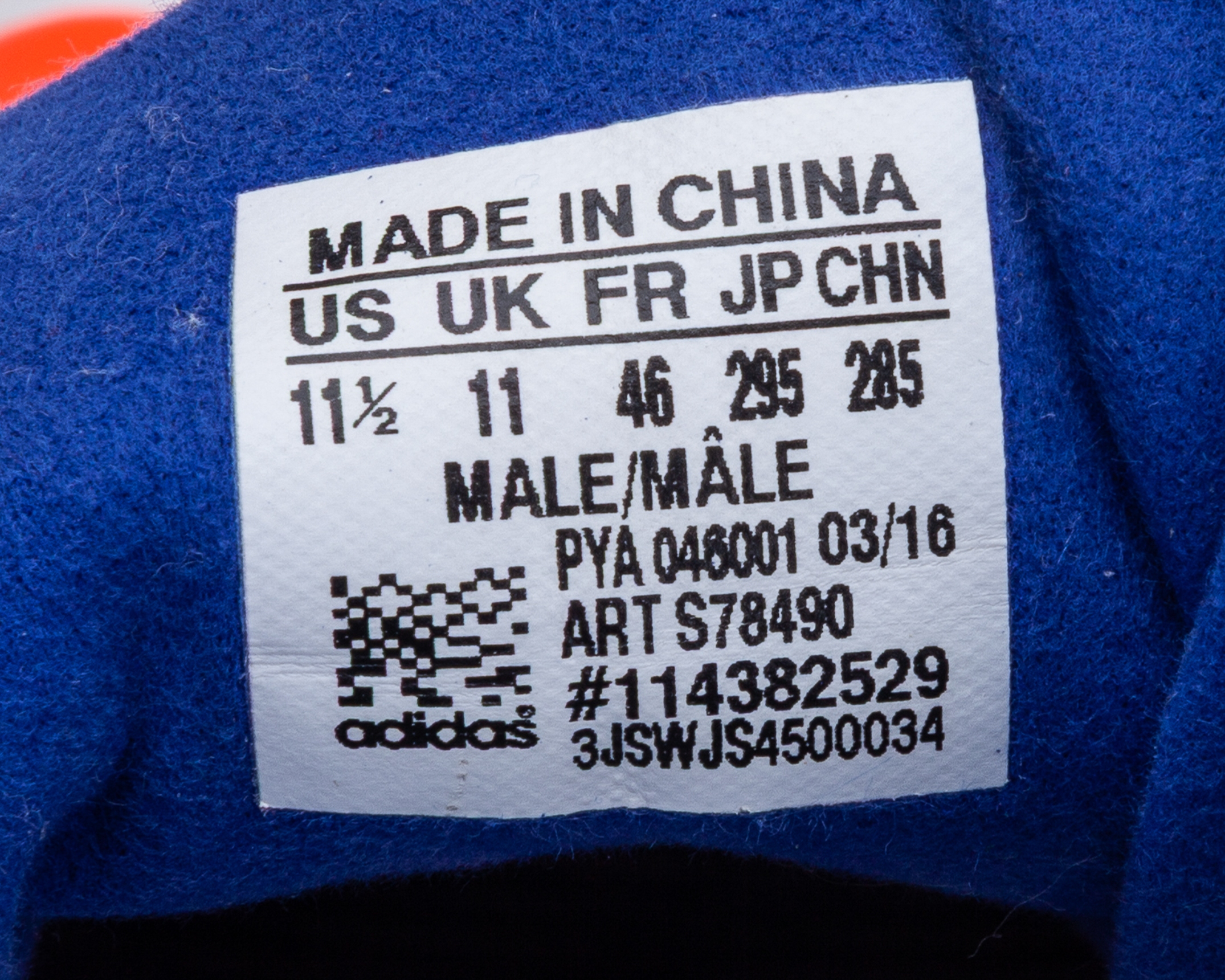 James Anderson blue, white and orange Adidas Adipower Lancashire County Cricket match worn autographed spikes, UK11, with JA (England flag) decal, with signs of wear and COA from LCCC Foundation