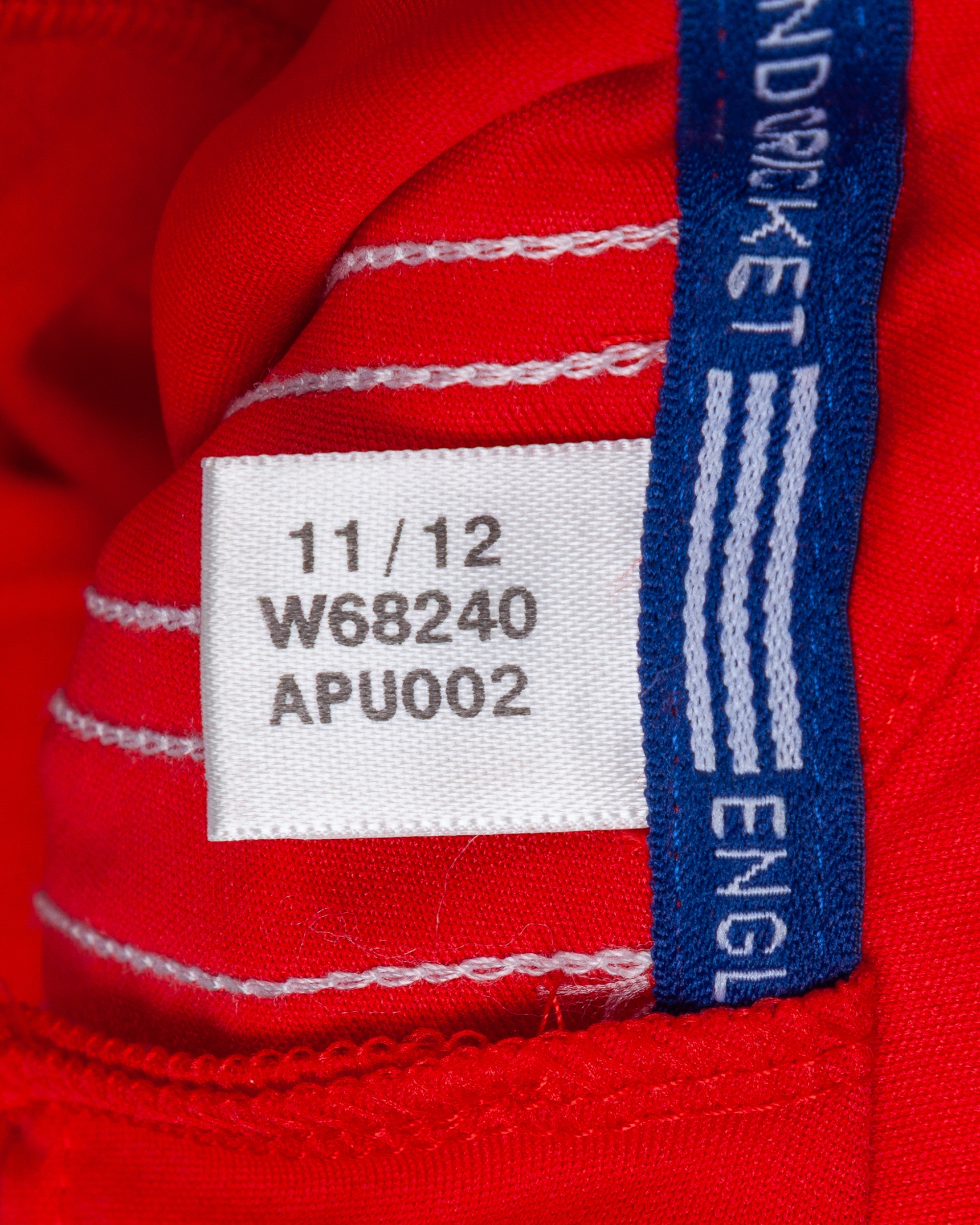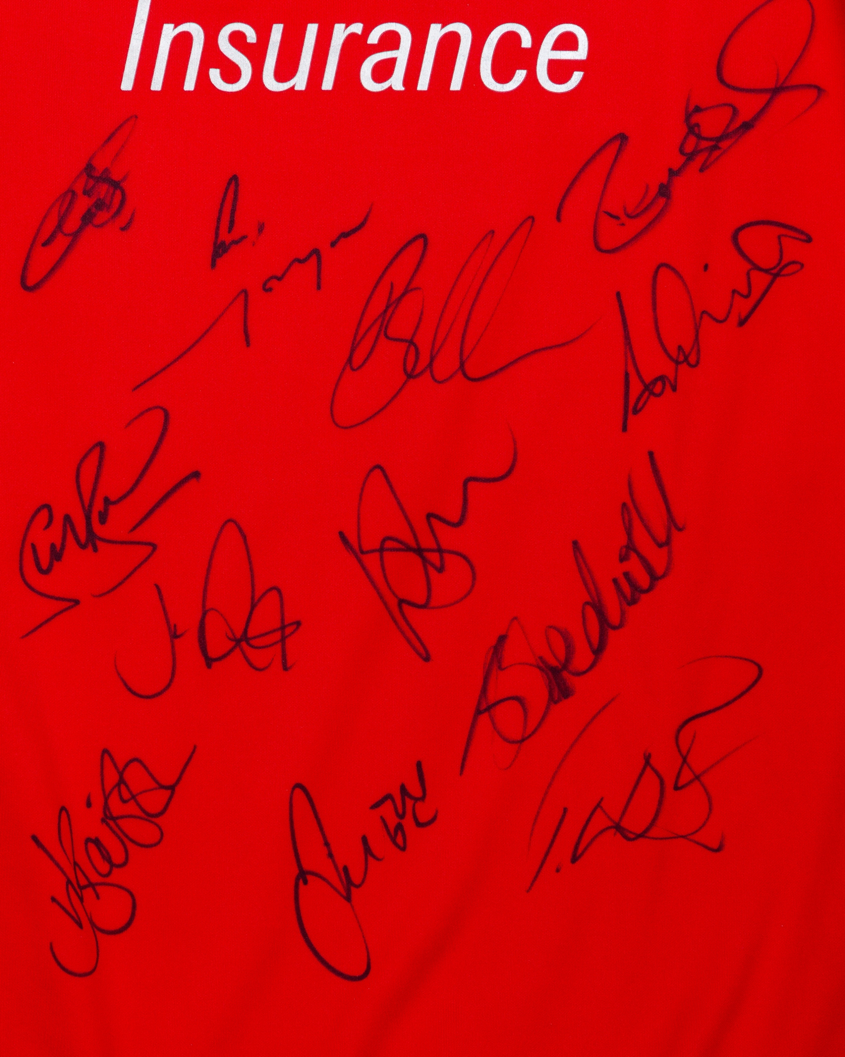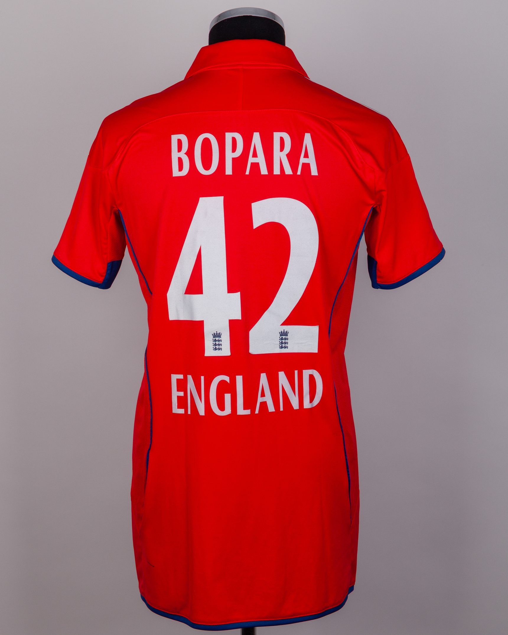 Ravi Bopara red No.42 autographed short-sleeved ODI cricket shirt, 2013, Adidas, L40, with zip-up collar and embroidered badge, the reverse lettered BOPARA, with thirteen autographs on the front including Stuart Broad, Joe Root, Jonny Bairstow, Steven Tredwell and Alistair Cook etc., believed to be produced for the 2013 ICC Champions Trophy