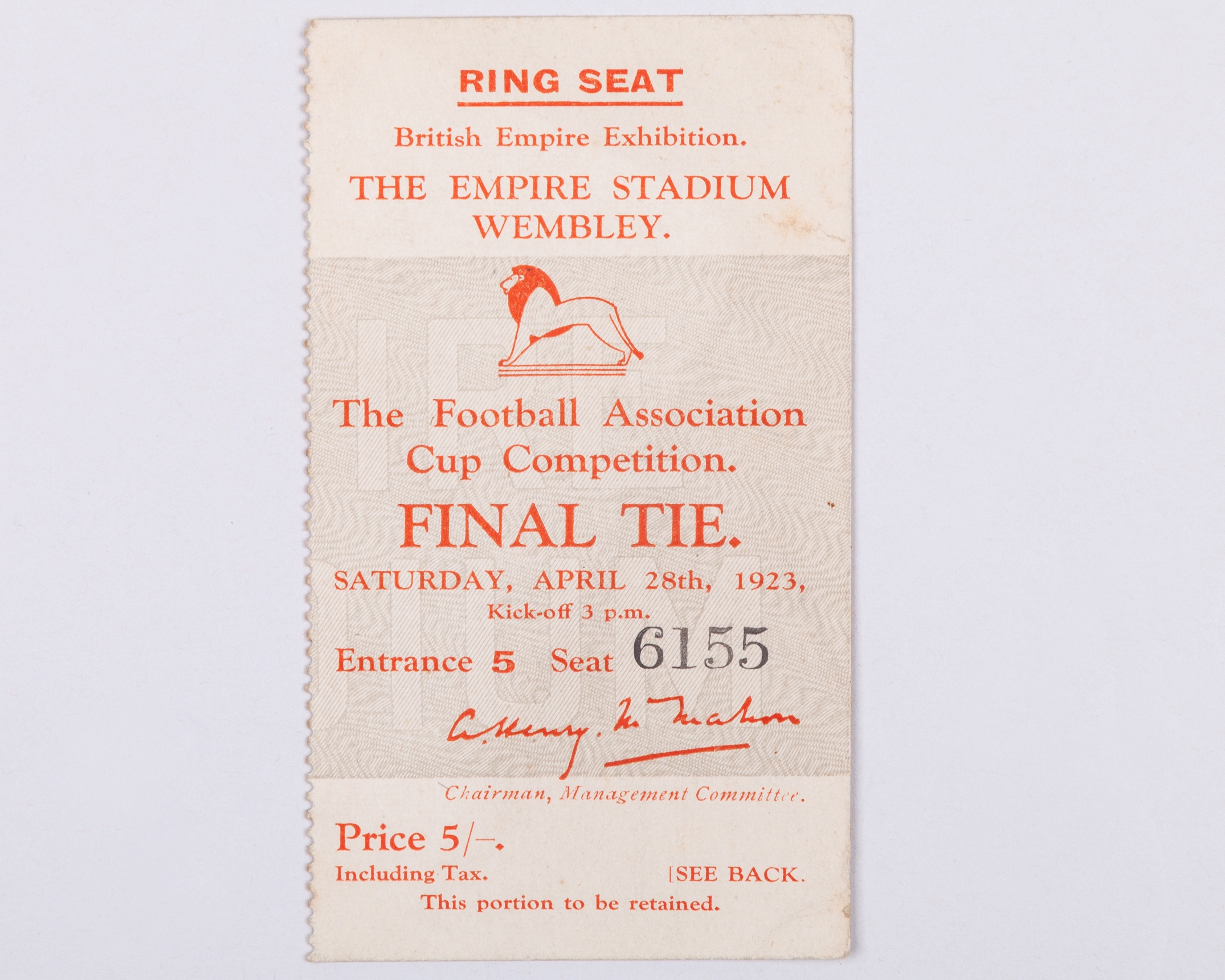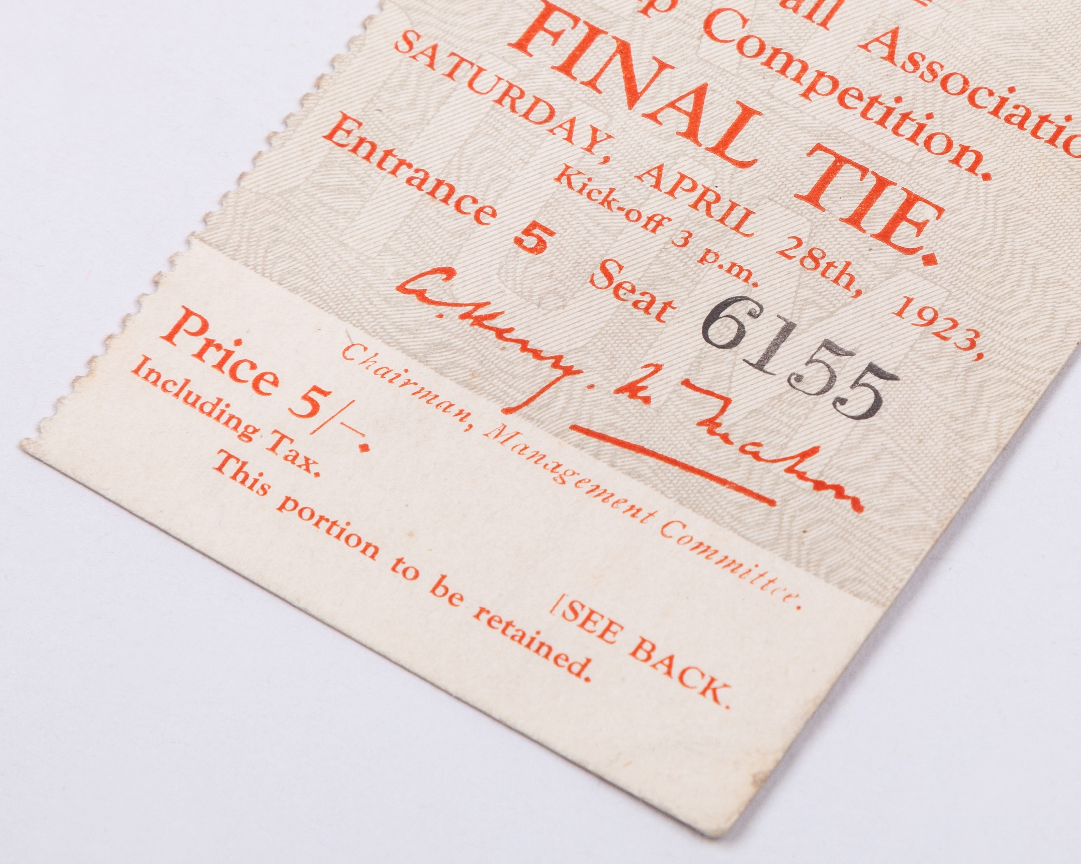 Scarce 1923 F.A. Cup Final ticket stub for West Ham United v Bolton Wanderers, 28th April 1923, No.6155